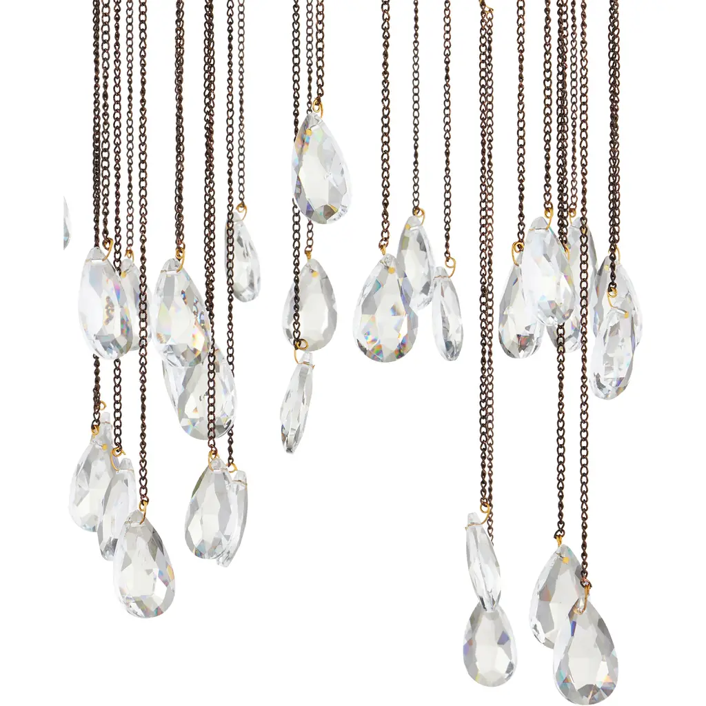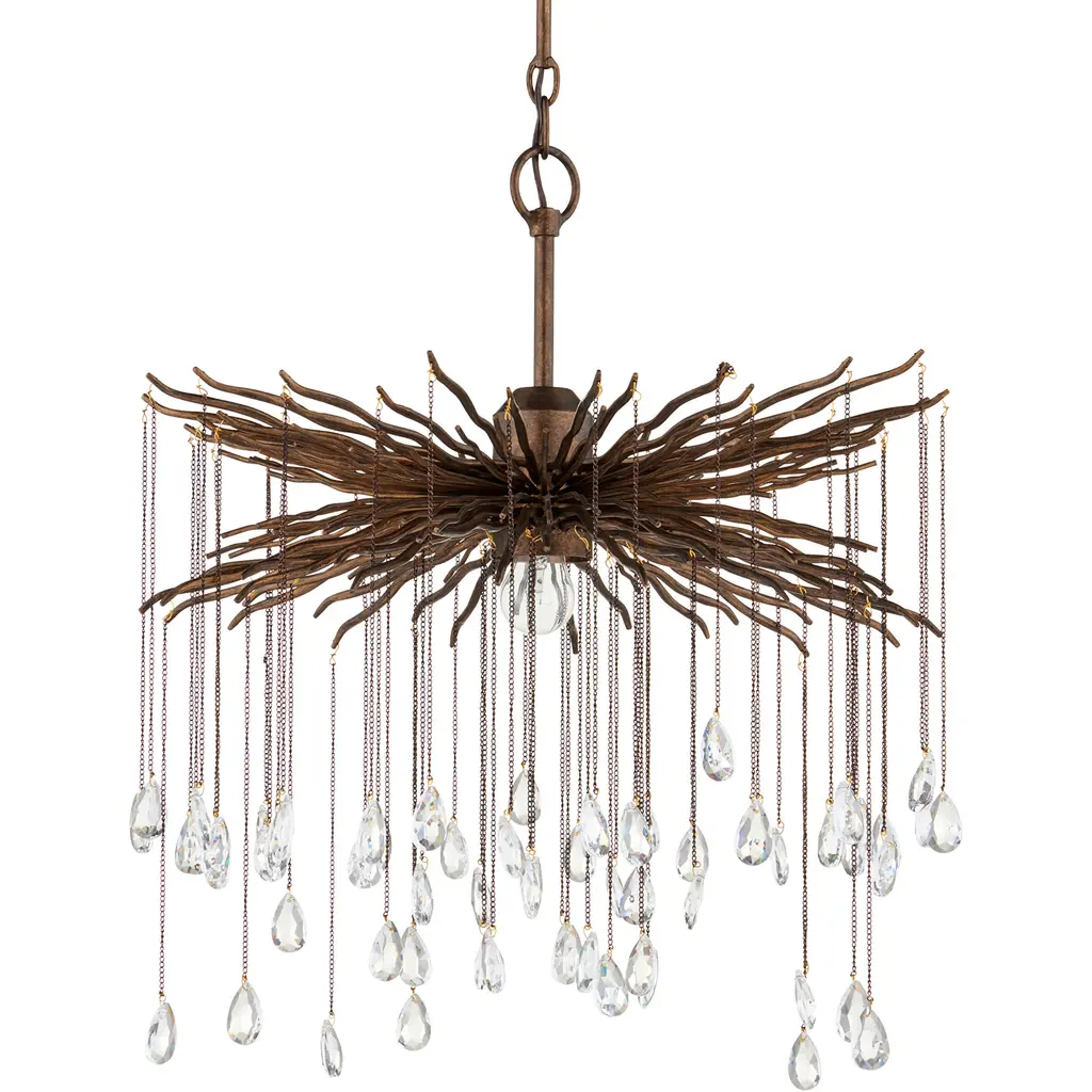 The embodiment of dark beauty, the small version of the Fen Chandelier draws upon the allure and mysterious unknown of mossy wetlands for inspiration. Cupertino wrought iron spokes stretch outward like gnarled branches, each one supporting a delicate chain adorned with a single crystal bead, like drops of dew on a bramble bush. The brutalist design of this six-light fixture is both innovative and irresistible. This chandelier also comes in a larger version.