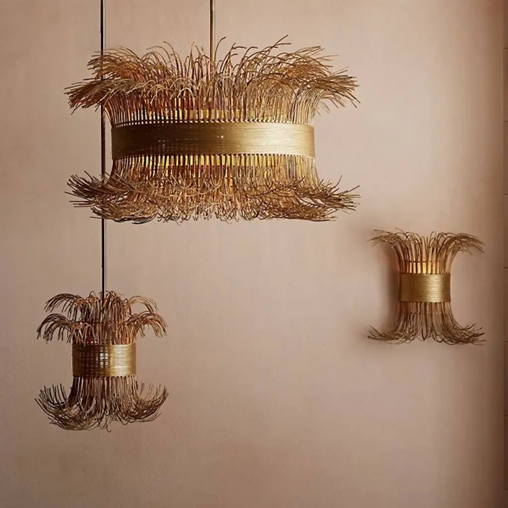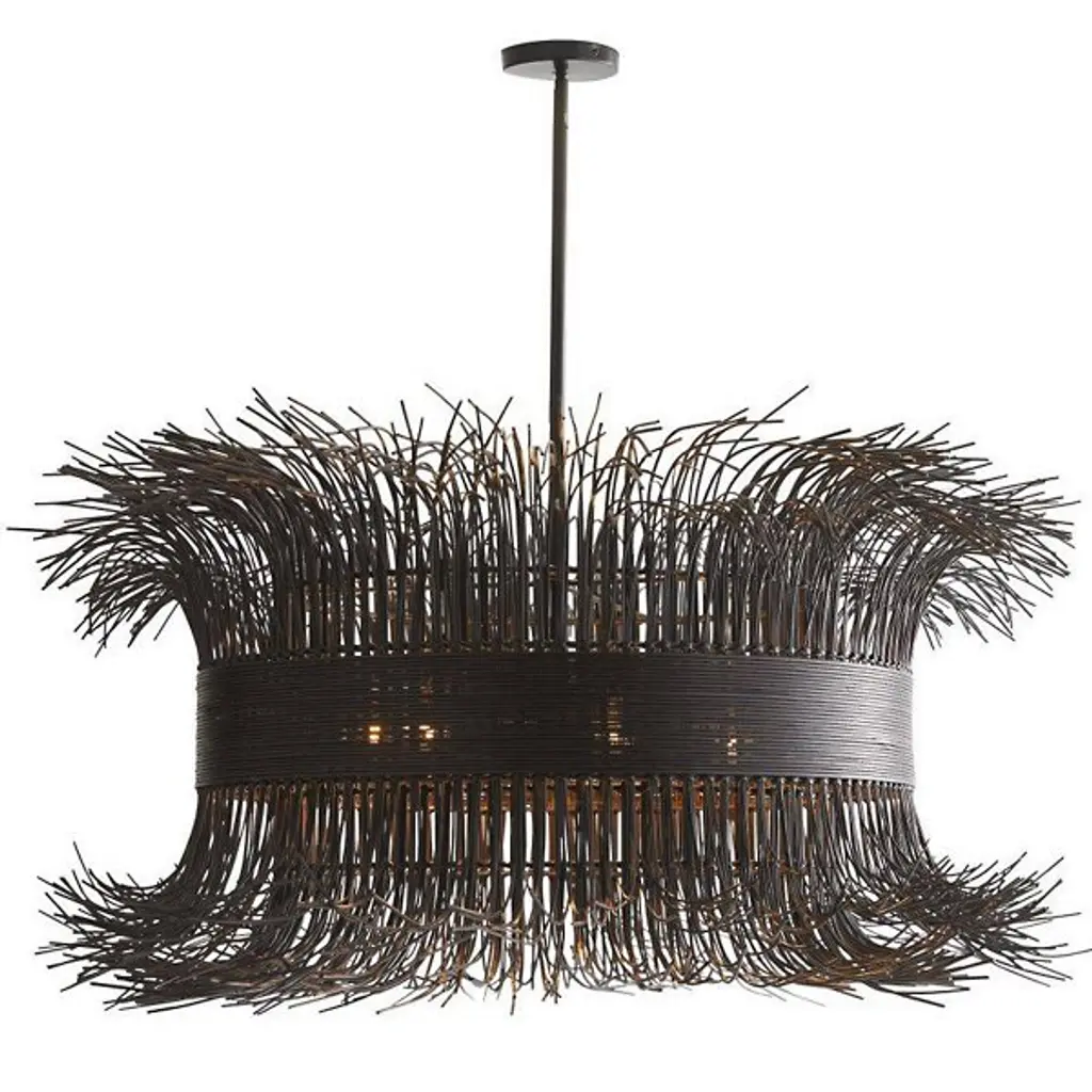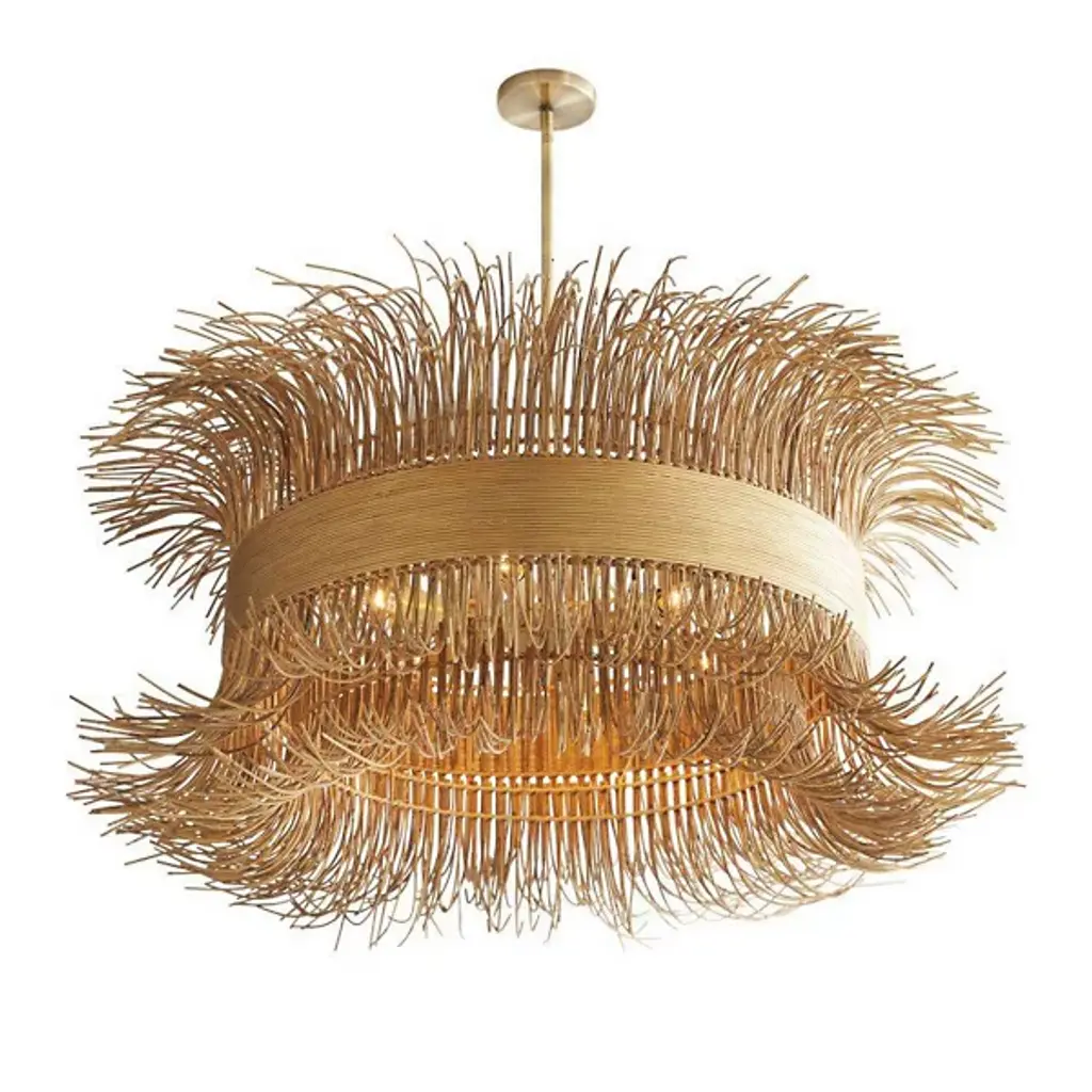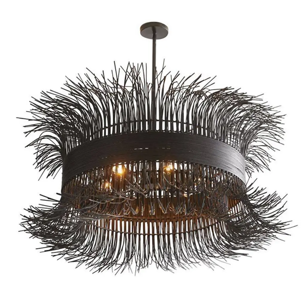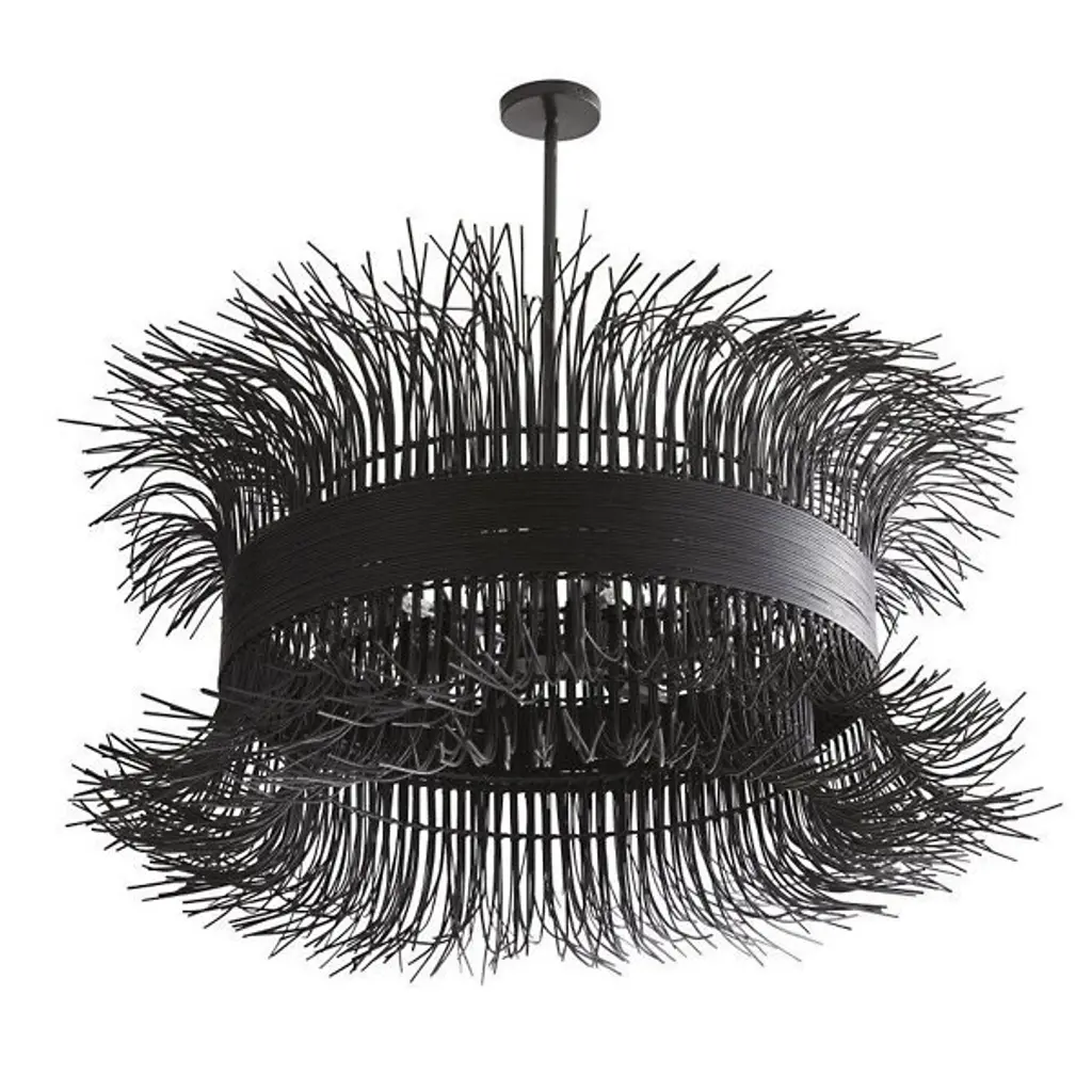 The Filamento Chandelier from Arteriors brings designer Laura Kirar's vision to life through a sculptural rattan composition. Free-flowing strands create a lively figure reminiscent of wheat fields in motion, while structured banding provides essential stability. The natural material takes on unexpected sophistication through its metallic finish, creating dramatic shadows when illuminated. This chandelier transforms ordinary spaces into extraordinary ones, drawing the eye upward and outward with its organic energy. Its strong presence works particularly well in dining settings where its distinctive form becomes the center of attention.