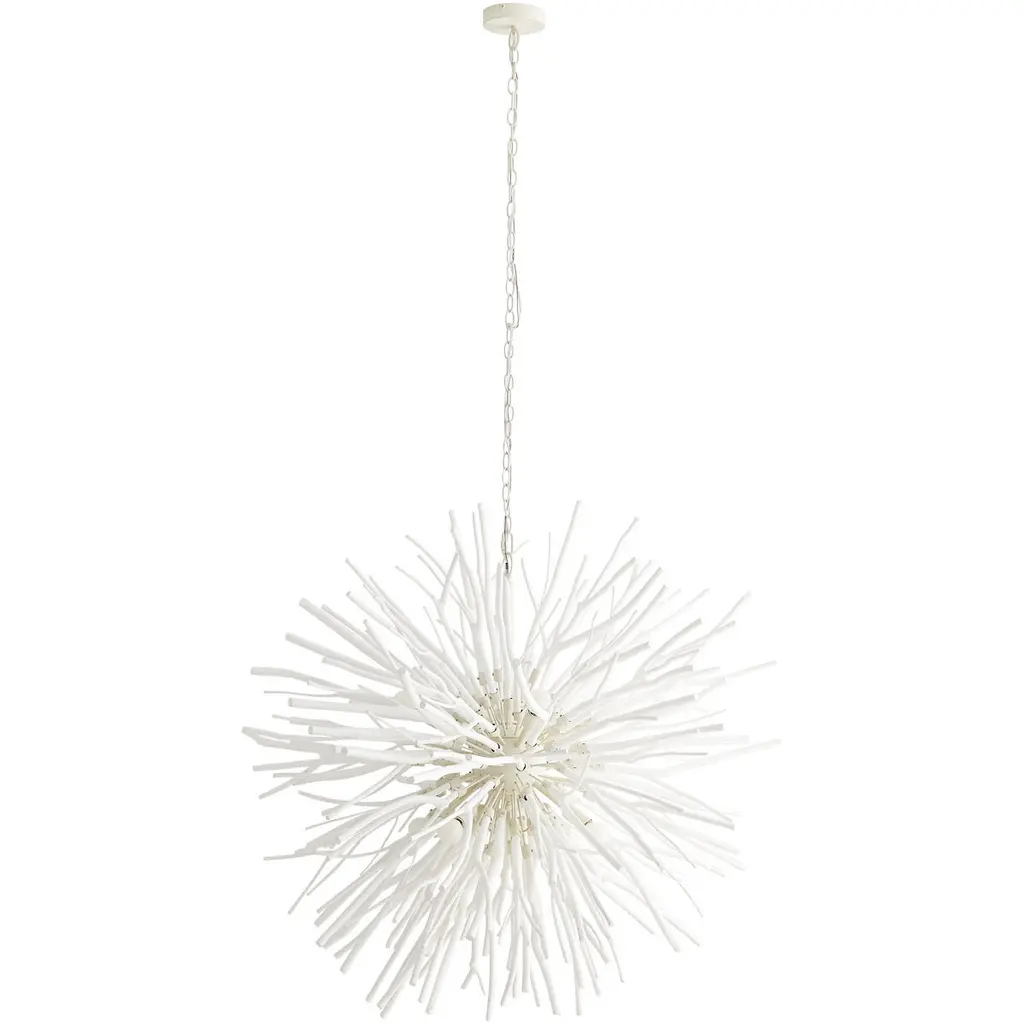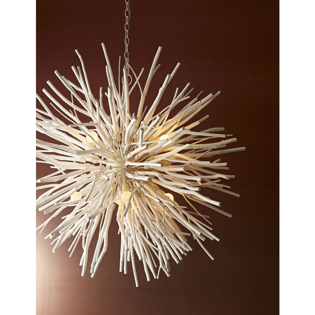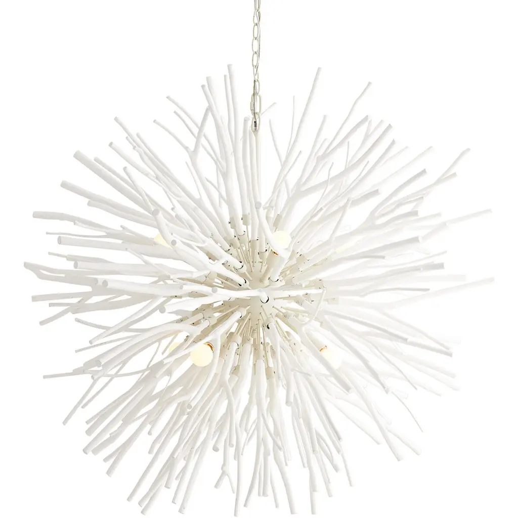 Take what you know about traditional starburst design and leave it behind. The Finch explores a more organic approach to lighting with its foundation of unconforming branches in a white wash finish that surround the concealed white steel frame. Each of the eight lights seemingly blend into the structure until they bring it to life when in use. Finish may vary. Also available in natural (89560).