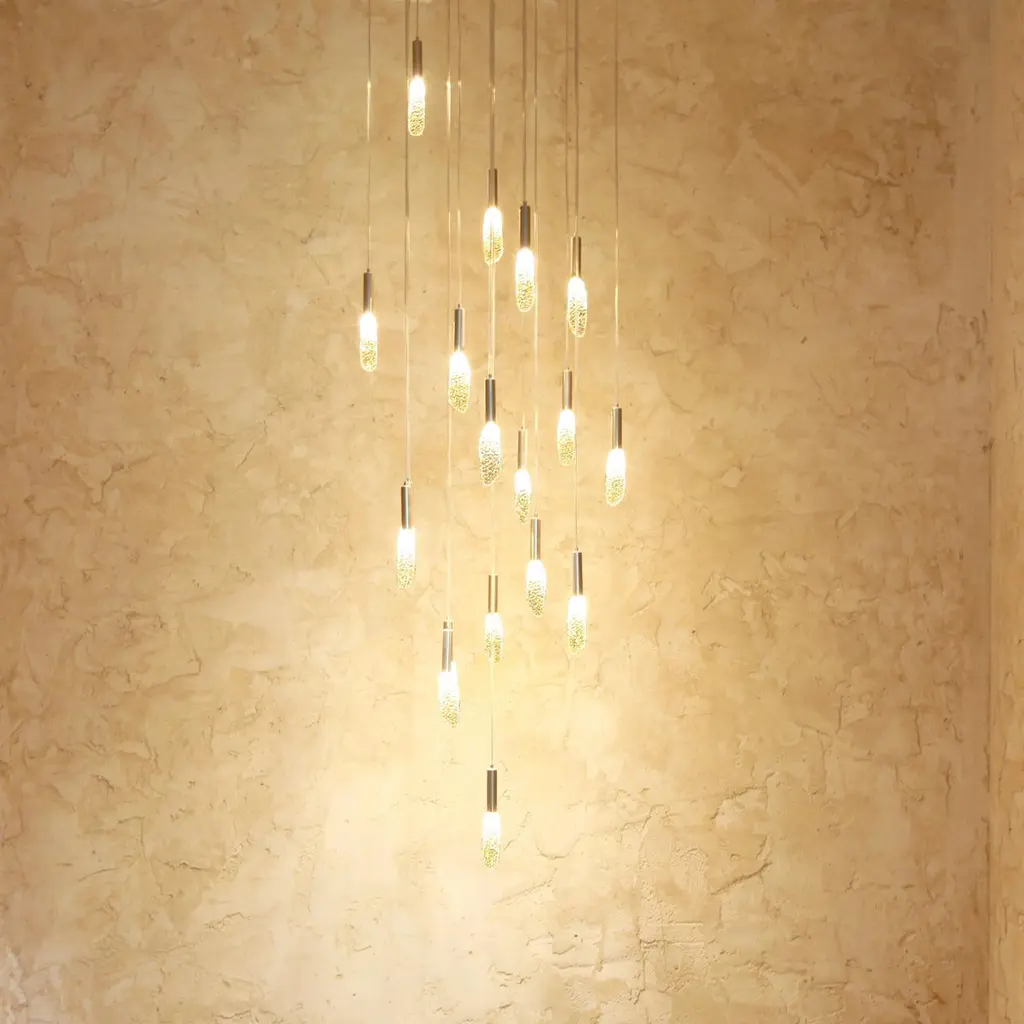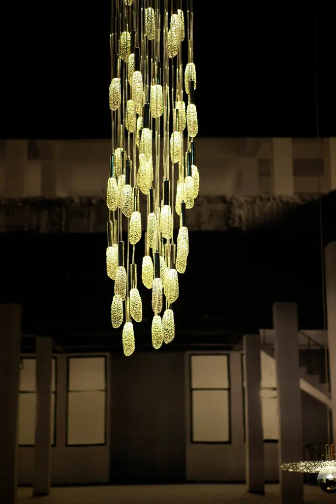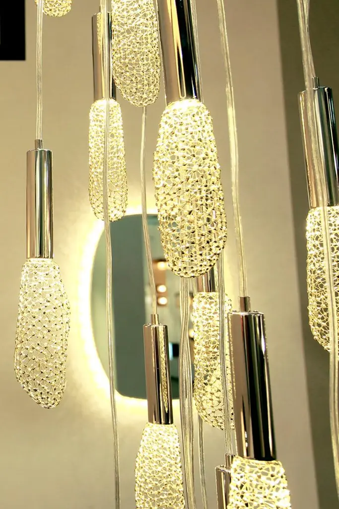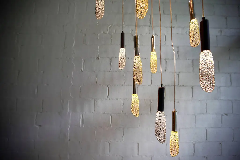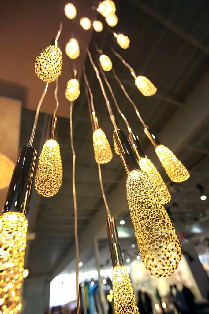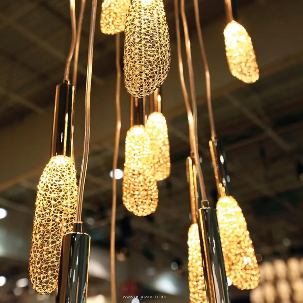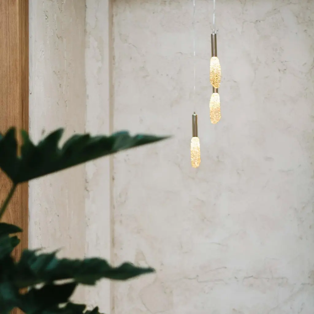 Firmament series, where multifaceted jewel drop-like pieces refract and reflect the light from the source to create a sophisticated and luxurious aura. Each light diffuser is formed freestyle in hand before being coated in gold and the magical light diffusion is partly explained by the metal coating on.Firmament-1 (gold) pendant lights Diffuser material : Handworked steel + goldBase Material : Hand finished stainless steel with nickelSize for each piece 1.5 in Diameter x 10 in H or 45 mm Diameter x 255 mm H Light source : LED G9 3W included.Please note that due to the handmade nature of our products, slight variations in size may occur compared to the tear sheet. Additionally, colours may change over time and with usage.
