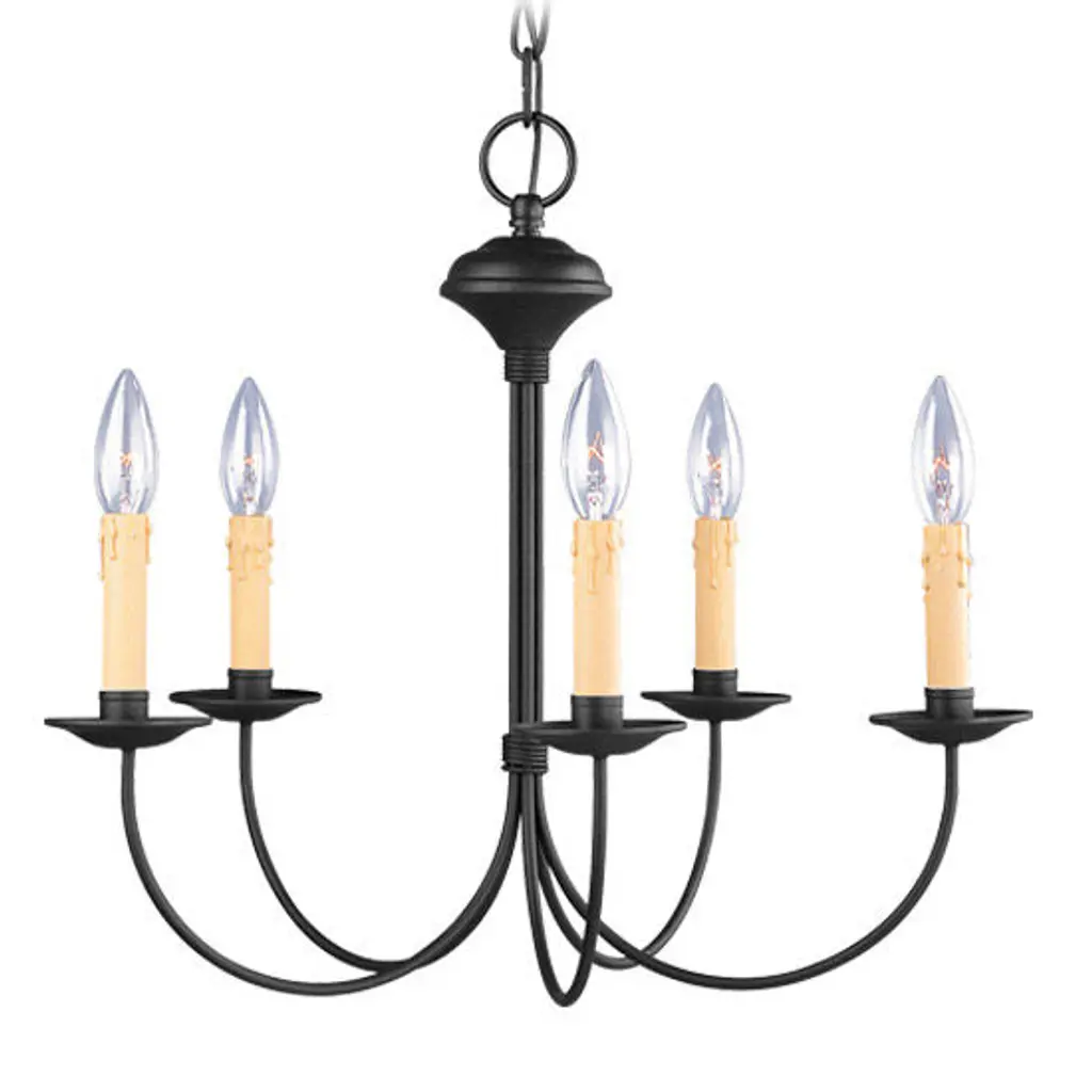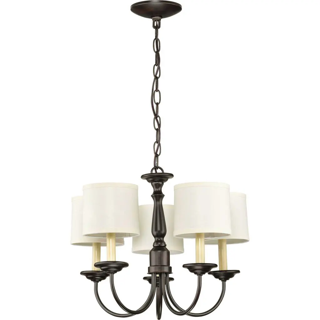 This simple, classic five-light chandelier is popular in the vintage farmhouse inspired designs. Ivory candle covers complete the look. Antique Bronze finish.