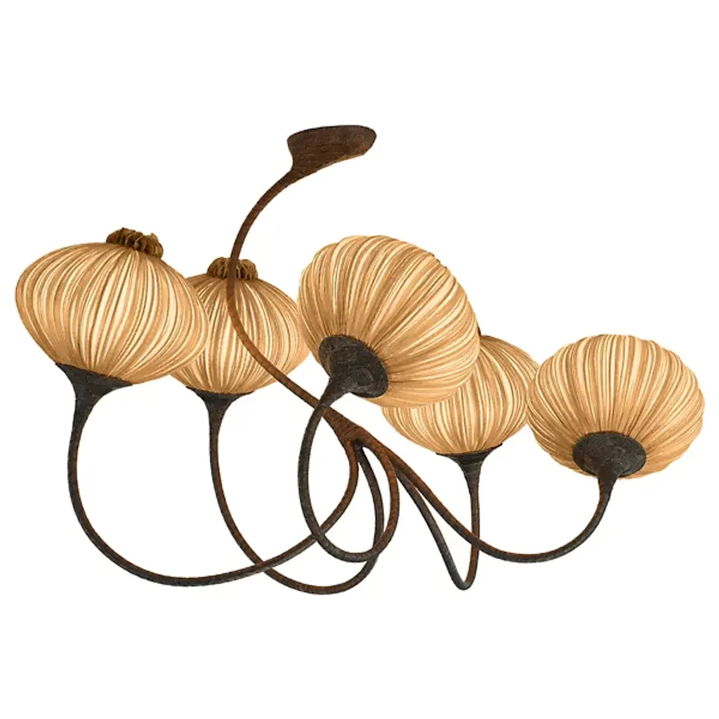 The Five Palms Chandelier from Aqua Creations exudes vitality and playfulness, drawing inspiration from nature’s organic forms. Each piece is handcrafted by artisans in an Israeli studio, featuring curving, linear branches of hand-bent metal tubing that support bulb-shaped silk shades. Each shade is hand-arranged and treated for durability, ensuring the chandelier’s longevity. This design transforms the bright light into something more restrained and lifelike, creating a captivating play of warm radiance and shadowed accents.