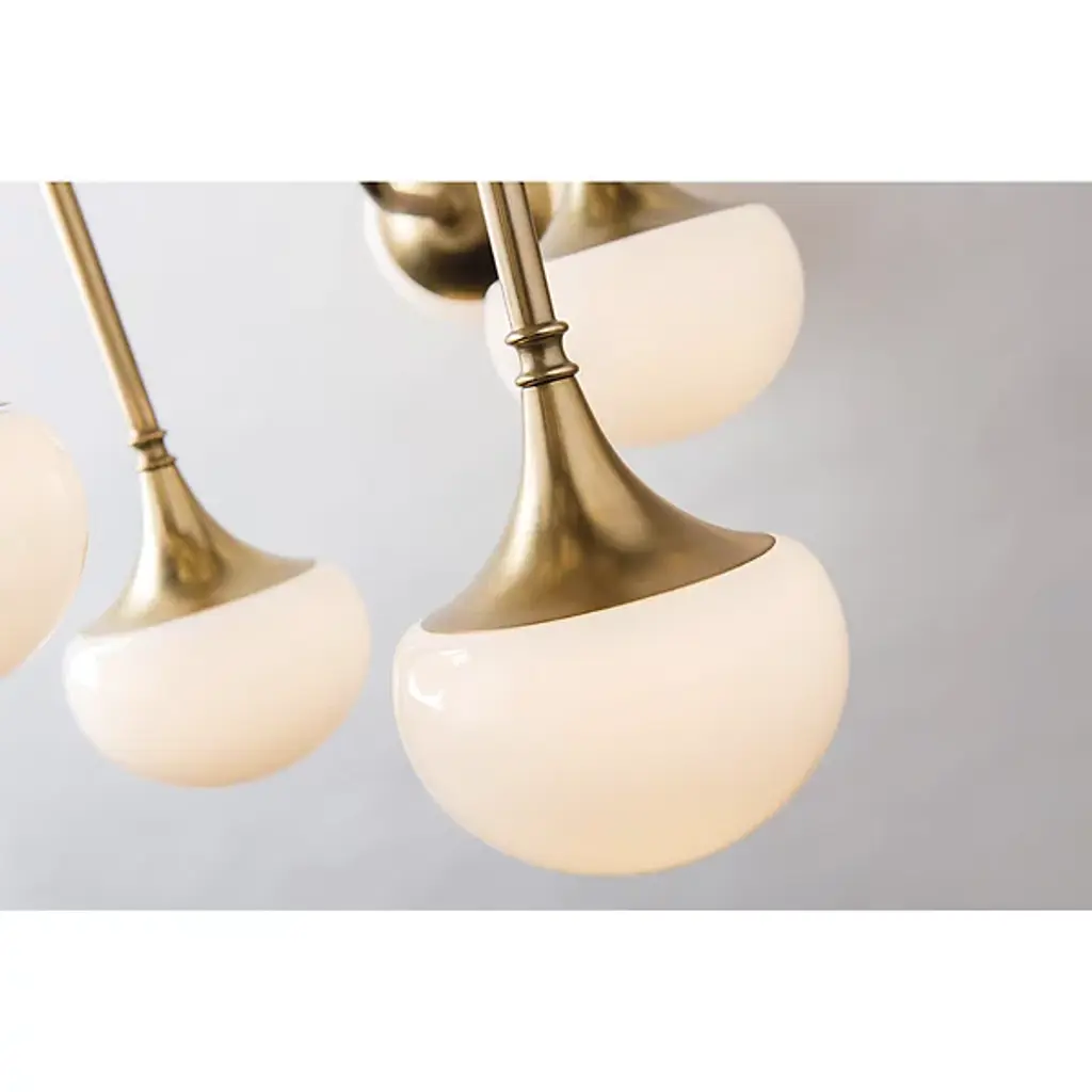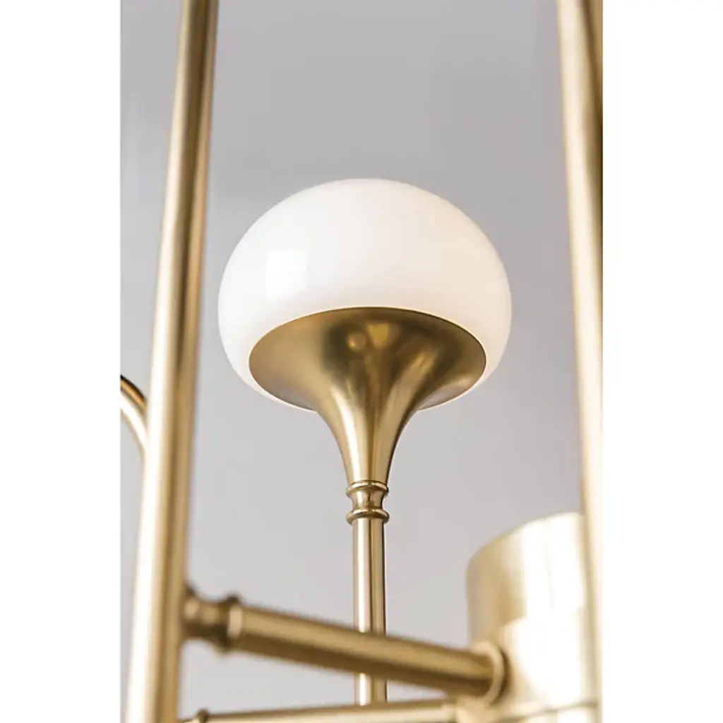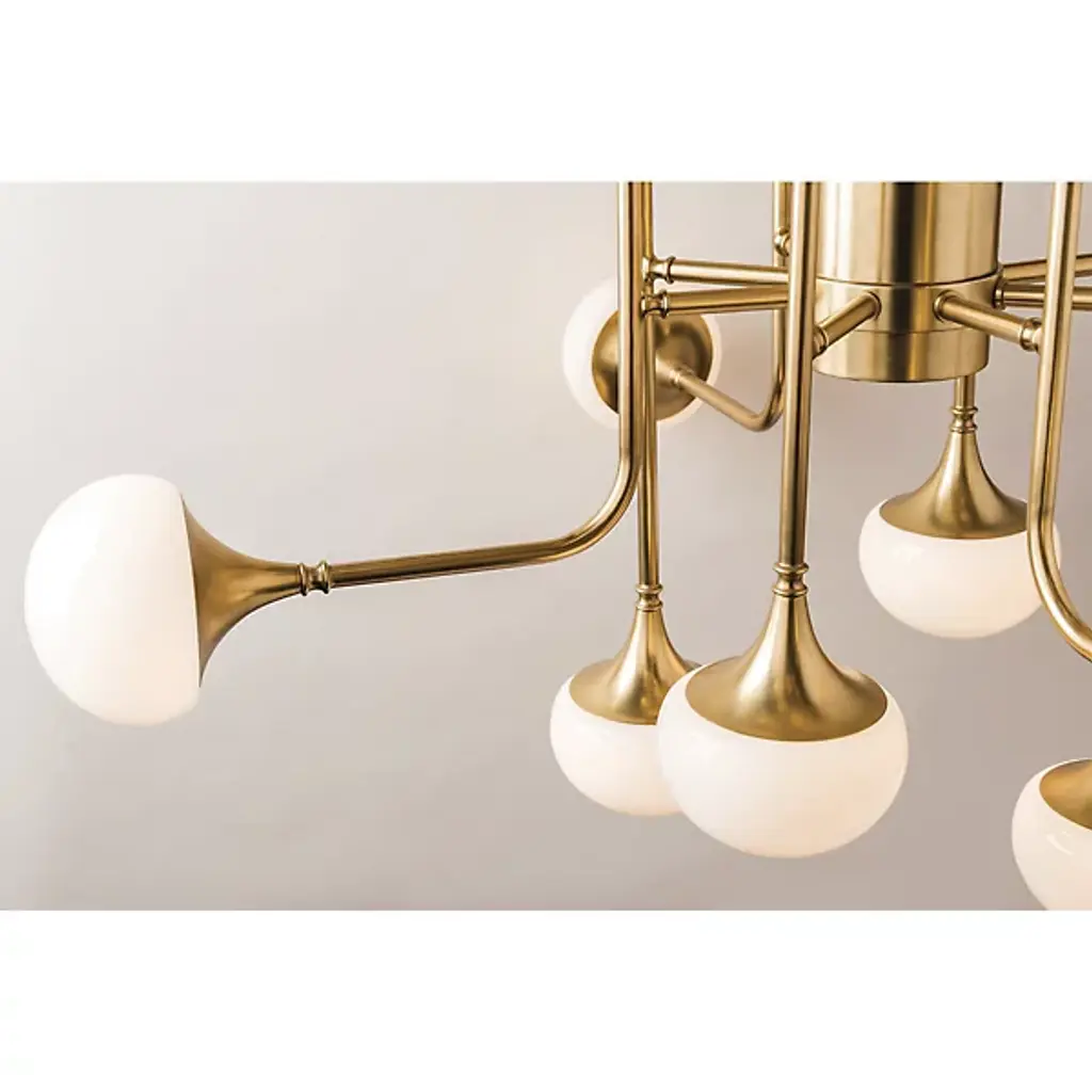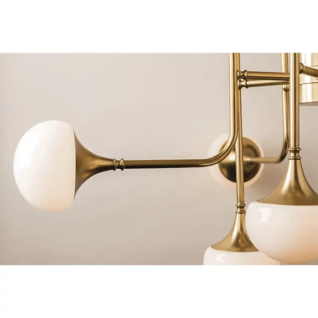 With its intricate framework and rounded Opal Glossy glass shades, the Fleming LED Chandelier by Hudson Valley Lighting becomes a stunning centerpiece for your living space. Each luminaire has a unique orientation, collectively producing a widespread ambiance that is both fashionable and functional. Light is generated by replaceable LED modules, allowing convenient, long-lasting usage.