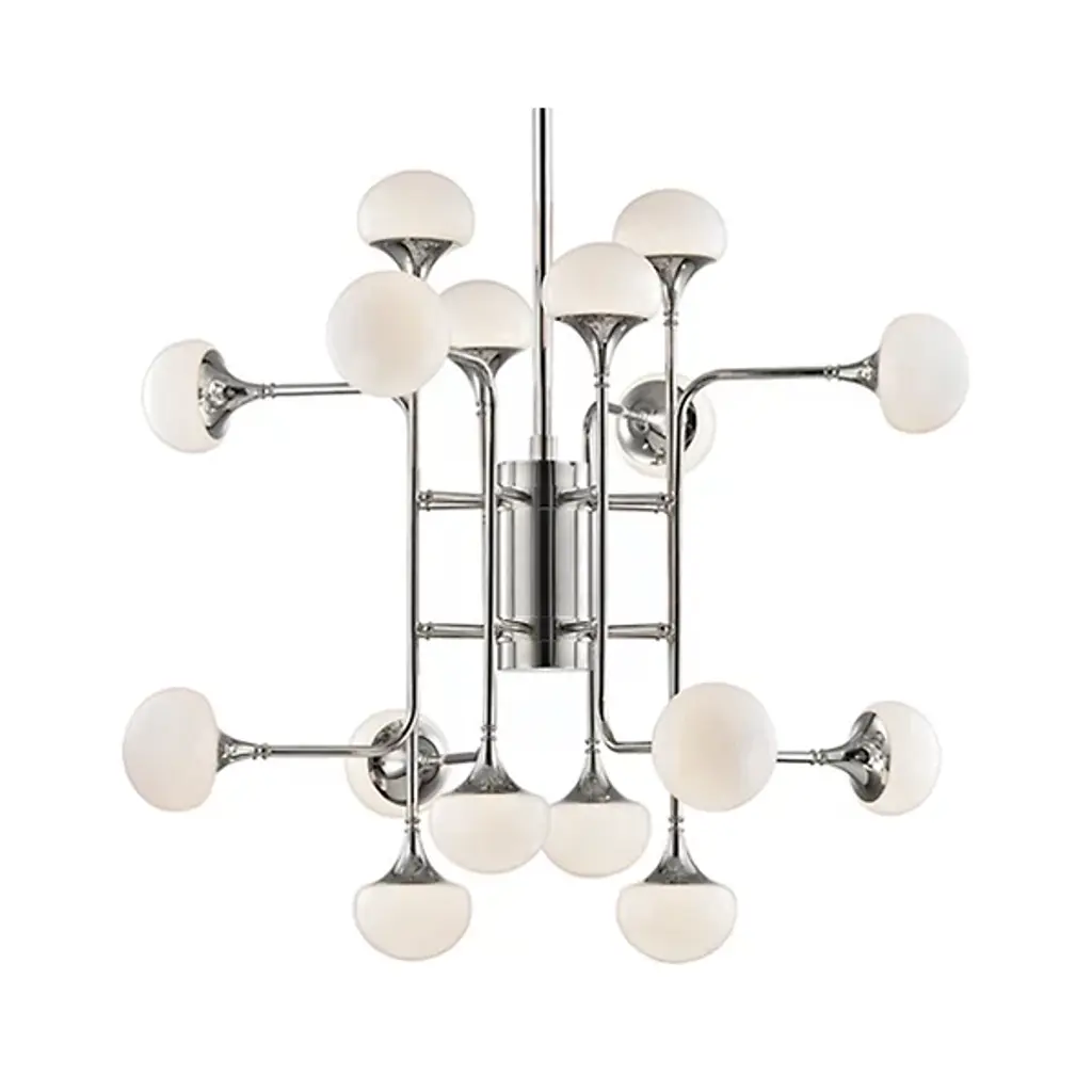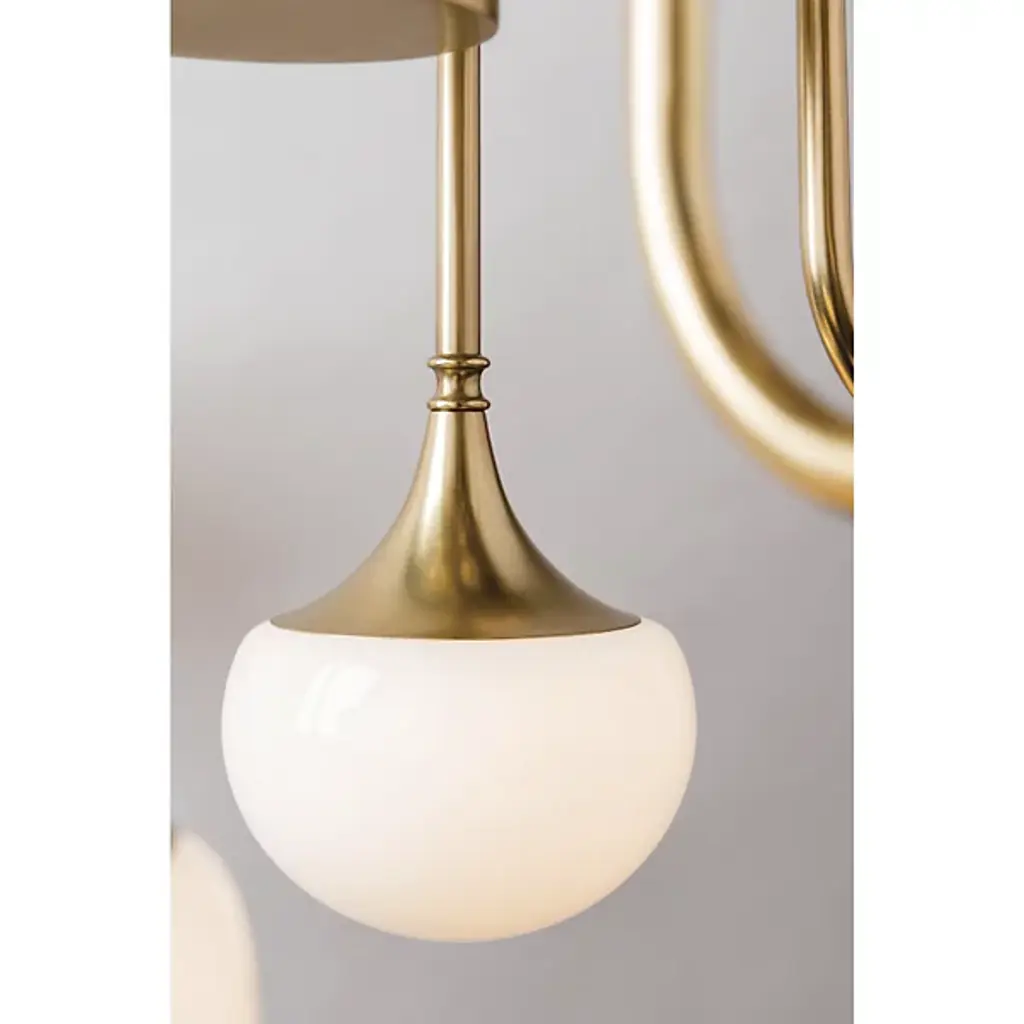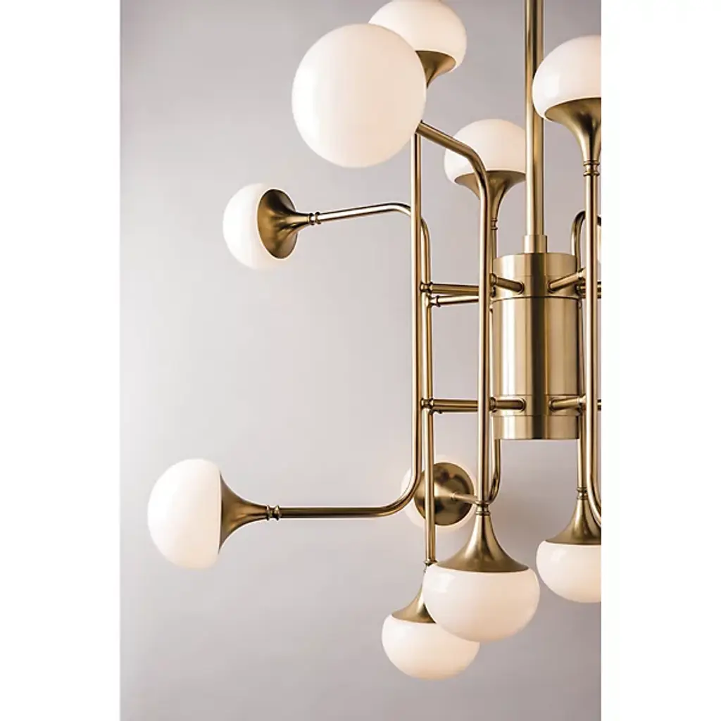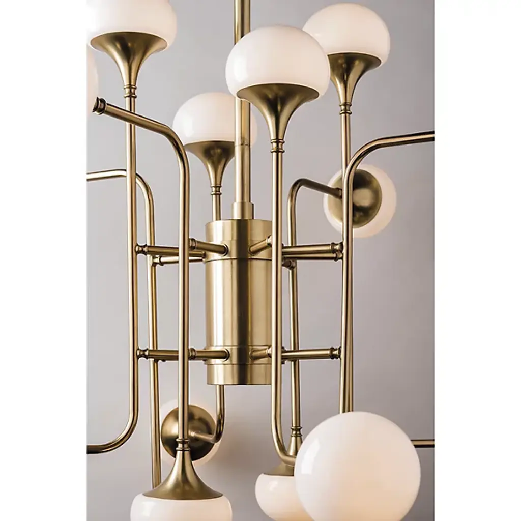With its intricate framework and rounded Opal Glossy glass shades, the Fleming LED Chandelier by Hudson Valley Lighting becomes a stunning centerpiece for your living space. Each luminaire has a unique orientation, collectively producing a widespread ambiance that is both fashionable and functional. Light is generated by replaceable LED modules, allowing convenient, long-lasting usage.