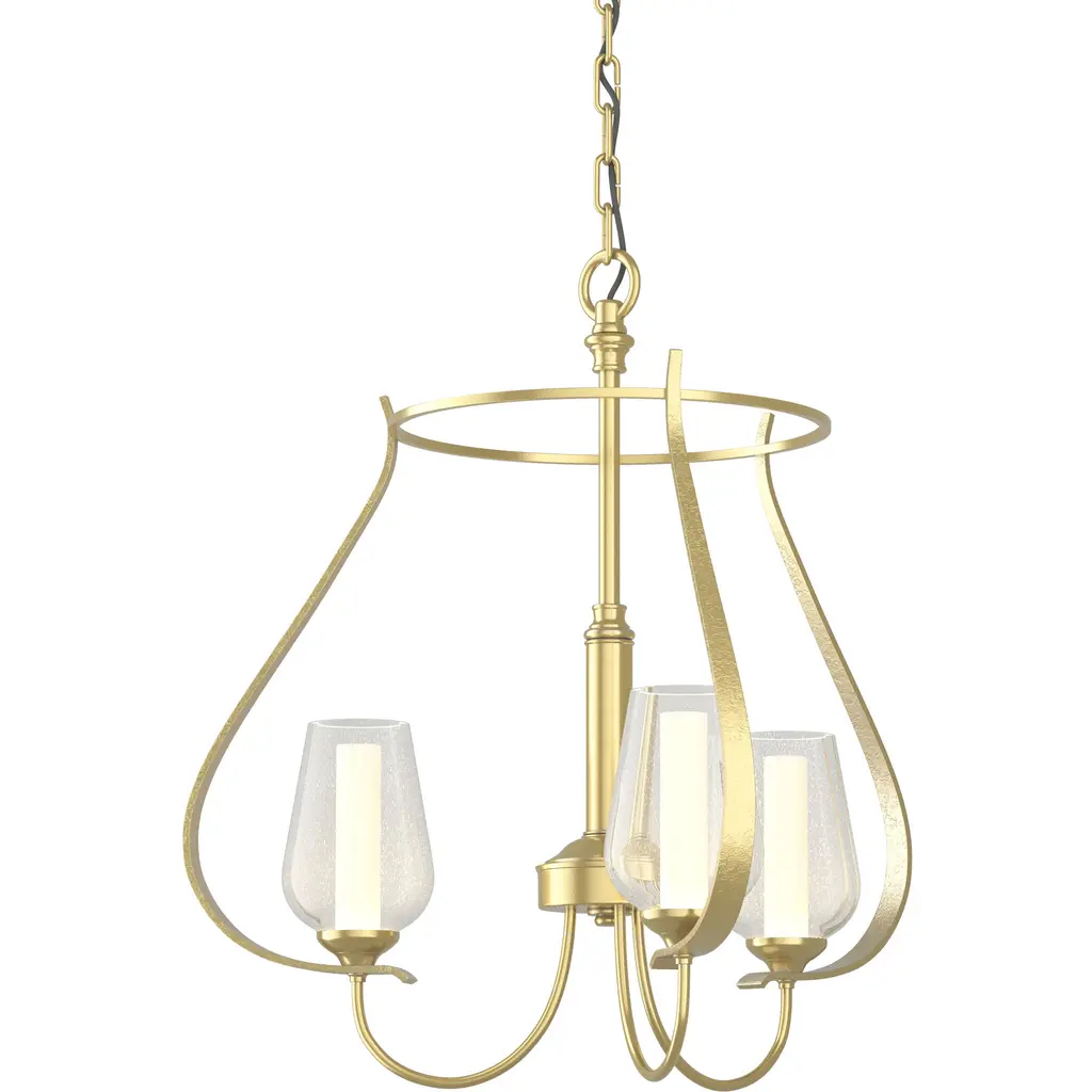 This three-armed chandelier showcases our Vermont forge work. From the circlet crowning the piece, to the bands swooping down, to the round bars that sprout the glass, the hand-shaped steel delivers curve after curve.