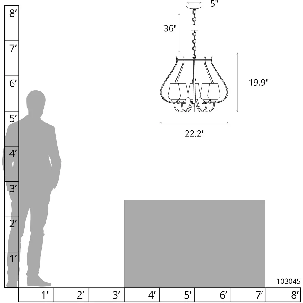 This five-armed chandelier showcases our Vermont forge work. From the circlet crowning the piece, to the bands swooping down, to the round bars that sprout the glass, the hand-shaped steel delivers curve after curve.