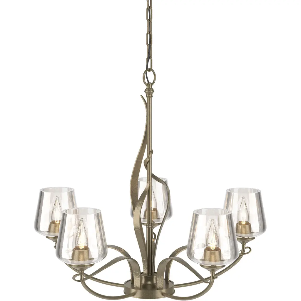 Taking inspiration from nature, our artisans create our five-armed Flora Chandelier by skillfully shaping steel bars and bands into gentle curves at our forge in Vermont. The steel tendrils twine around the fixture's main structure as they climb toward the sky.