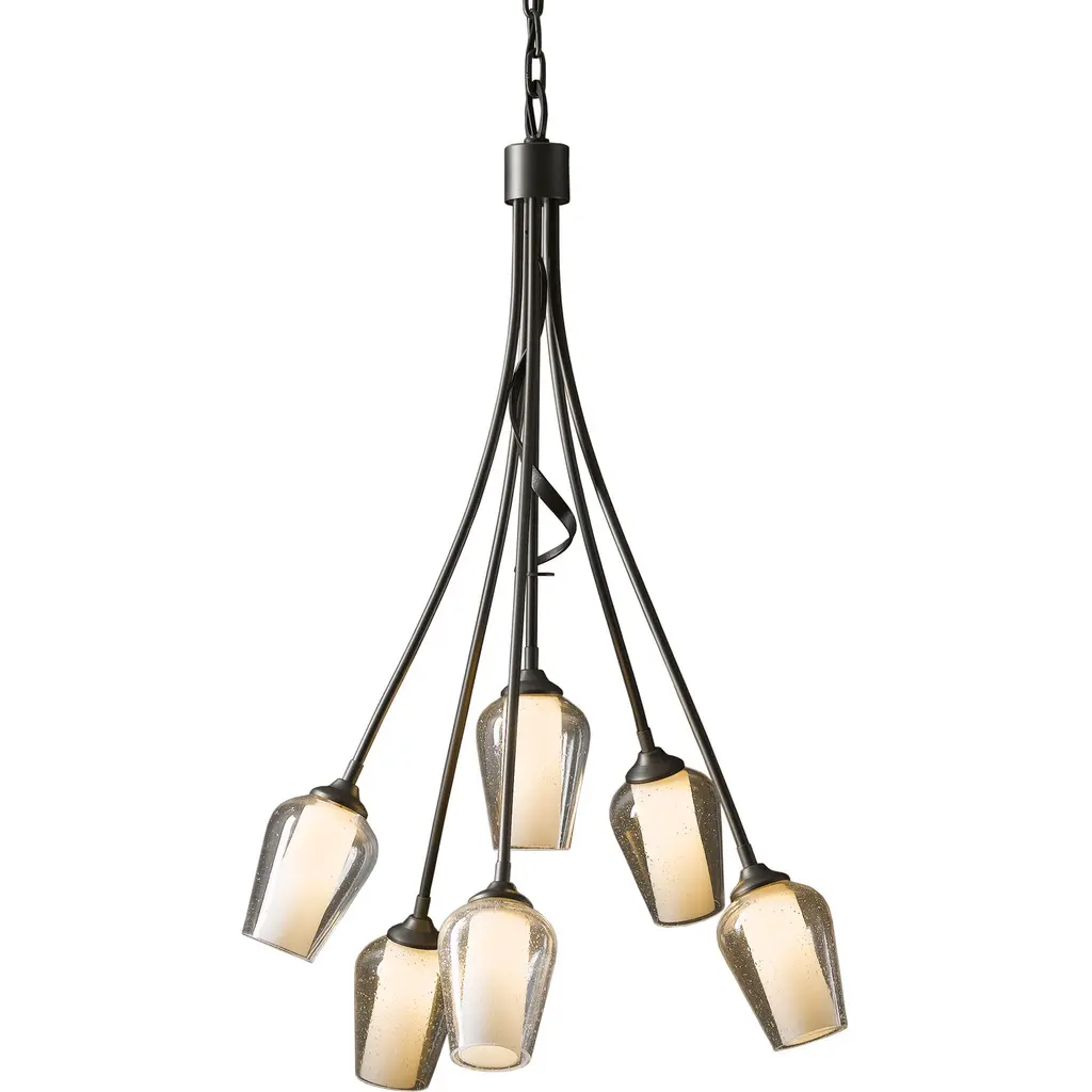Taking inspiration from nature, our artisans fashion our six-armed Flora chandelier at our forge in Vermont. A single tendril peeks down between the light stems, giving a teasing hint of a verdant bloom soon to arrive.