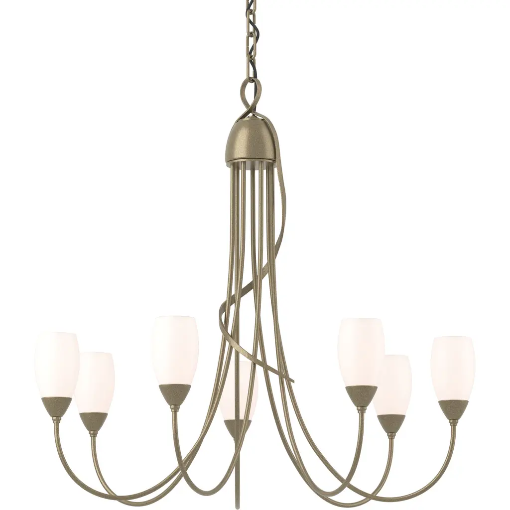 A beautiful bouquet is a fitting centerpiece for modern table settings. With this in mind, a more permanent bouquet can become the centerpiece of a modern dining area with the Hubbardton Forge Flora 7-Light Chandelier. Seven tulip-shaped shades rise from organically curved wrought-iron arms, embellished with a single swirl of iron around the center stems that helps embellish this lamp's airy and exquisitely feminine fixture.