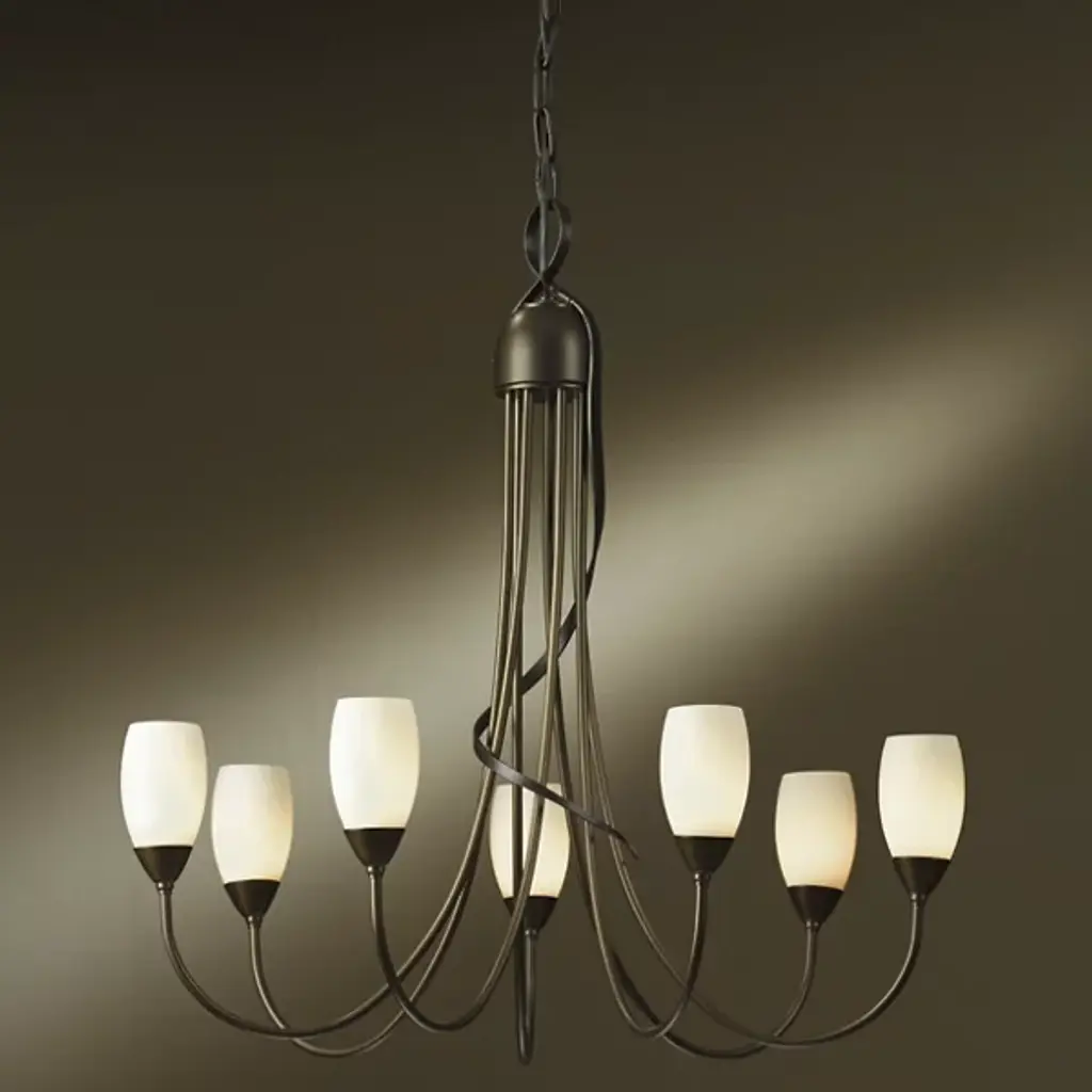 A beautiful bouquet is a fitting centerpiece for modern table settings. With this in mind, a more permanent bouquet can become the centerpiece of a modern dining area with the Hubbardton Forge Flora 7-Light Chandelier. Seven tulip-shaped shades rise from organically curved wrought-iron arms, embellished with a single swirl of iron around the center stems that helps embellish this lamp's airy and exquisitely feminine fixture.
