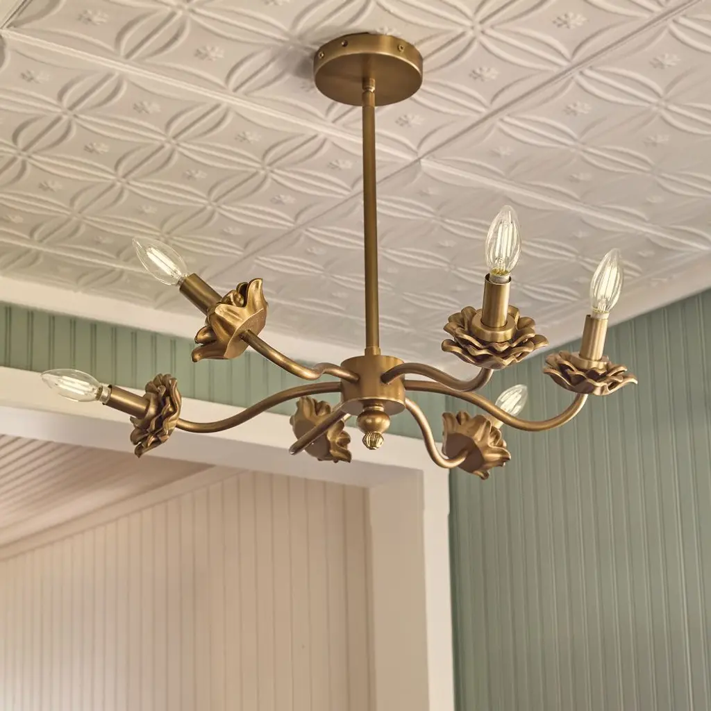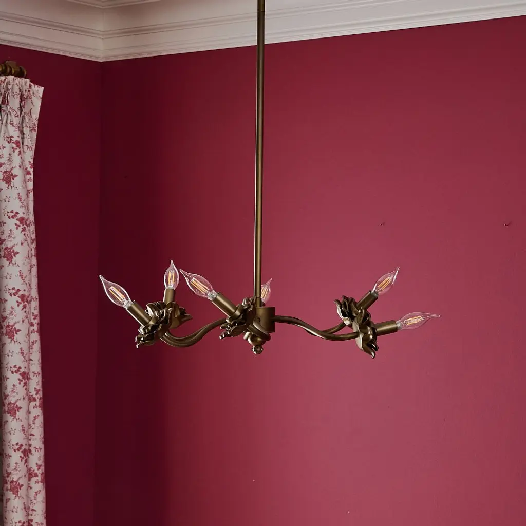 Always in bloom. Handcrafted from recycled aluminum and steel with an antique brass finish, this floral chandelier’s sculptural stems reflect the light and bring instant enchantment to a room.