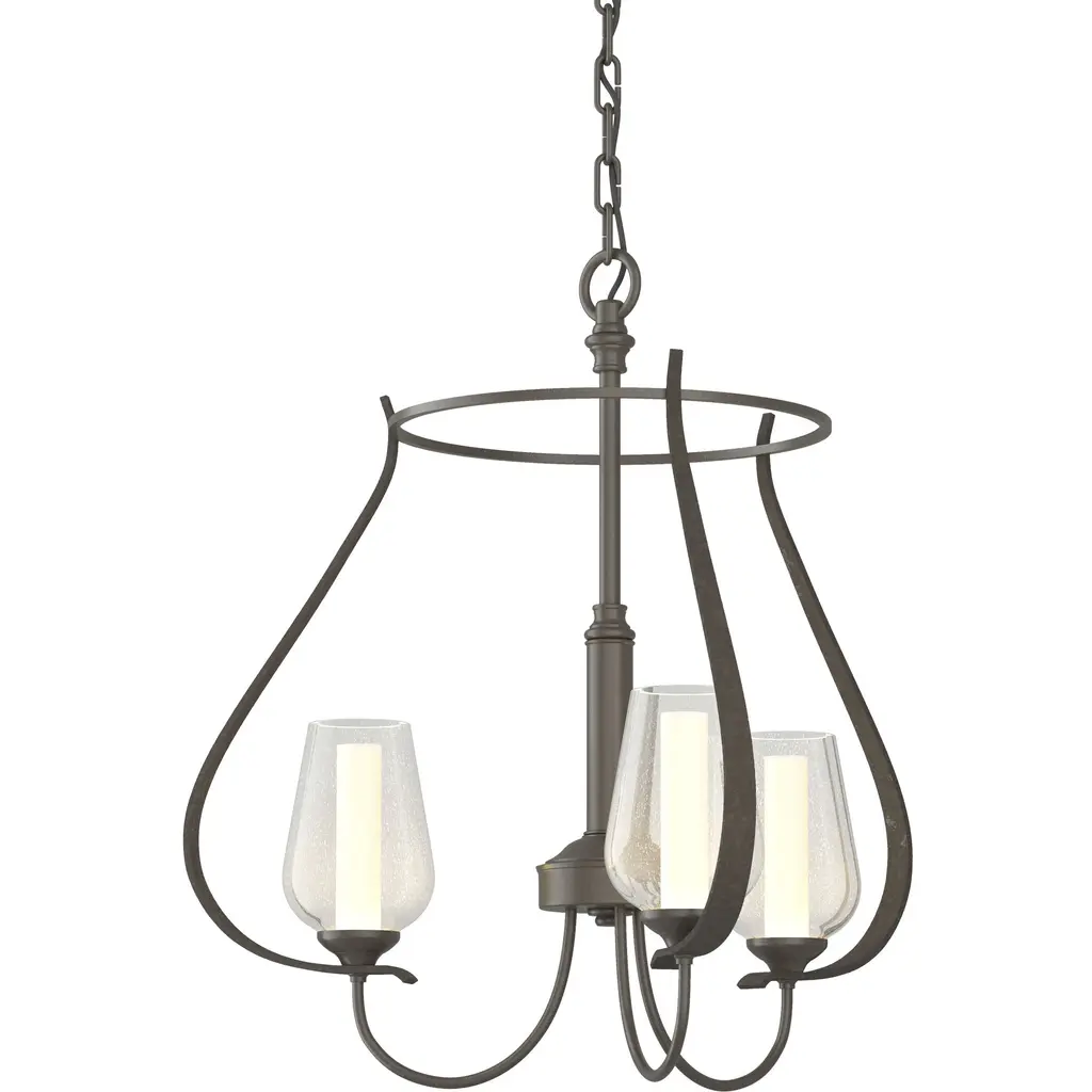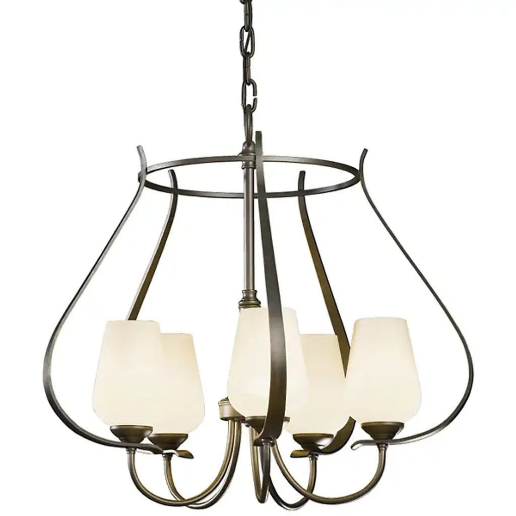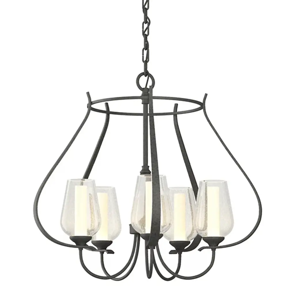 A darling piece of flora in your garden of stylish ceiling lighting. Translating to flower in Spanish, the Flora Chandelier by Hubbardton Forge is ripe for the picking. The hand forged Wrought Iron frame takes on the shape of a spring flower that blooms with illumination. The open frame lets the Glass shades shine, the intricacies in the Glass coming forward when lit. Bring it home and bask in its nature influenced yet distinctively contemporary beauty.