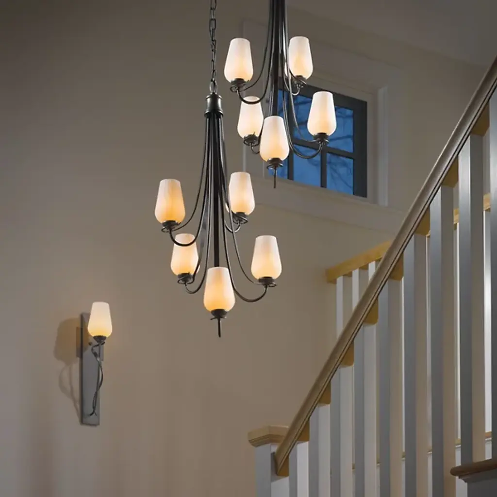 The Flora Chandelier by Hubbardton Forge is an elegant piece inspired by classic shapes found in nature. Skillfully shaped Steel bands descend and smoothly curve upward to support hand-blown Glass shades that resemble budding flowers. Layers are added into the body of this chandelier with additional pieces of curved metal that swoop around and mirror the fluid lines of the frame. Handcrafted with strong materials, this fixture feels light as it hangs above kitchen and dining areas.