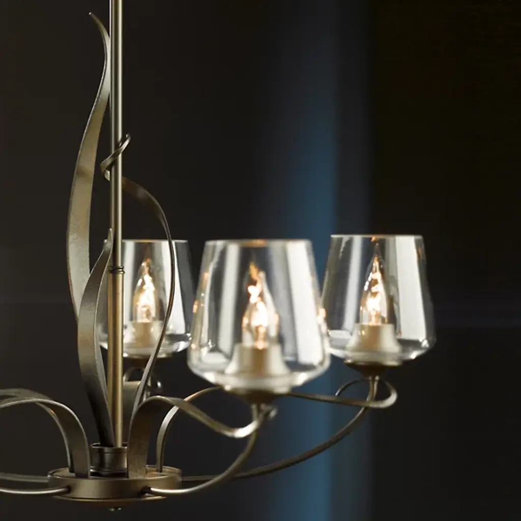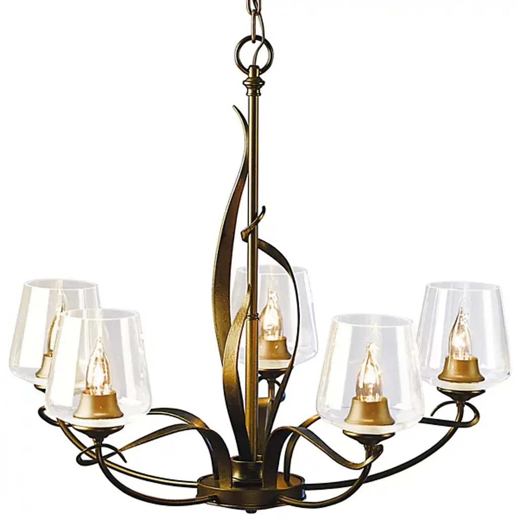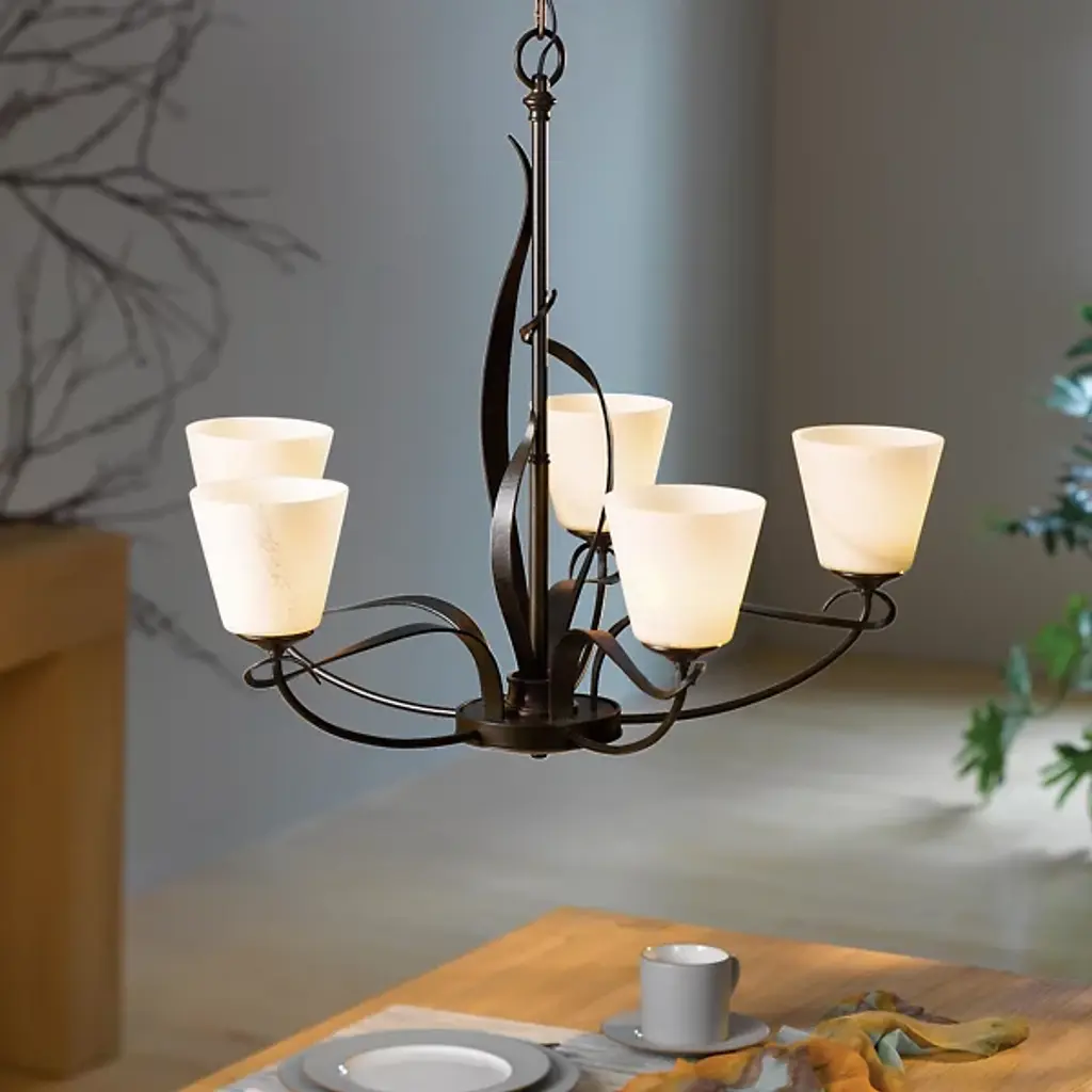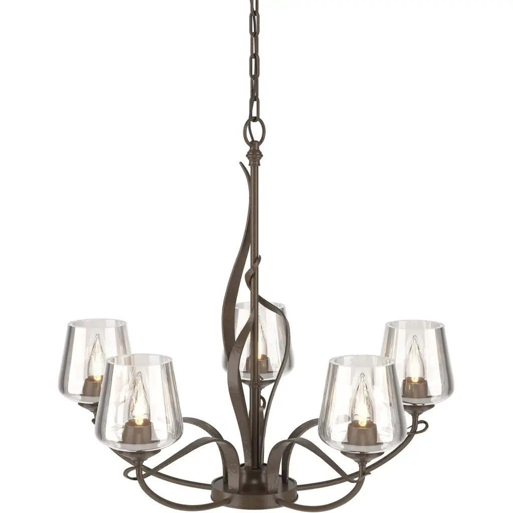 The Flora Chandelier No. 103040 by Hubbardton Forge is a skillful and elegant composition inspired by nature. Gracefully shaped Steel bars and bands create the frame of this chandelier, with five smoothly curved arms and twining vines that climb around the main structure. Hand-blown glass shades open upward from the arced arms and warm house candelabras. Beautifully crafted materials and organic shapes allow this centerpiece to shine above tables, counters, in entryways and living spaces.