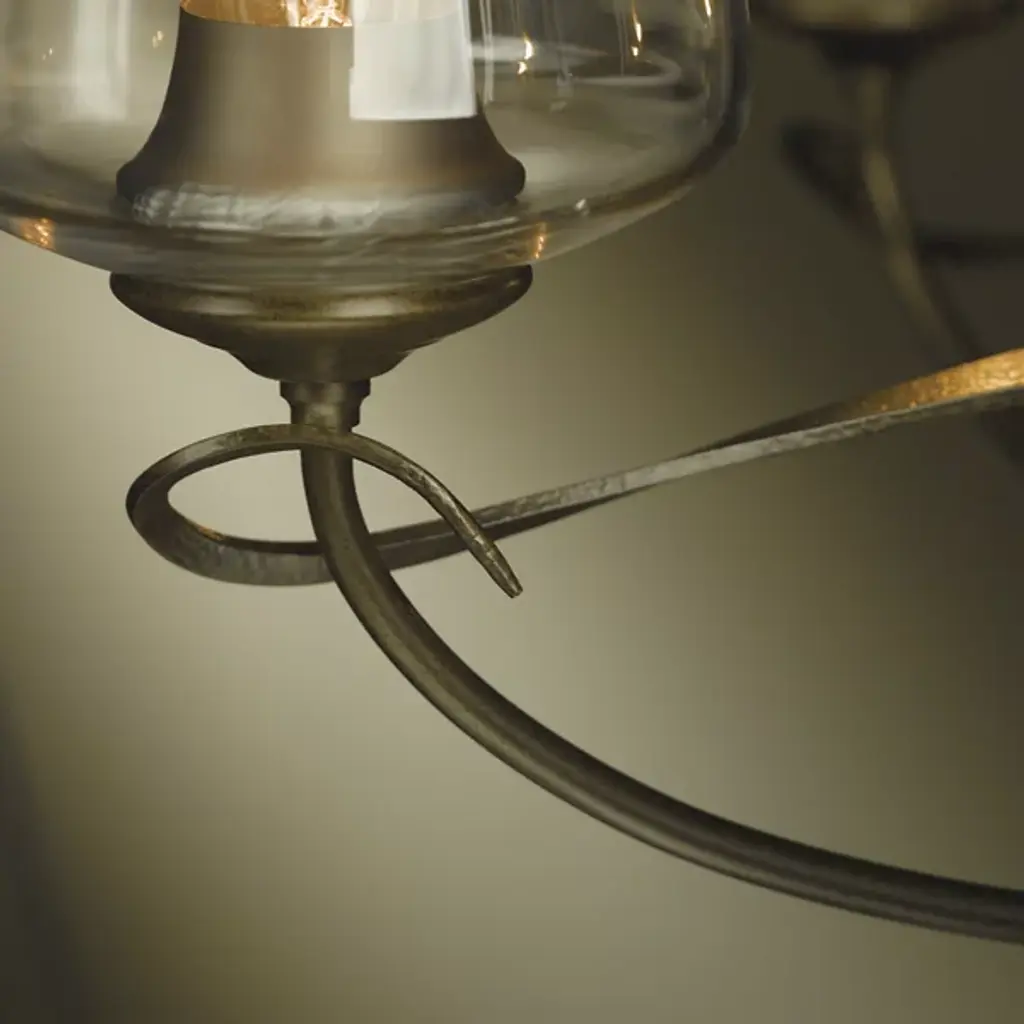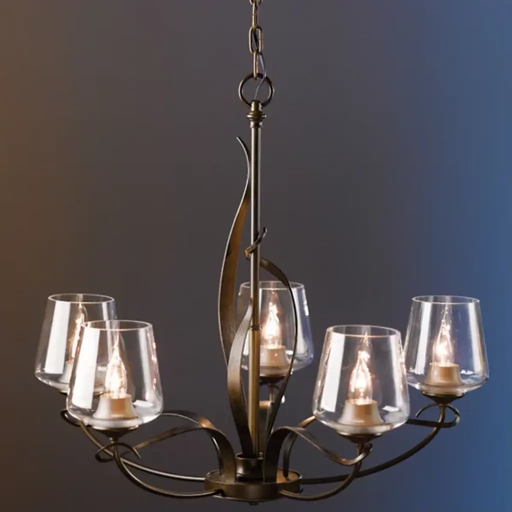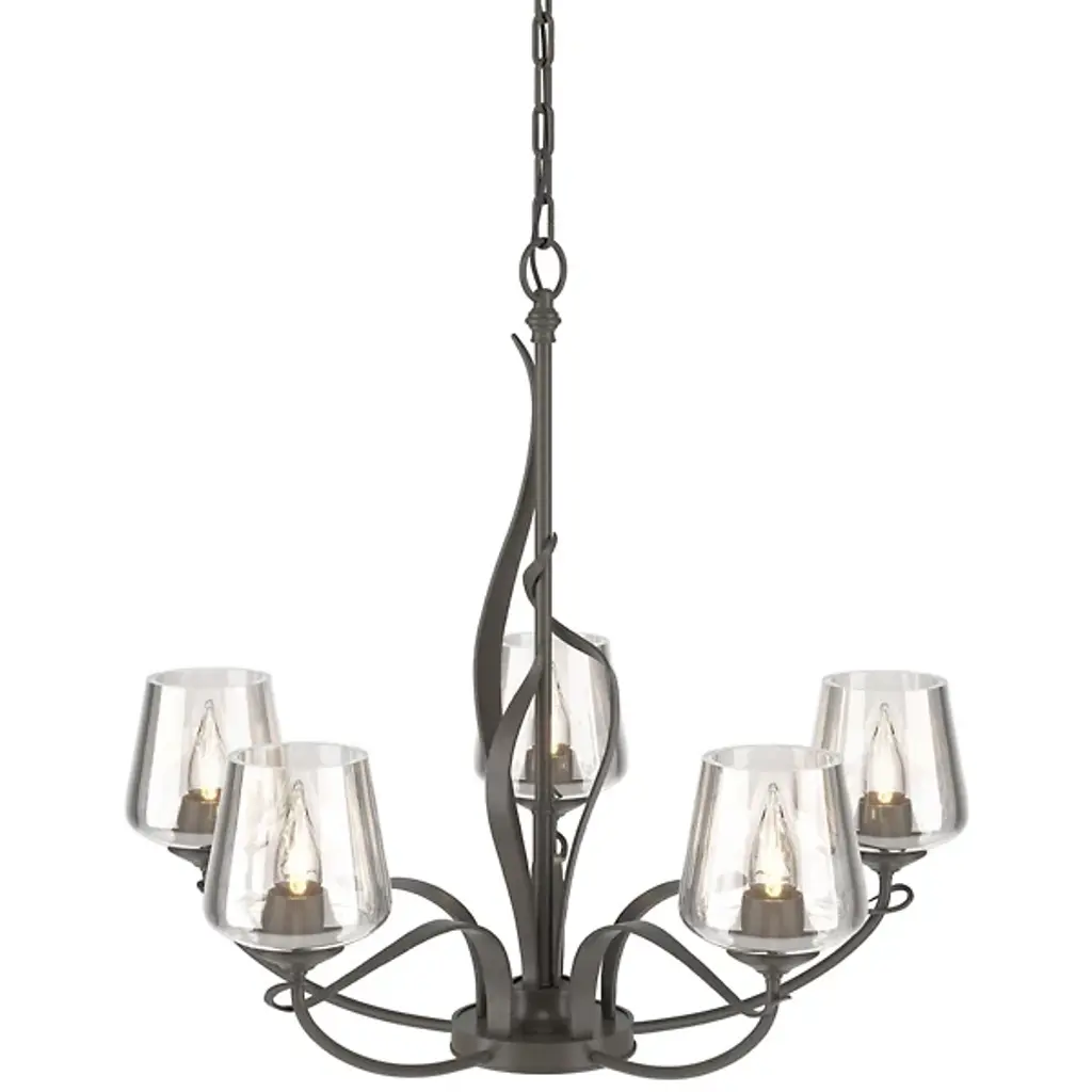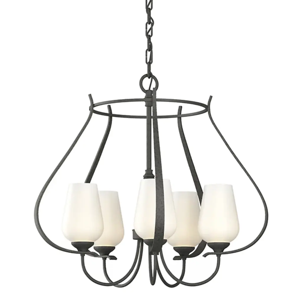 The Flora Chandelier No. 103040 by Hubbardton Forge is a skillful and elegant composition inspired by nature. Gracefully shaped Steel bars and bands create the frame of this chandelier, with five smoothly curved arms and twining vines that climb around the main structure. Hand-blown glass shades open upward from the arced arms and warm house candelabras. Beautifully crafted materials and organic shapes allow this centerpiece to shine above tables, counters, in entryways and living spaces.