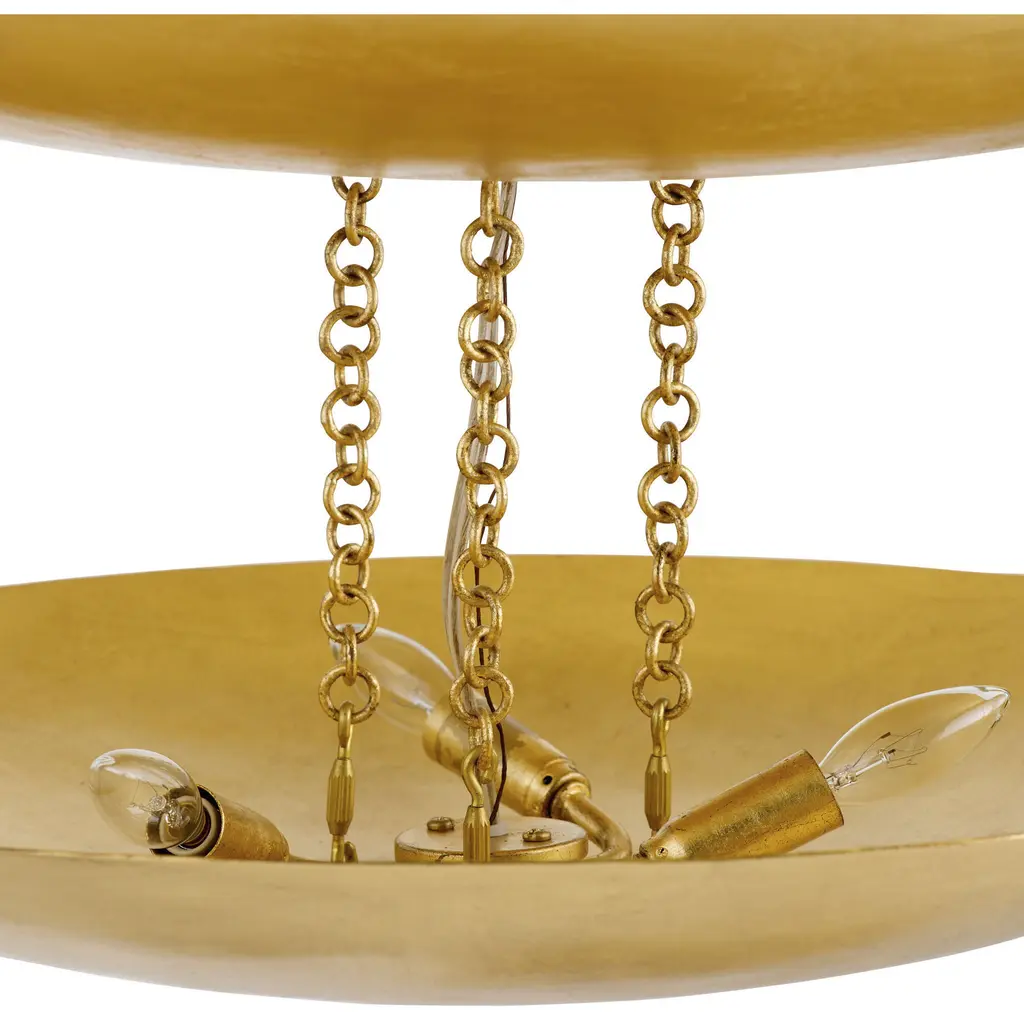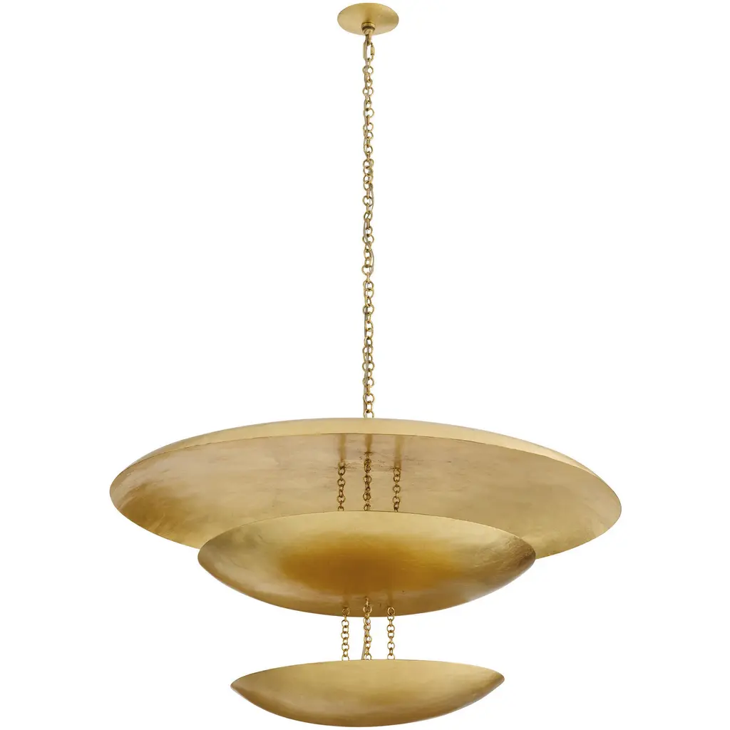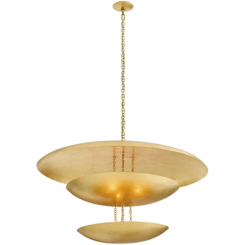 The out-of-this-world design of the Florko is supersized in a new over scaled version. Gold-leafed iron curled discs float effortlessly under the space-like dome. Both lower levels hold lights, creating a soft glow. Finish will vary.