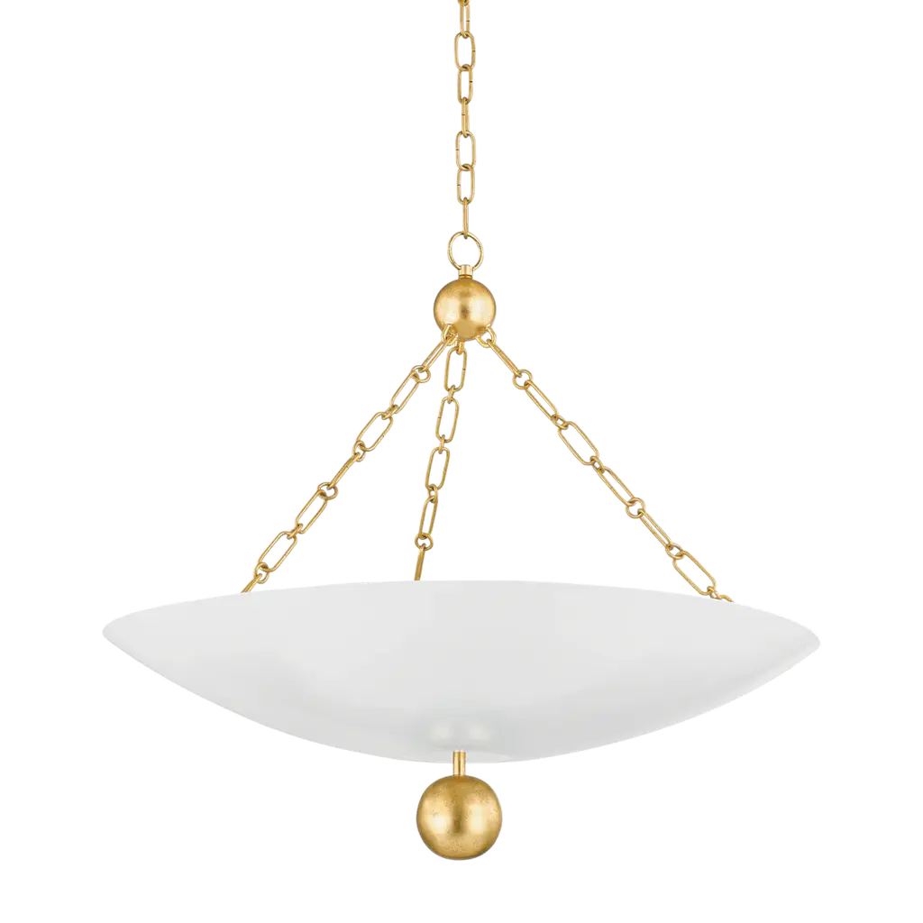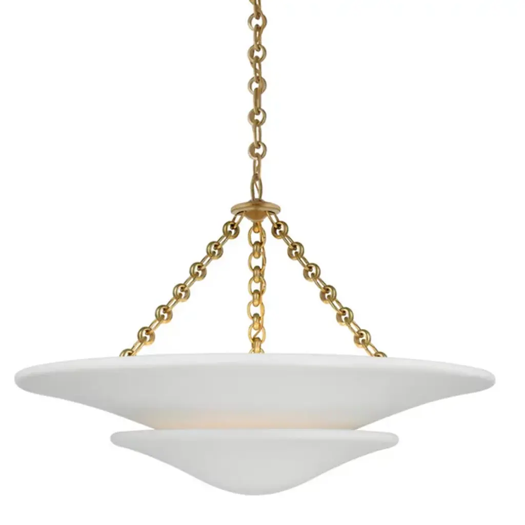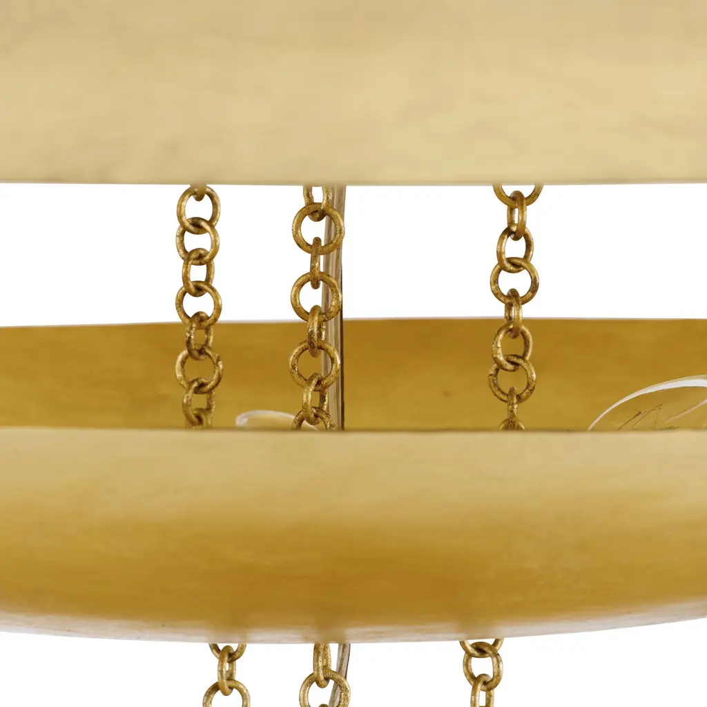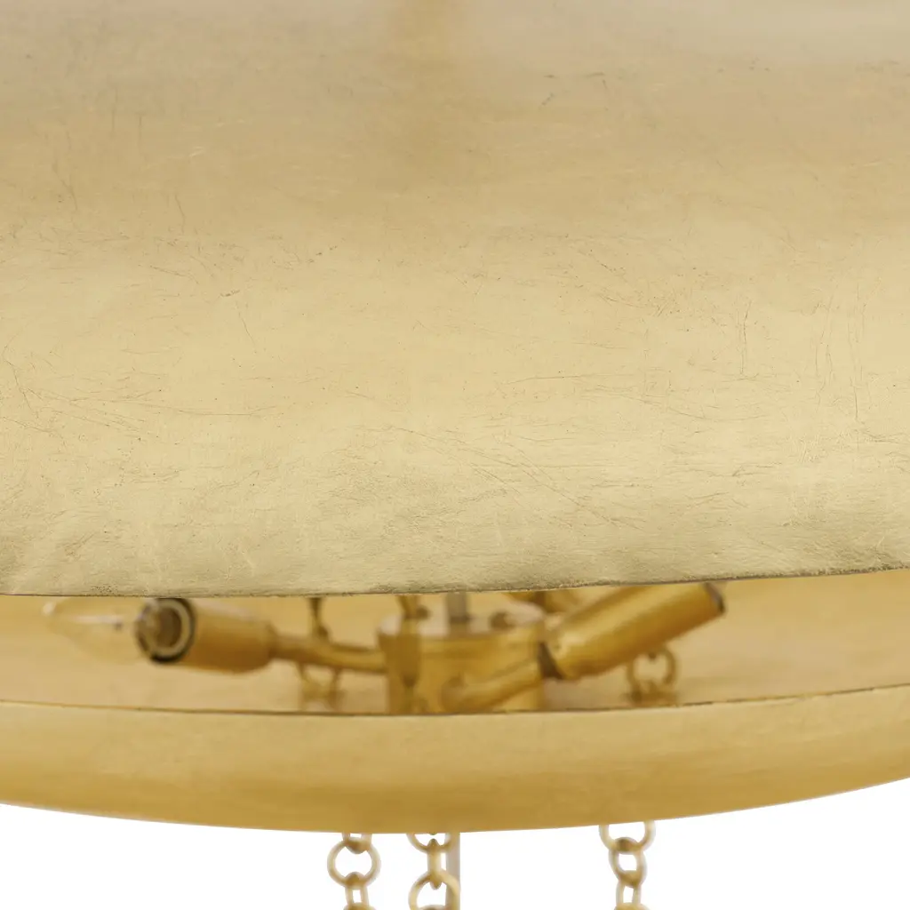 The out-of-this-world design of the Florko is supersized in a new over scaled version. Gold-leafed iron curled discs float effortlessly under the space-like dome. Both lower levels hold lights, creating a soft glow. Finish will vary.