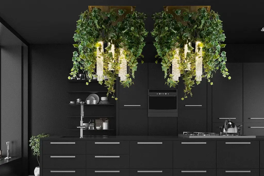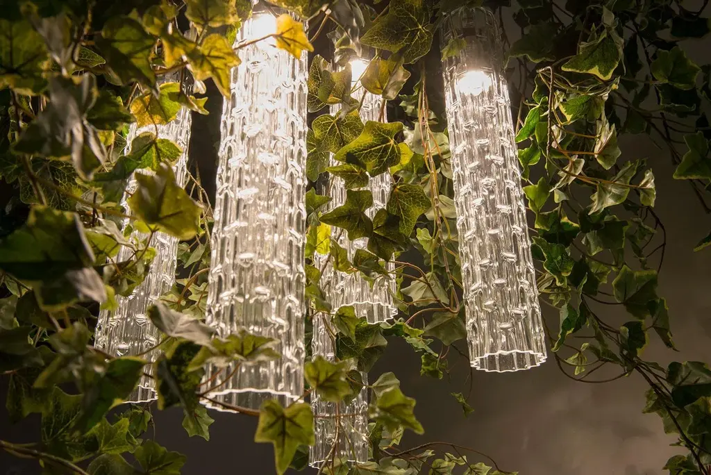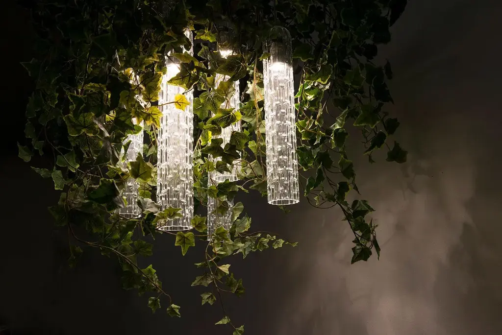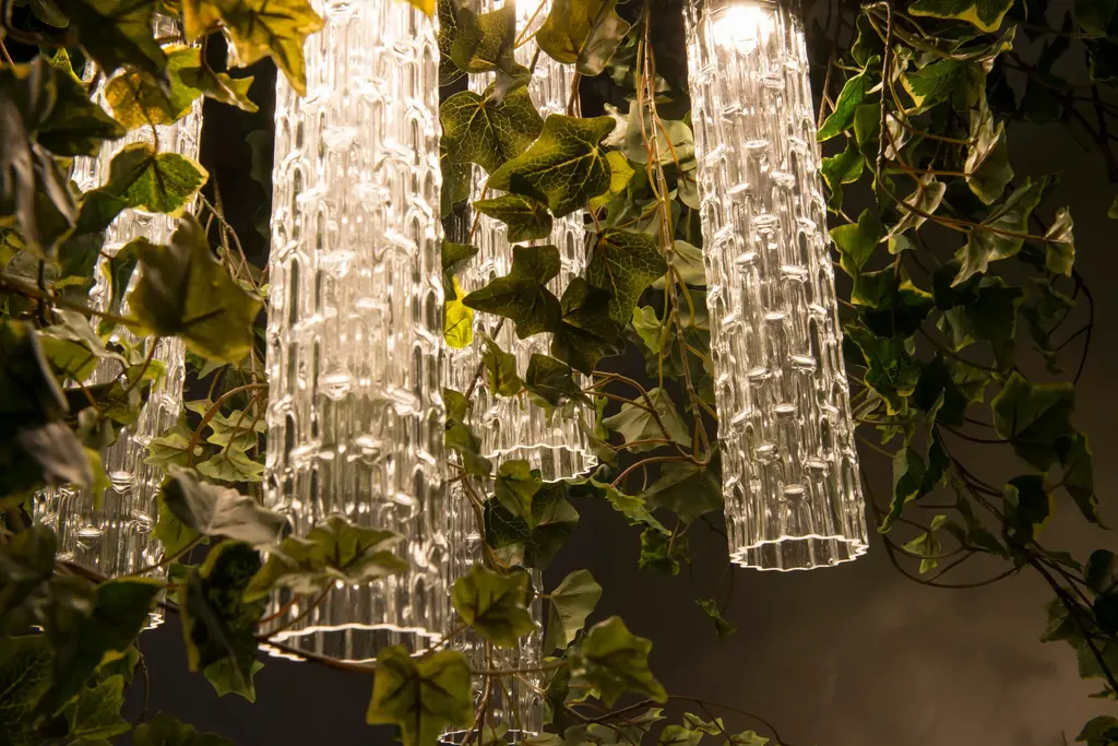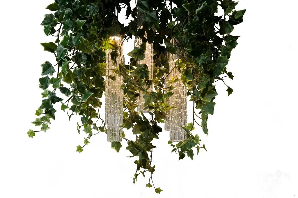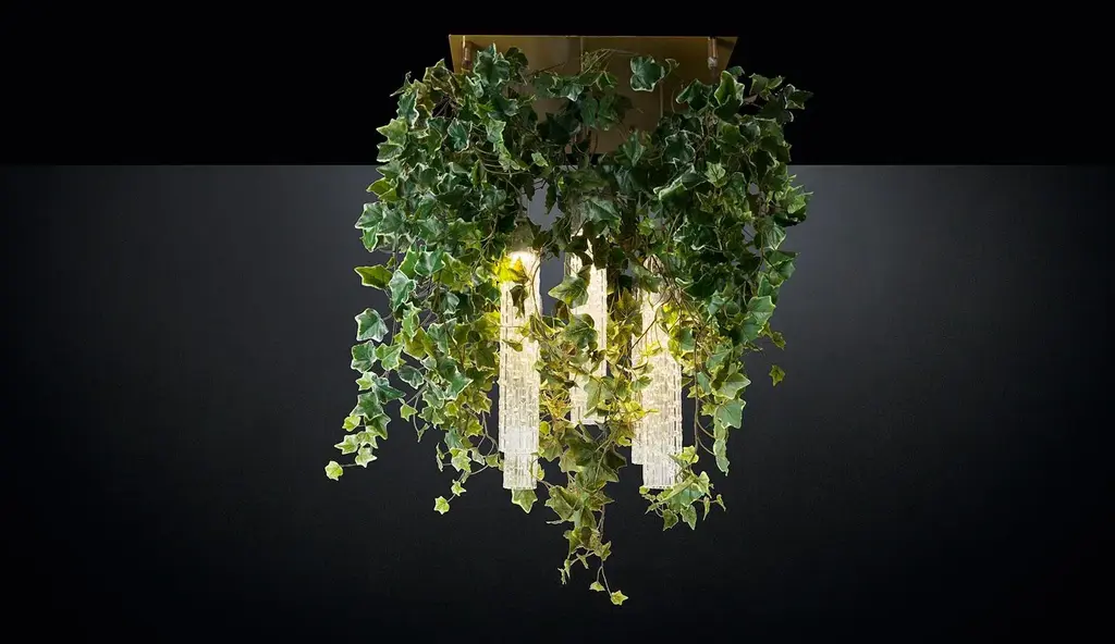 Chandelier consisting of vg artificial flowers and pipes in muranese glass, led bulbs (10 bulbs gu10 x 6w each) fitted with fixing plate in varnished steel champagne color, to be suspended or ceiling mounted. vg ivies in various colors and different lengths are supplied as the standard versions, creating a vegetative flowerbed. plate size is approx 15 cm shorter in length and width than volume dimensions. up to 250v (europe/uk standard).