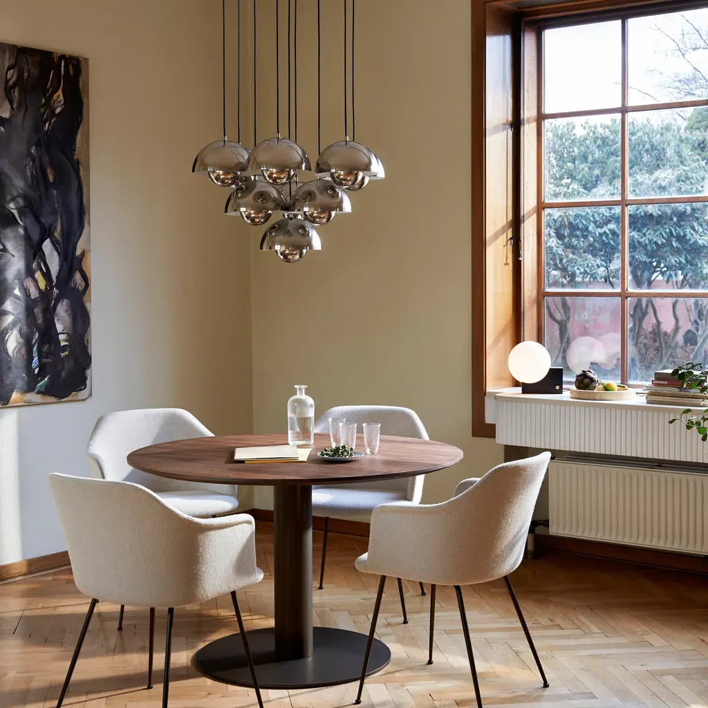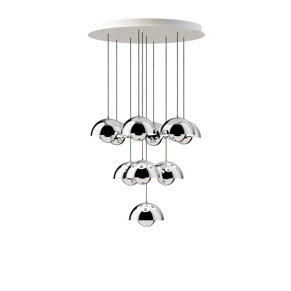 The Flowerpot Chandelier VP1 by &Tradition is a hallmark of Verner Panton’s work. Inspired by Panton’s fascination with repetition and immersive installations, such as those created for the Spiegel publishing house in 1969, the chandelier is composed of multiple VP1 pendants arranged to evoke the look of cascading flowers. This chandelier is available in configurations featuring 10 or 31 pendants, suspended from a canopy made of steel and aluminum. The VP1’s signature hemispherical shades come in 3 finish options. Perfect for stairwells, dining spaces, or entryways.