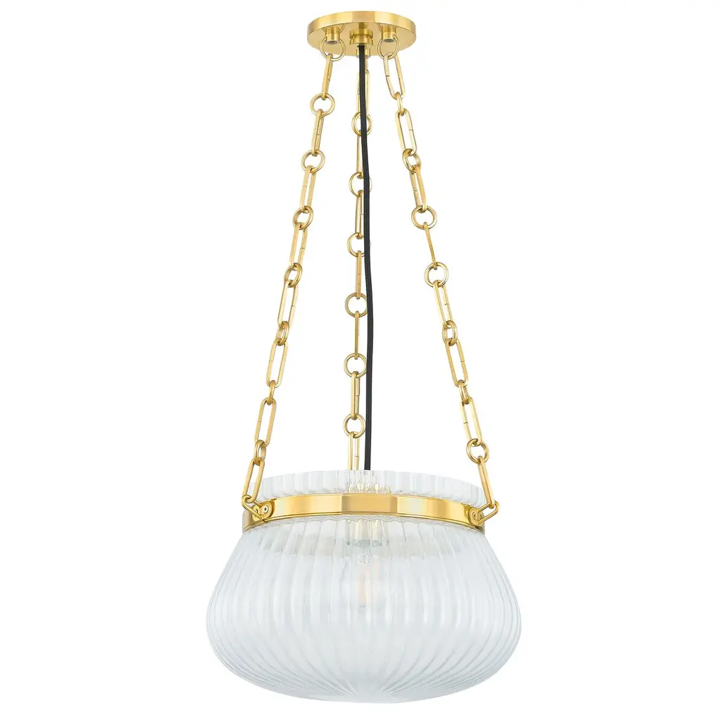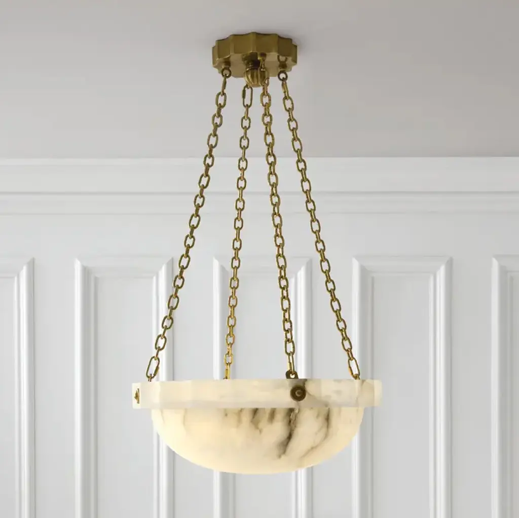Alabaster has been a favored material for lighting for millennia, with its smooth texture and warm translucence. This pendant evokes an ancient torch with its bowl shape and gleaming gold-finished hardware, including a fluted ceiling fixture. Hardwired.
