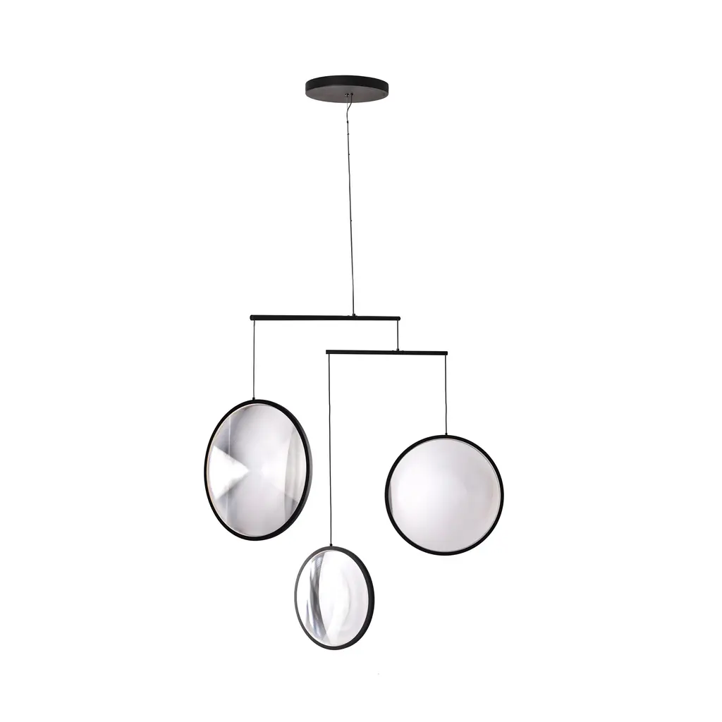 Debuting at Milano Salone, Focus from DCW Éditions Paris enchanted visitors with its mobile-style structure displaying luminous acrylic discs, iIlluminated by integrated LED halos. Fascinated by “light, shadow, and blank space," Tokyo designer and architect Yuji Okitsu's composition reimagines an inter-planetary galaxy as ephemeral soap bubbles traveling through time. Choose from models with 3 or 5 of the glowing lights suspended from a black or white aluminum frame.