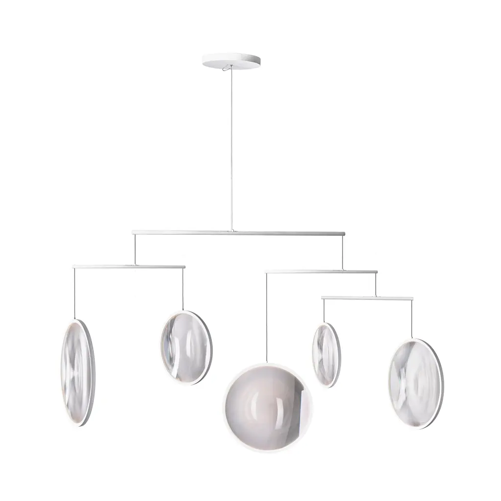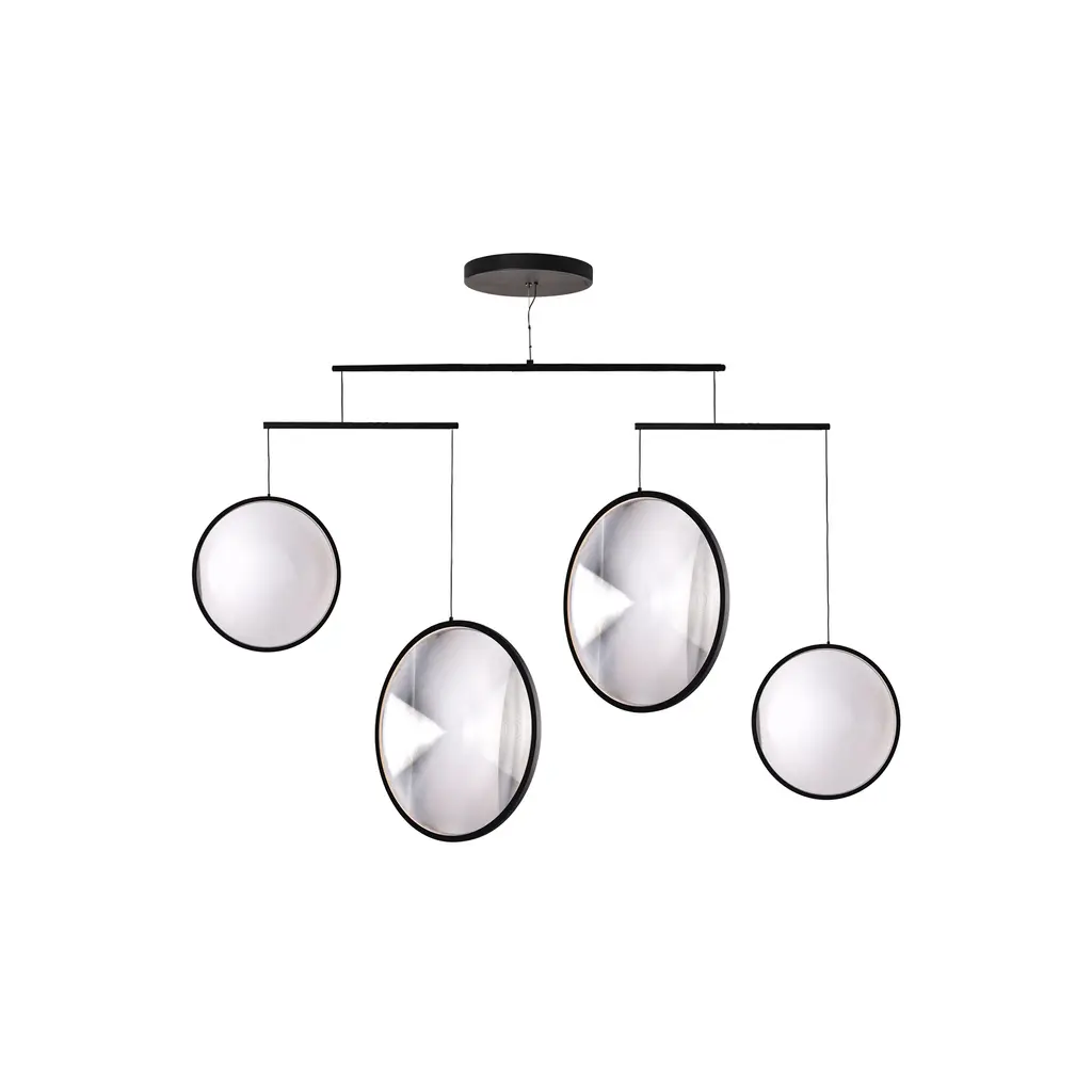 Debuting at Milano Salone, Focus from DCW Éditions Paris enchanted visitors with its mobile-style structure displaying luminous acrylic discs, iIlluminated by integrated LED halos. Fascinated by “light, shadow, and blank space," Tokyo designer and architect Yuji Okitsu's composition reimagines an inter-planetary galaxy as ephemeral soap bubbles traveling through time. Choose from models with 3 or 5 of the glowing lights suspended from a black or white aluminum frame.