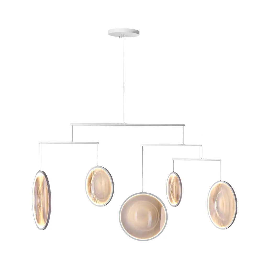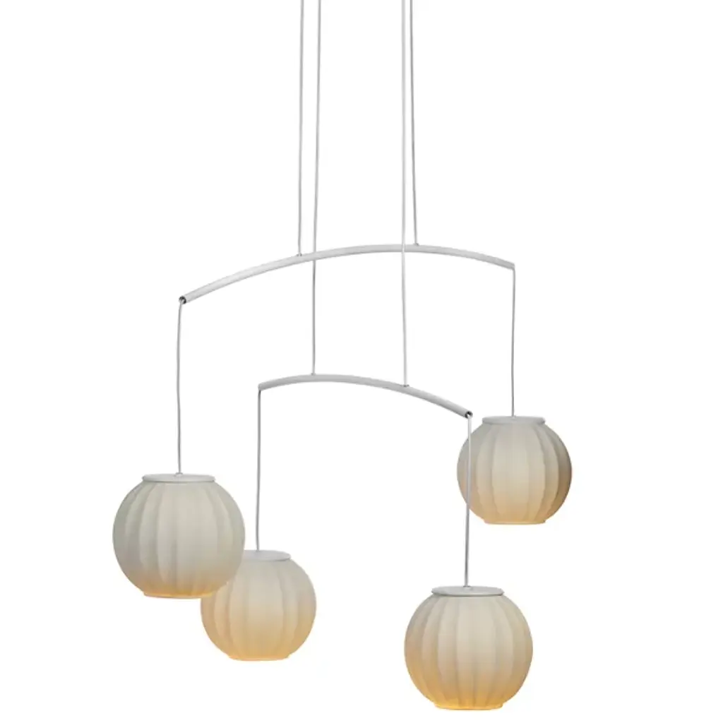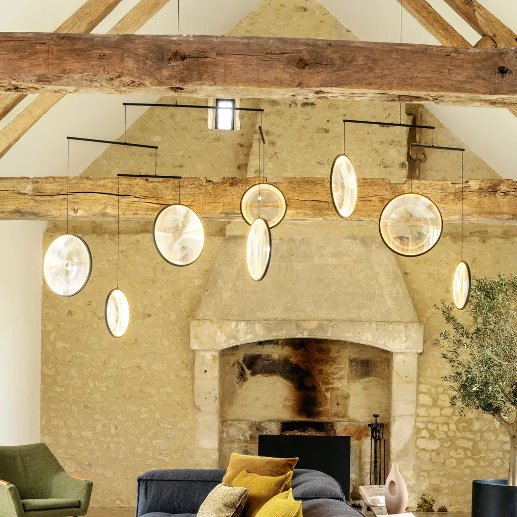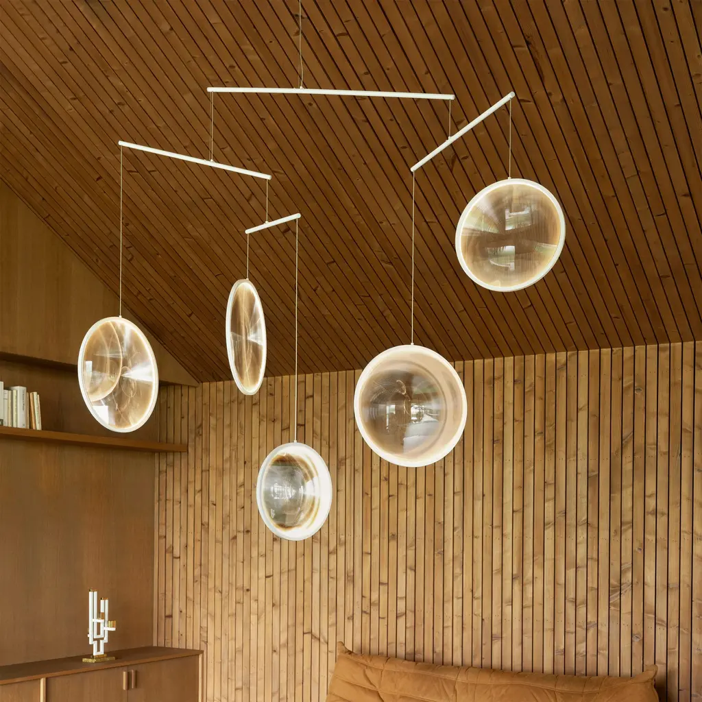 Debuting at Milano Salone, Focus from DCW Éditions Paris enchanted visitors with its mobile-style structure displaying luminous acrylic discs, iIlluminated by integrated LED halos. Fascinated by “light, shadow, and blank space," Tokyo designer and architect Yuji Okitsu's composition reimagines an inter-planetary galaxy as ephemeral soap bubbles traveling through time. Choose from models with 3 or 5 of the glowing lights suspended from a black or white aluminum frame.