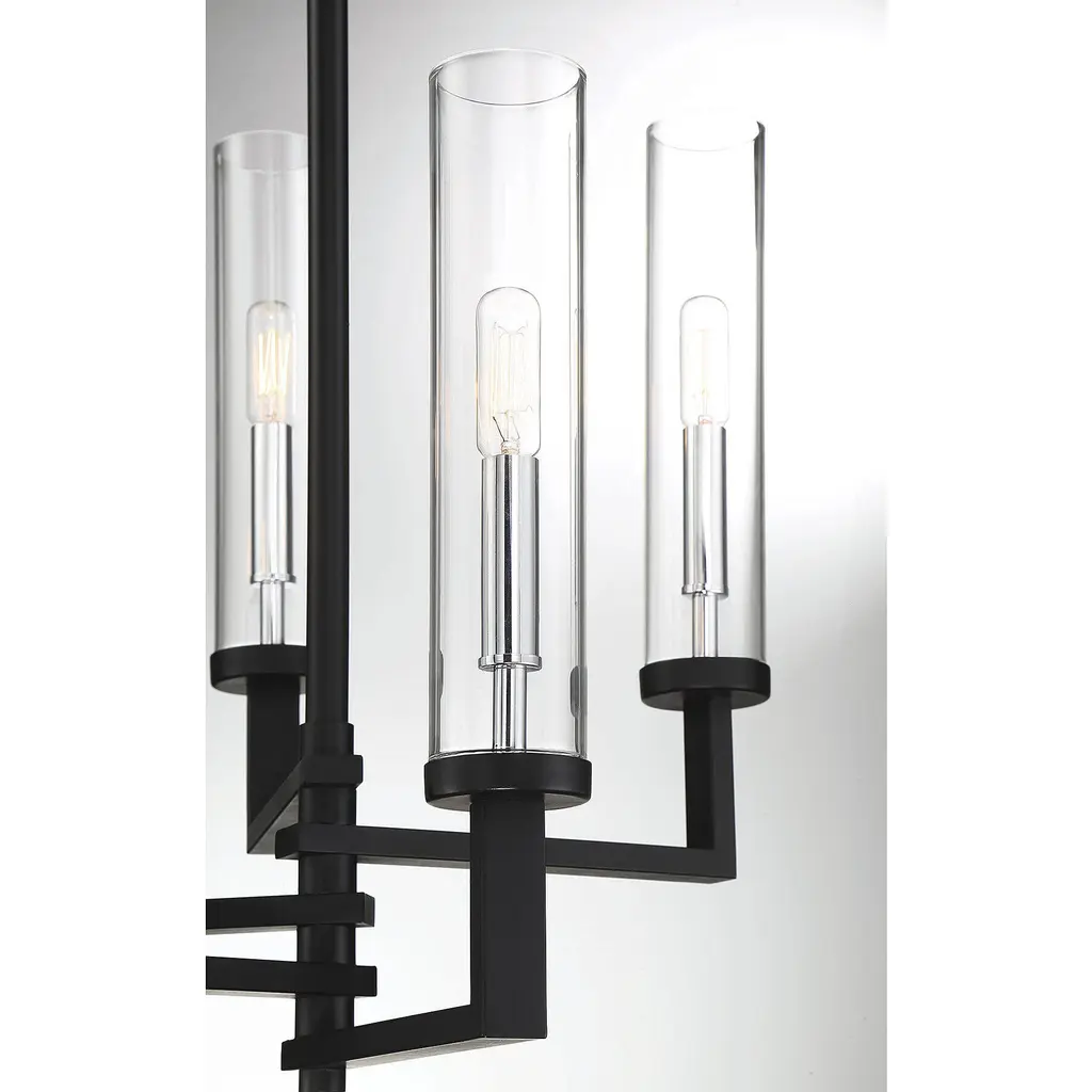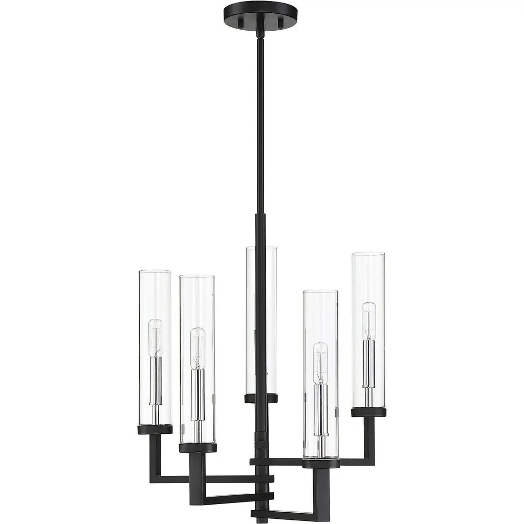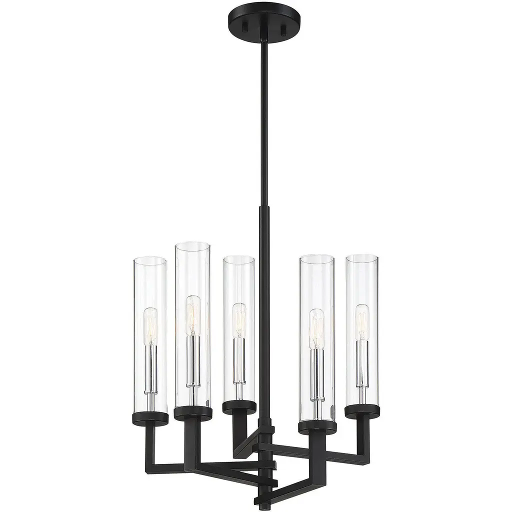 This Savoy House Folsom 5-light chandelier has a clean and versatile look that pairs well with so many decor styles It features adjustable arms topped with slim tubular shades of clear glass and a bold two-tone finish of matte black with polished chrome. Folsom is 21" in height and 18" in width. It uses 5 candelabra size bulbs of up to 60 watts per bulb.