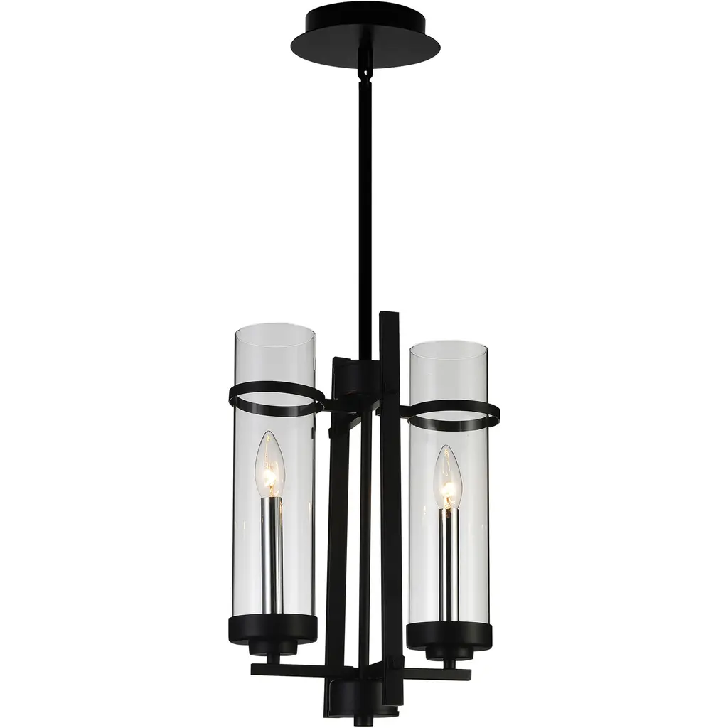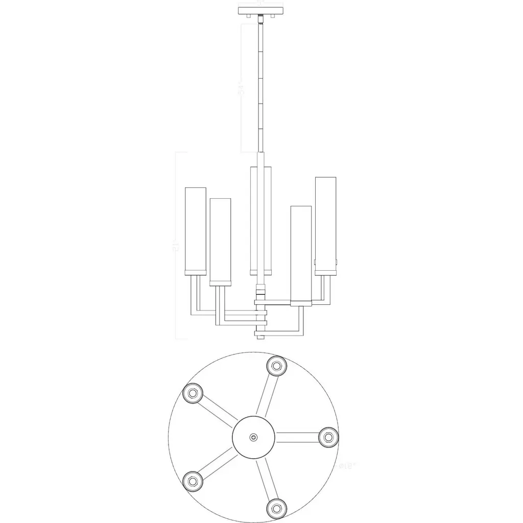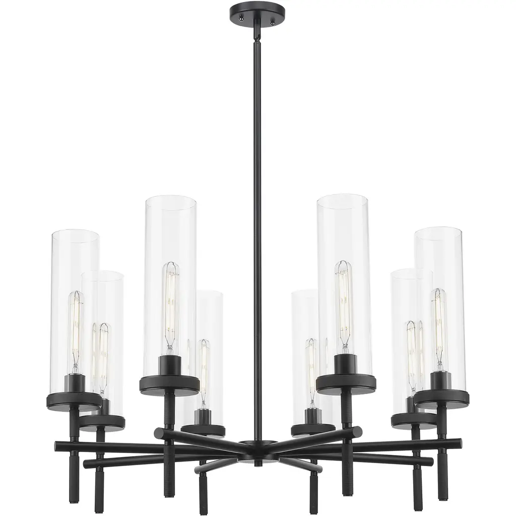 This Savoy House Folsom 5-light chandelier has a clean and versatile look that pairs well with so many decor styles It features adjustable arms topped with slim tubular shades of clear glass and a bold two-tone finish of matte black with polished chrome. Folsom is 21" in height and 18" in width. It uses 5 candelabra size bulbs of up to 60 watts per bulb.