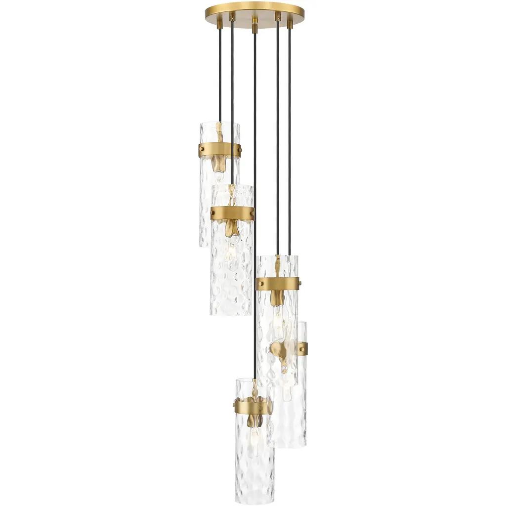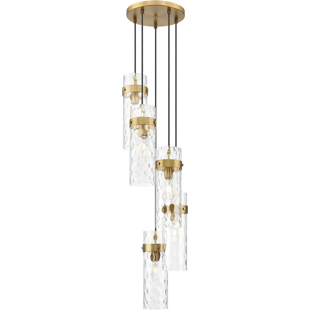 A single spiral of stunning rippled water glass cylinders creates a sophisticated presence for this modern five-light chandelier. Redefining opulence, it pairs a stunning rubbed brass finish with luxe clear cylinders that offer depth and dimensionality over a dining room or foyer.