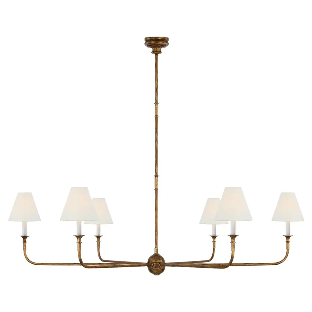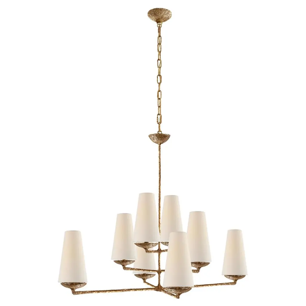 The gilded plaster detailing applied to this chandelier's steel body gives it a remarkable sense of texture, while elongated linen shades complete the design with a classic touch. Hardwired.