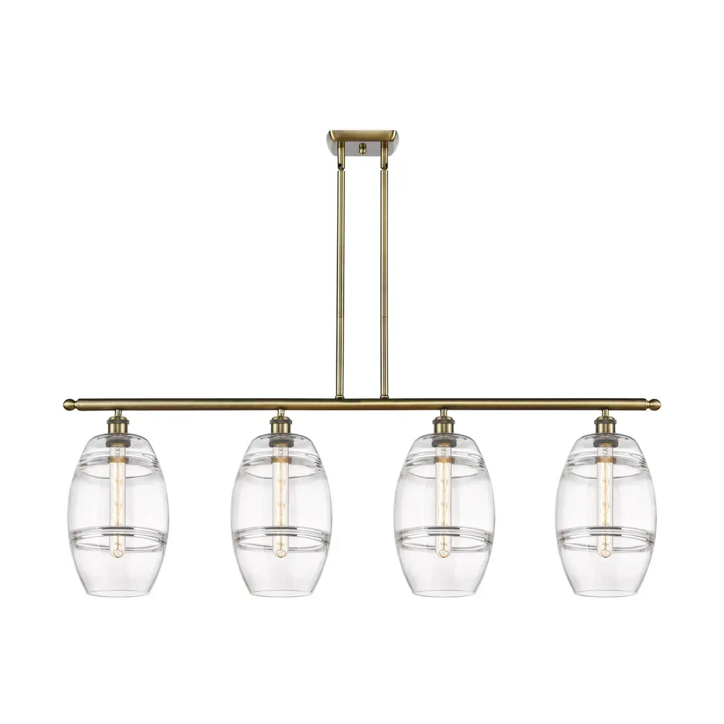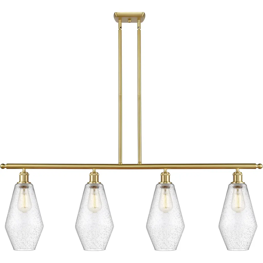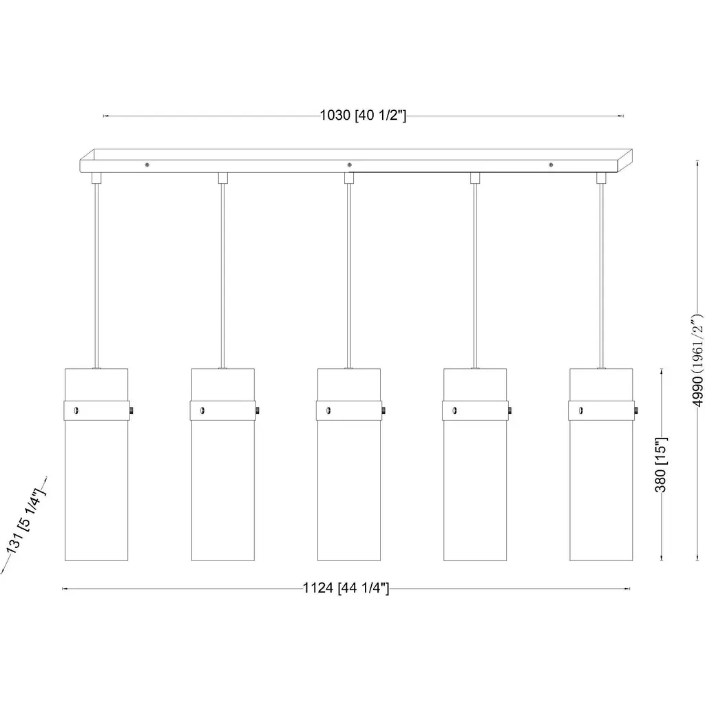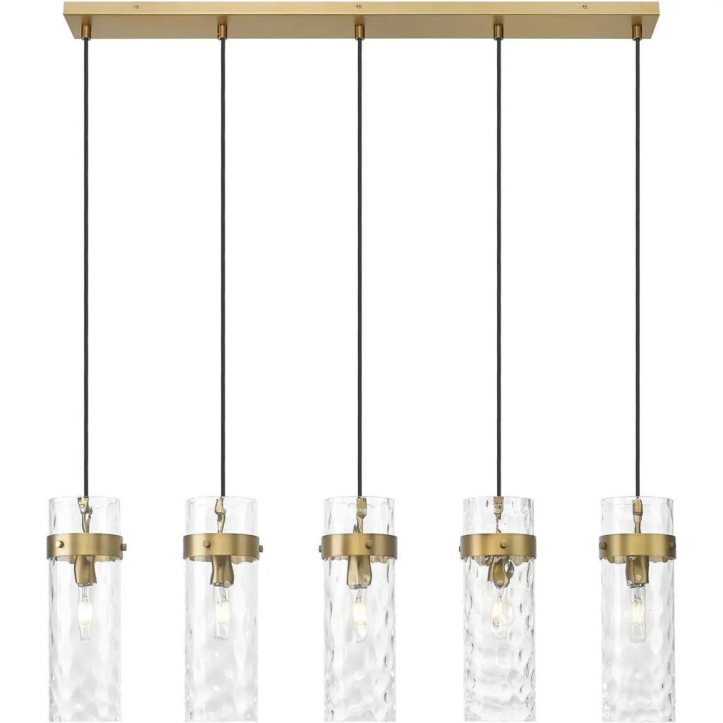 Indulgent in a rubbed brass finish, this modern five-light linear chandelier is a fabulous focal point over a kitchen island or dining table. It's highlighted with cylinders of clear water glass, offering a rippling effect that's sure to enchant. Metal collars add depth and contrast while braided cords are a thoughtful finishing touch.
