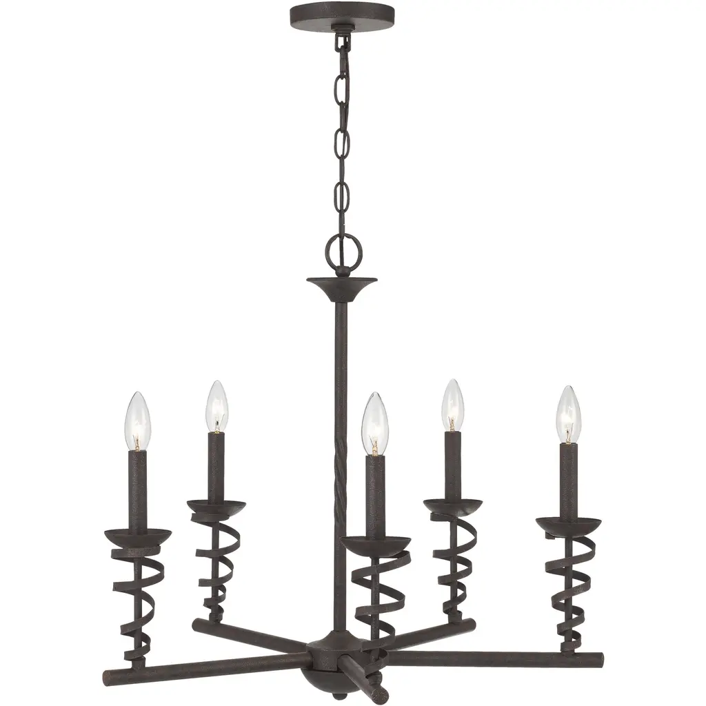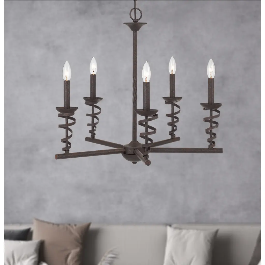 Add a rustic touch to your space with this five light uplight chandelier. It features a textured black finish, spoke wheel frame with cork screw chandeleir sleeve accents. This fixture ships with six feet of chain and matching canopy.