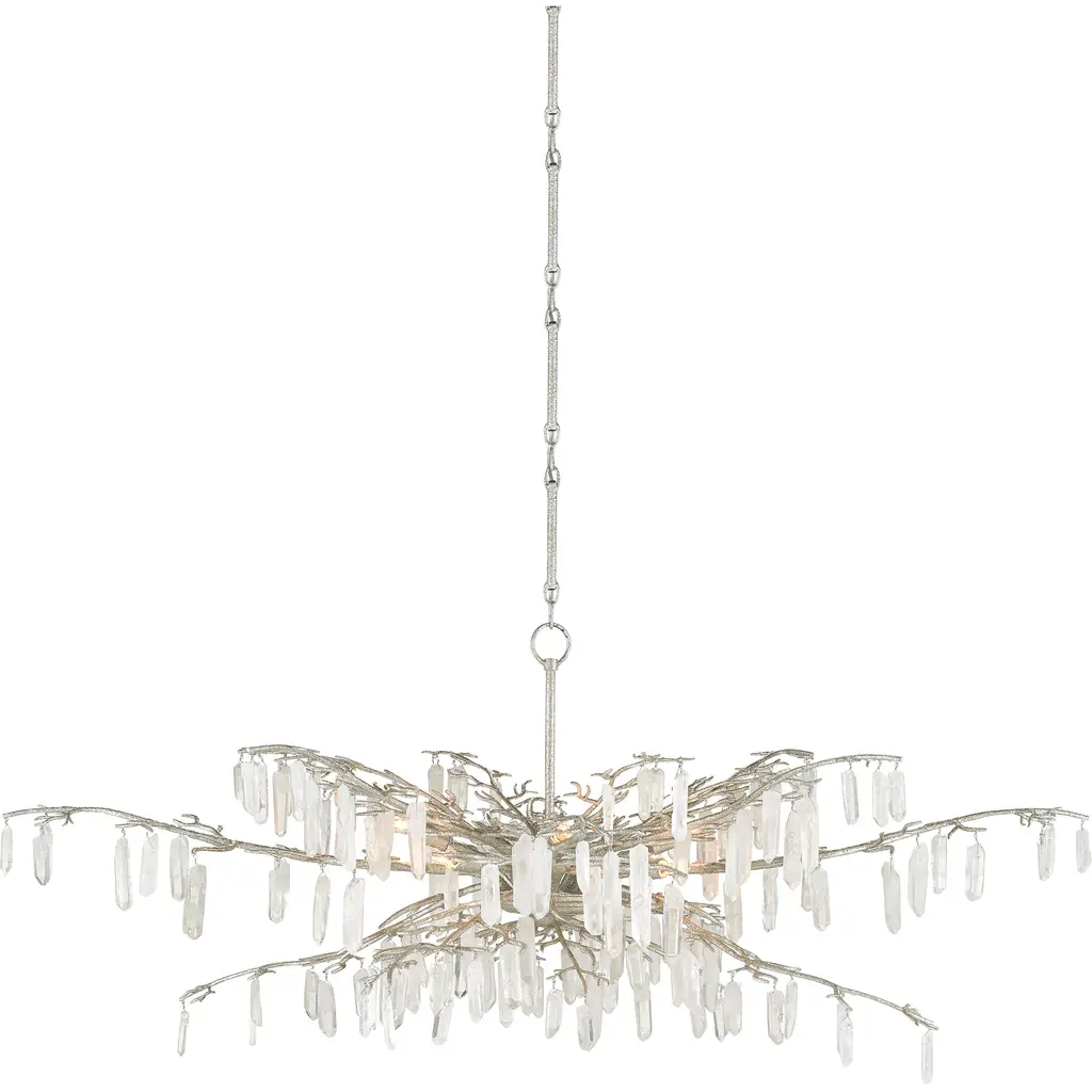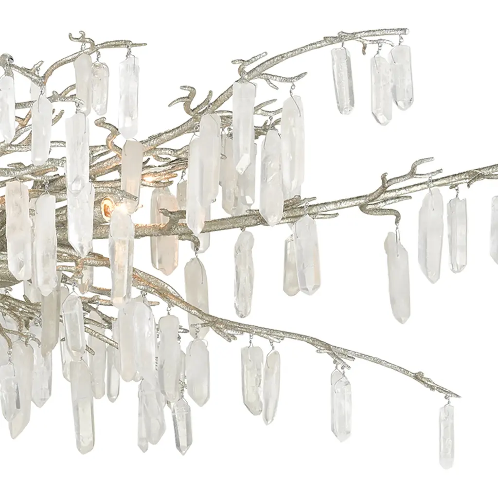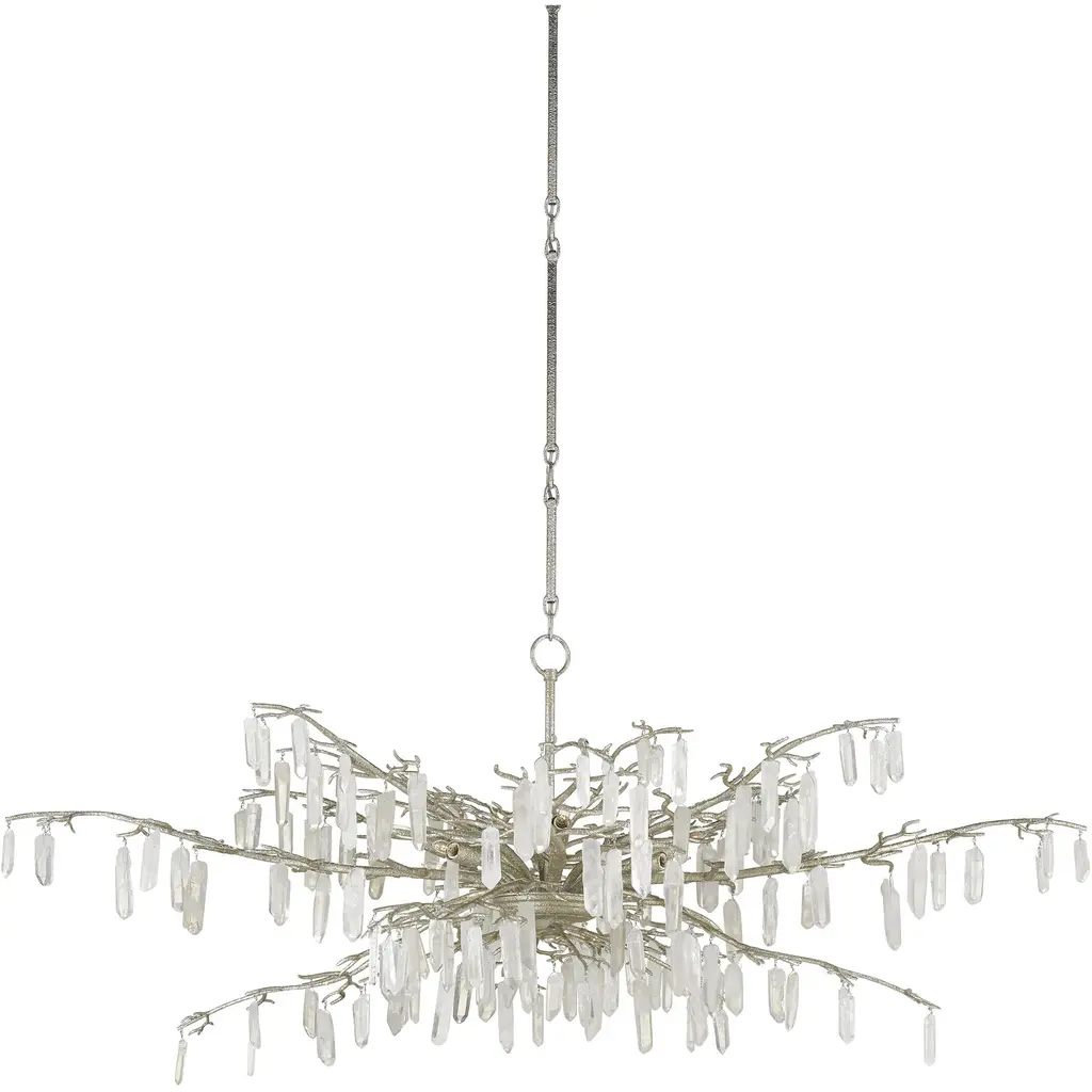The Forest Dawn Silver Chandelier is a truly exceptional work of art dripping with natural crystals. The beautiful textured silver finish is a perfect complement to the quartz, the combination lending this silver chandelier a formal look. This crystal chandelier is in the Aviva Stanoff Collection.