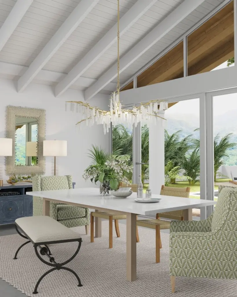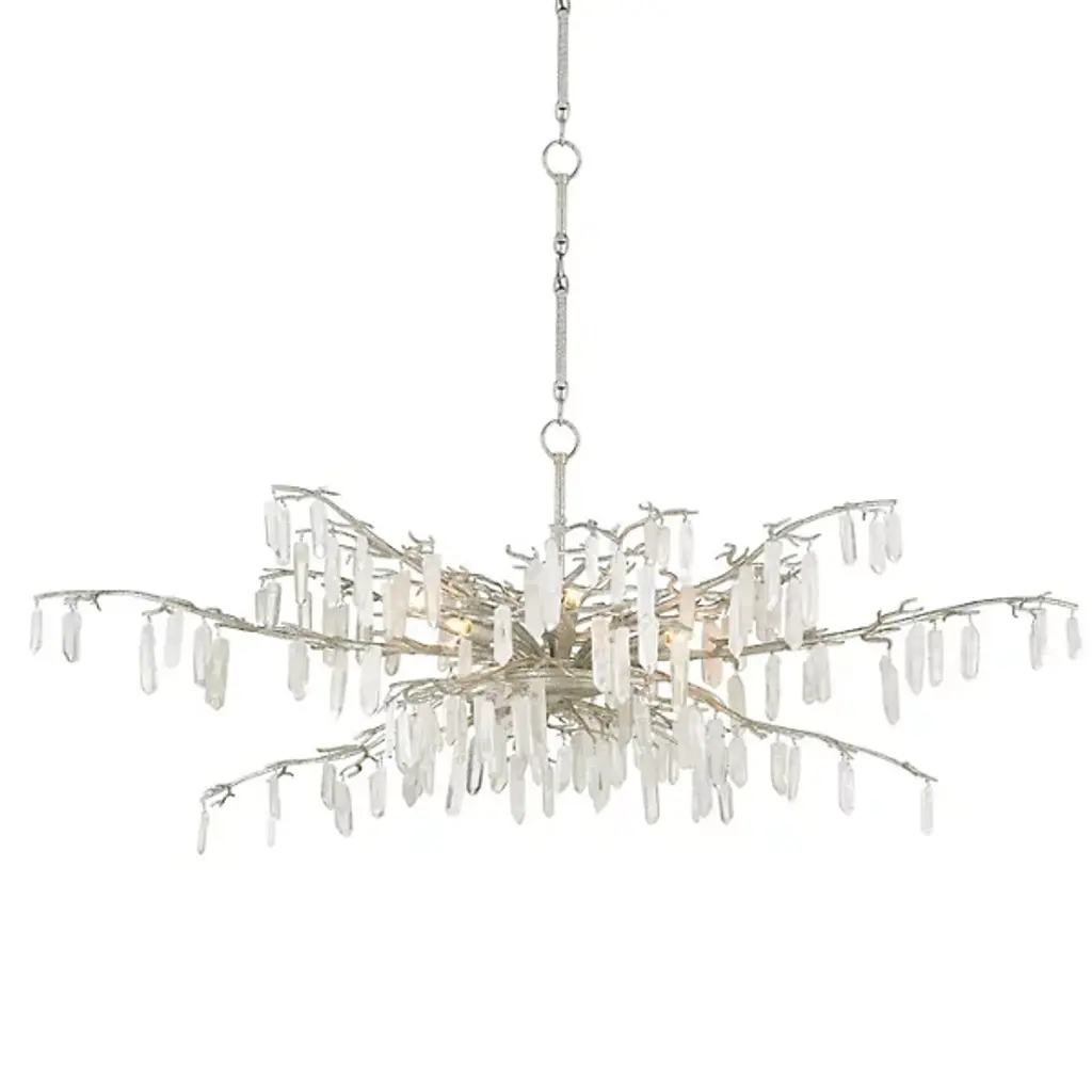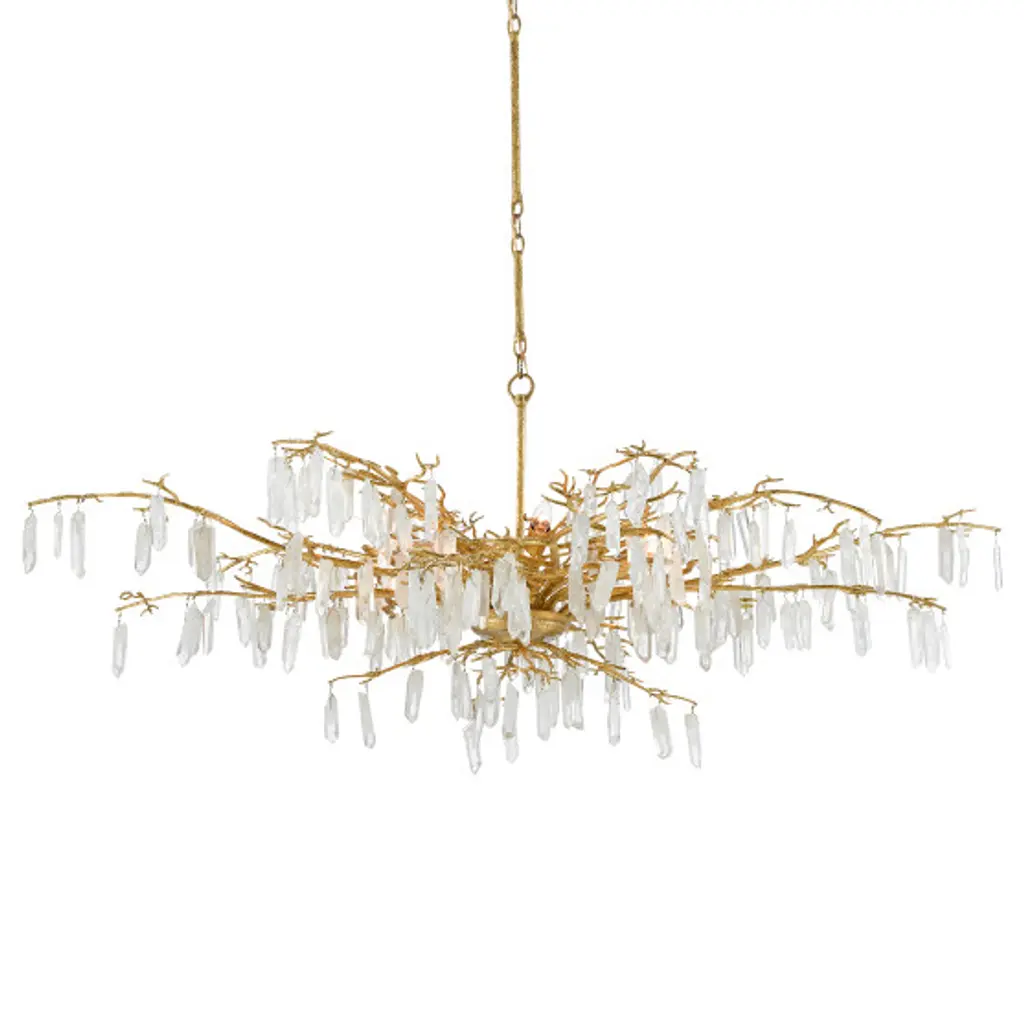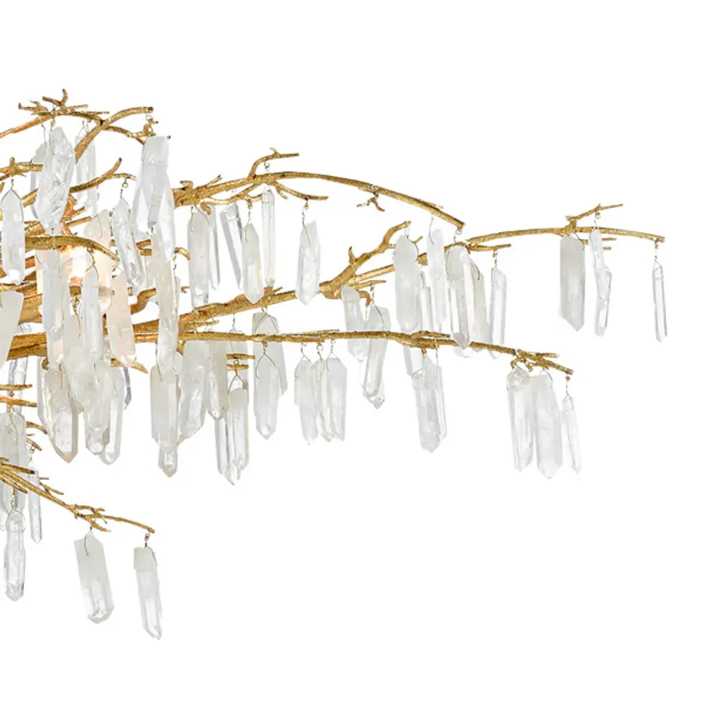 The Forest Dawn Chandelier is a truly exceptional work of art dripping with natural crystals. The beautiful washed Lucerne gold finish is a perfect complement to the quartz, the combination of which lends this gold chandelier a formal look. This crystal chandelier is in the Aviva Stanoff Collection. Adjustable from 35.5" to 71.5" with use of included chain/rod kit/cable.
