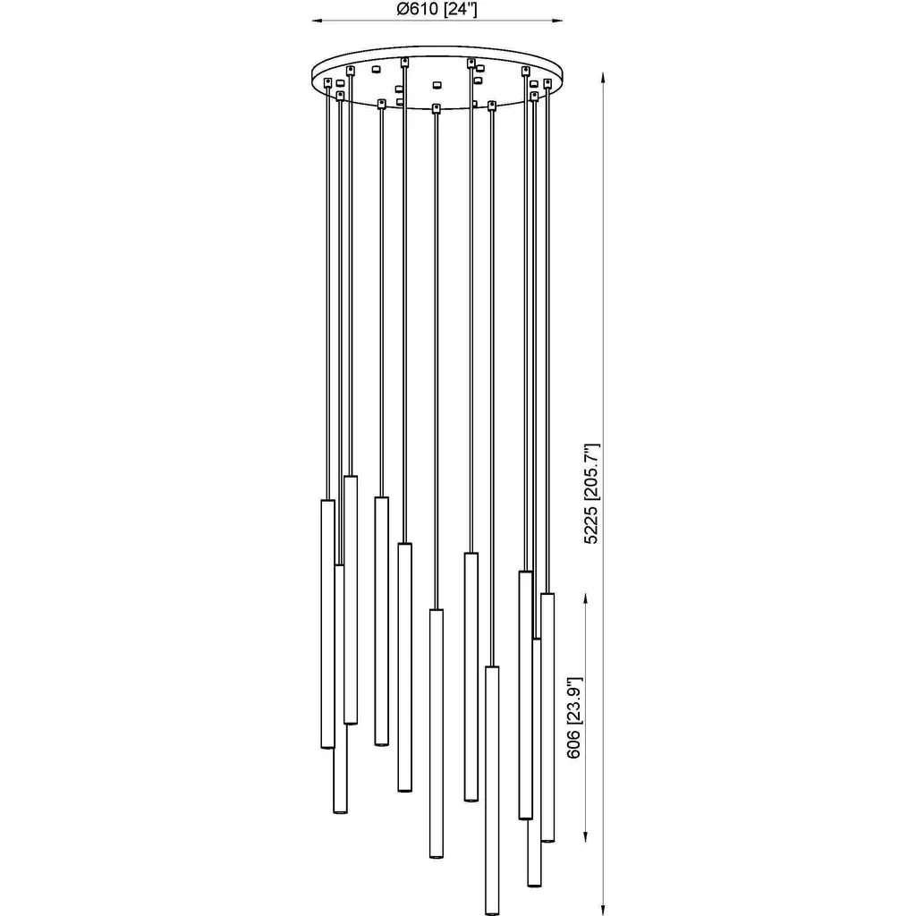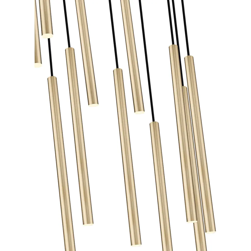 Modern gold finishing creates richness and warm sophistication for this modern 11-light chandelier. Its spiraling fall of staggered lights enchants over a foyer or dining room, with slim light housings and braided black cording. The LEDs are integrated for seamless illumination and are dimmable to create the perfect ambiance for every occasion.