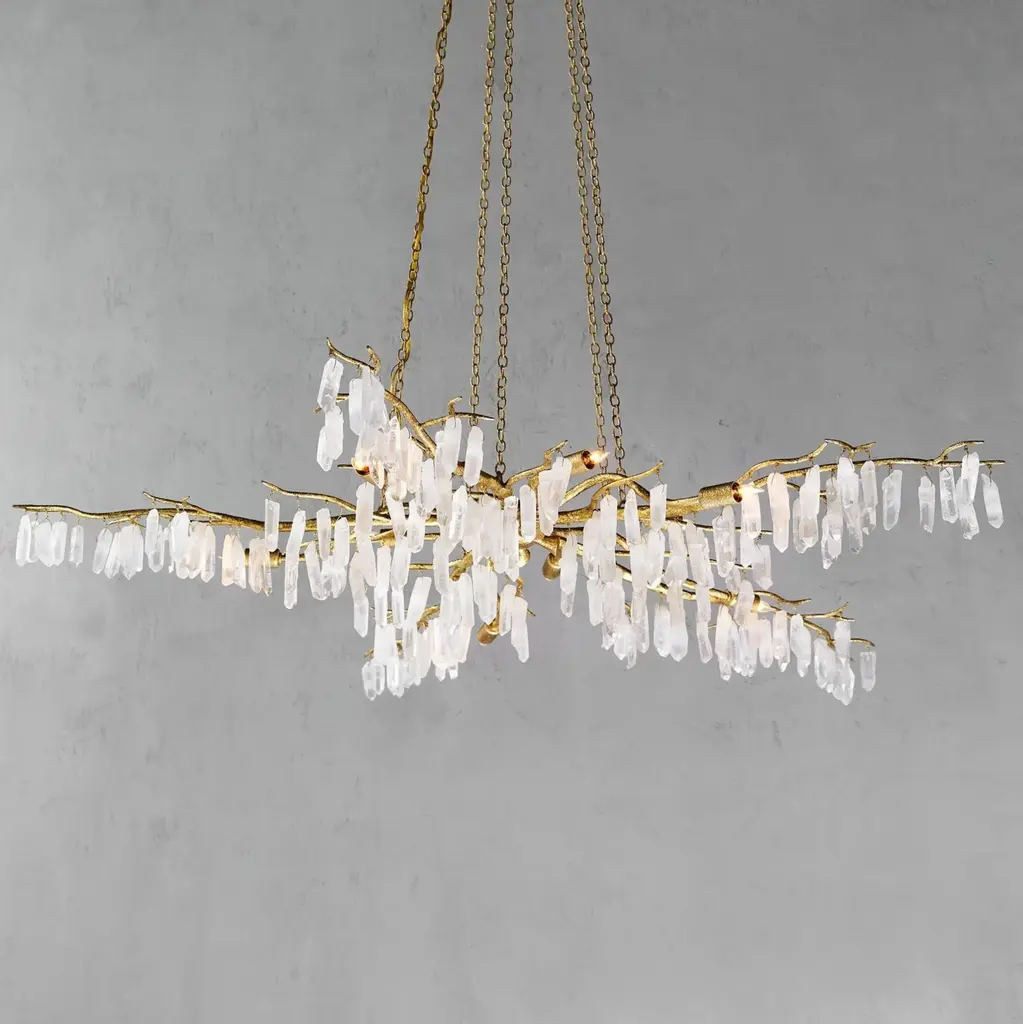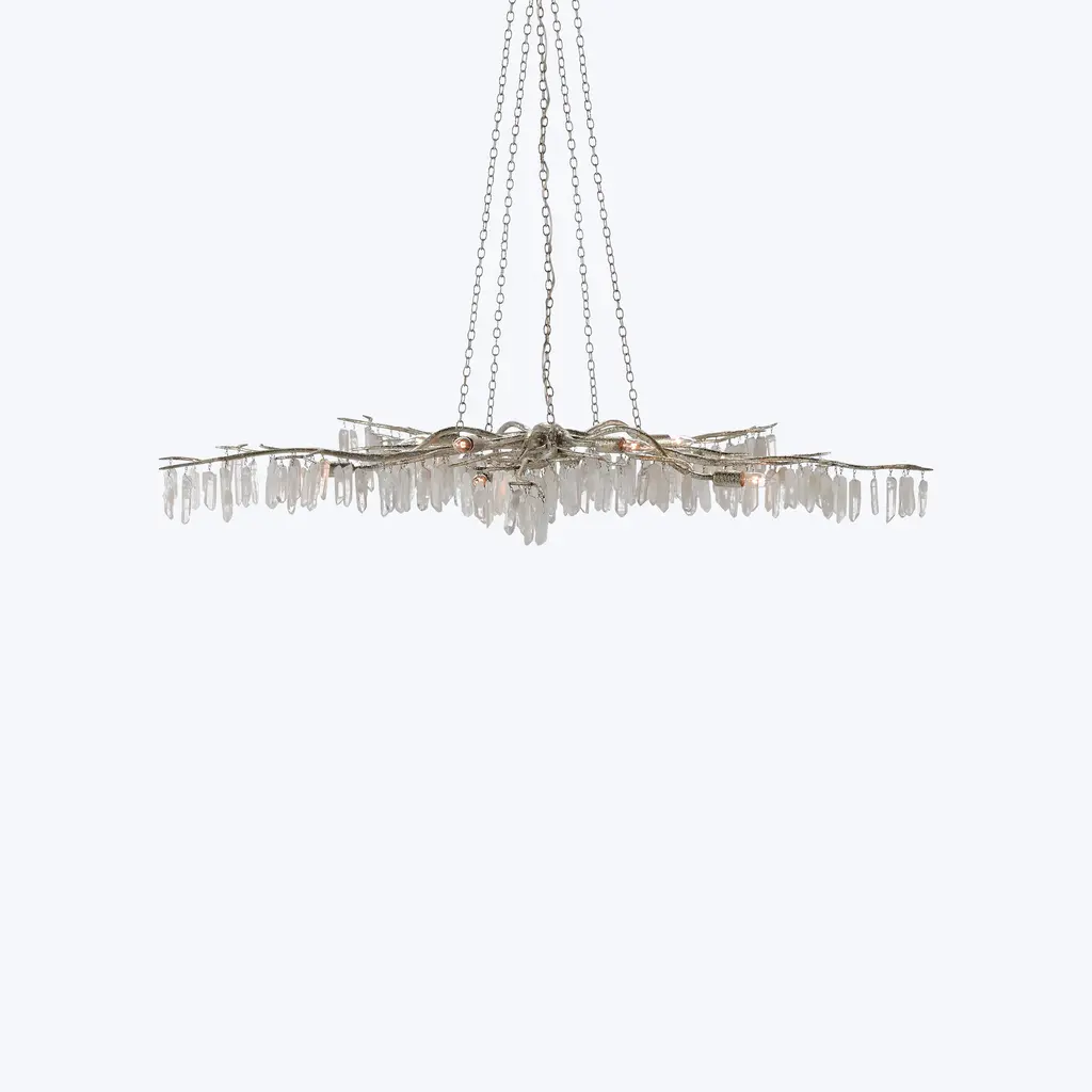 Designed by the ever-enchanting Aviva Stanoff—an imaginative force and longtime creative partner of ABC—this chandelier captures the delicate balance of nature and light. Shimmering quartz crystals, long believed to bring clarity and positive energy, cascade like vines from a sculptural wrought iron frame, creating a piece that feels both grounded and ethereal.