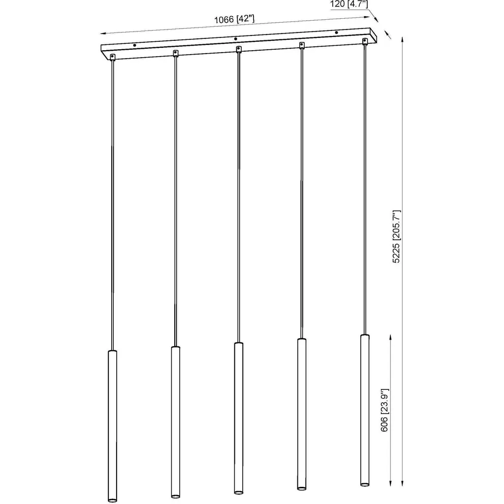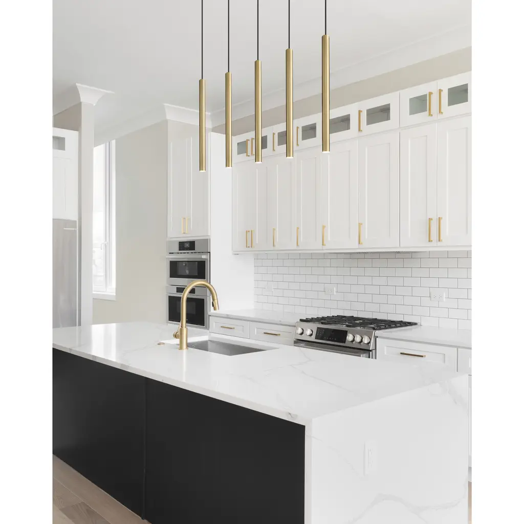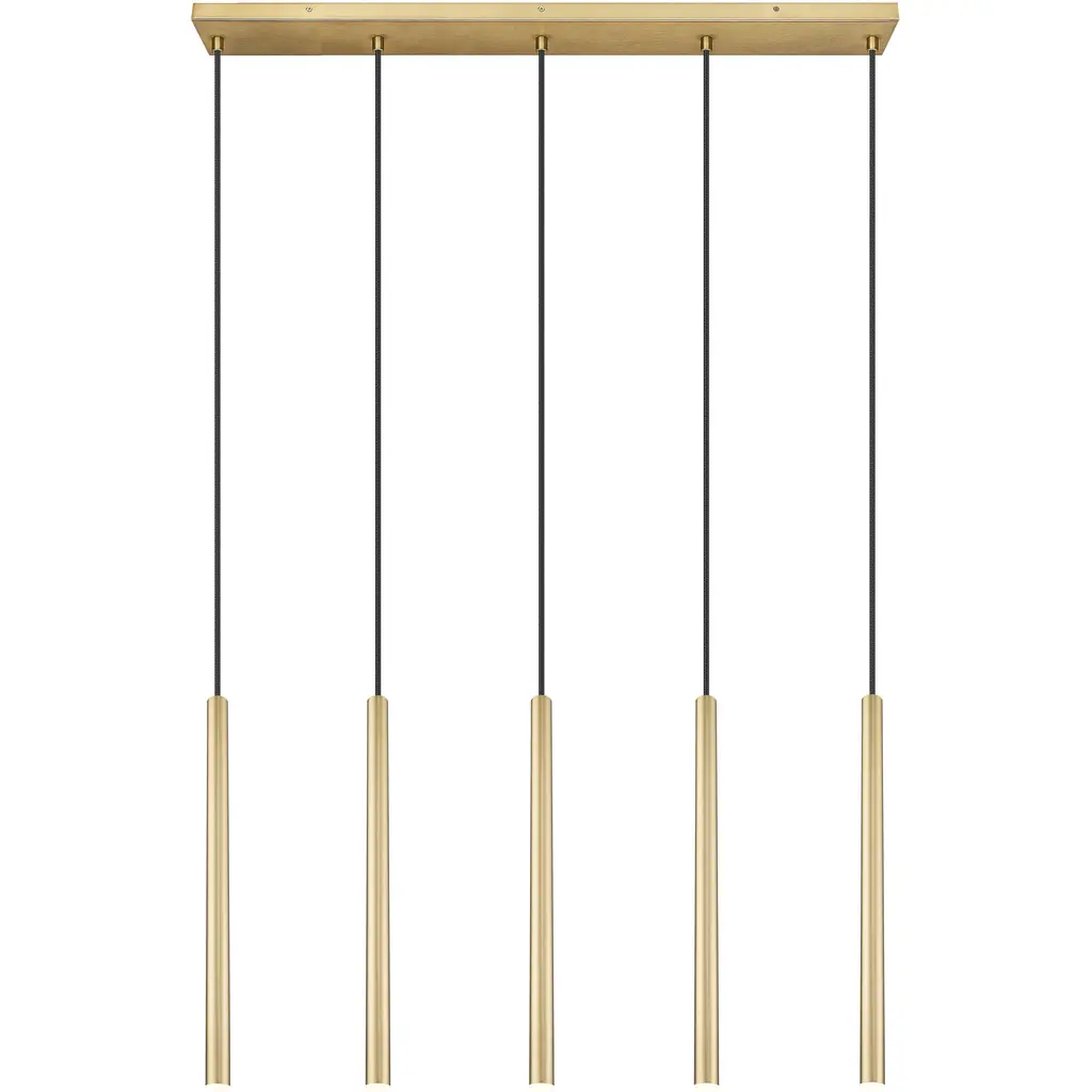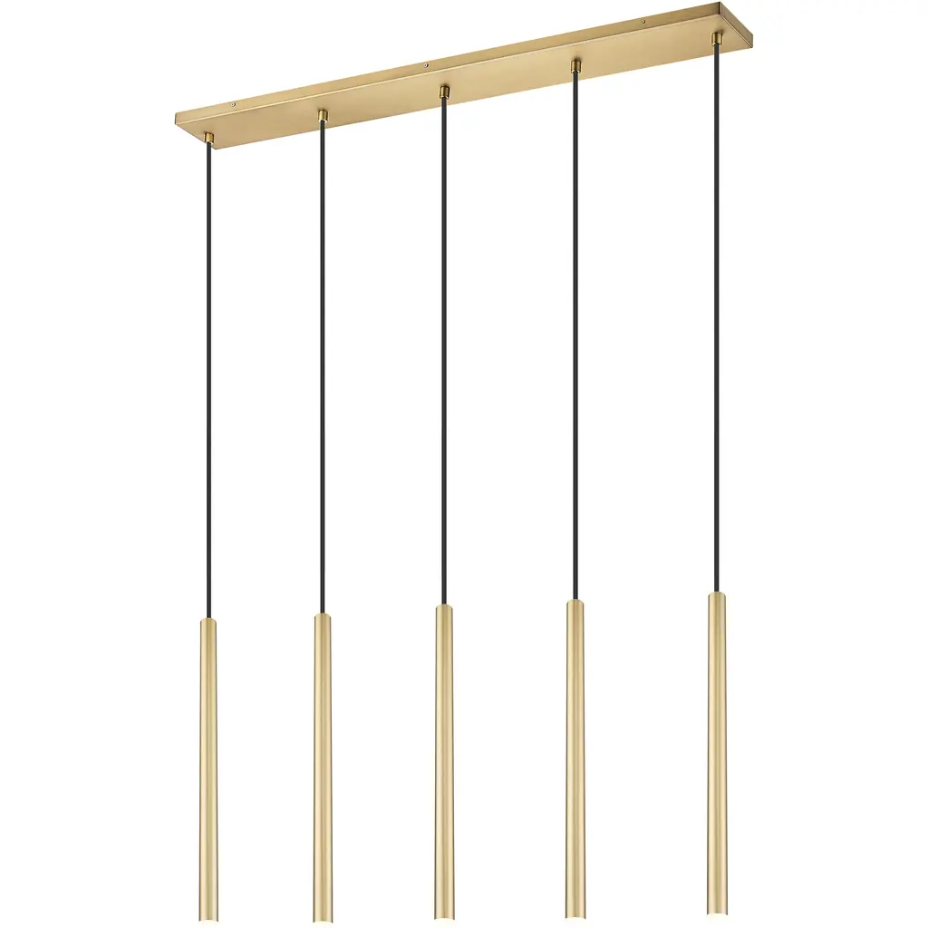 Graceful and energy efficient, this modern five-light linear chandelier features integrated LED lights for excellent illumination. The lights are dimmable for a lovely ambiance, and are housed in long, slim cylinder shades that play up a refined look and feel. A modern gold finish completes the look with sophisticated warmth.