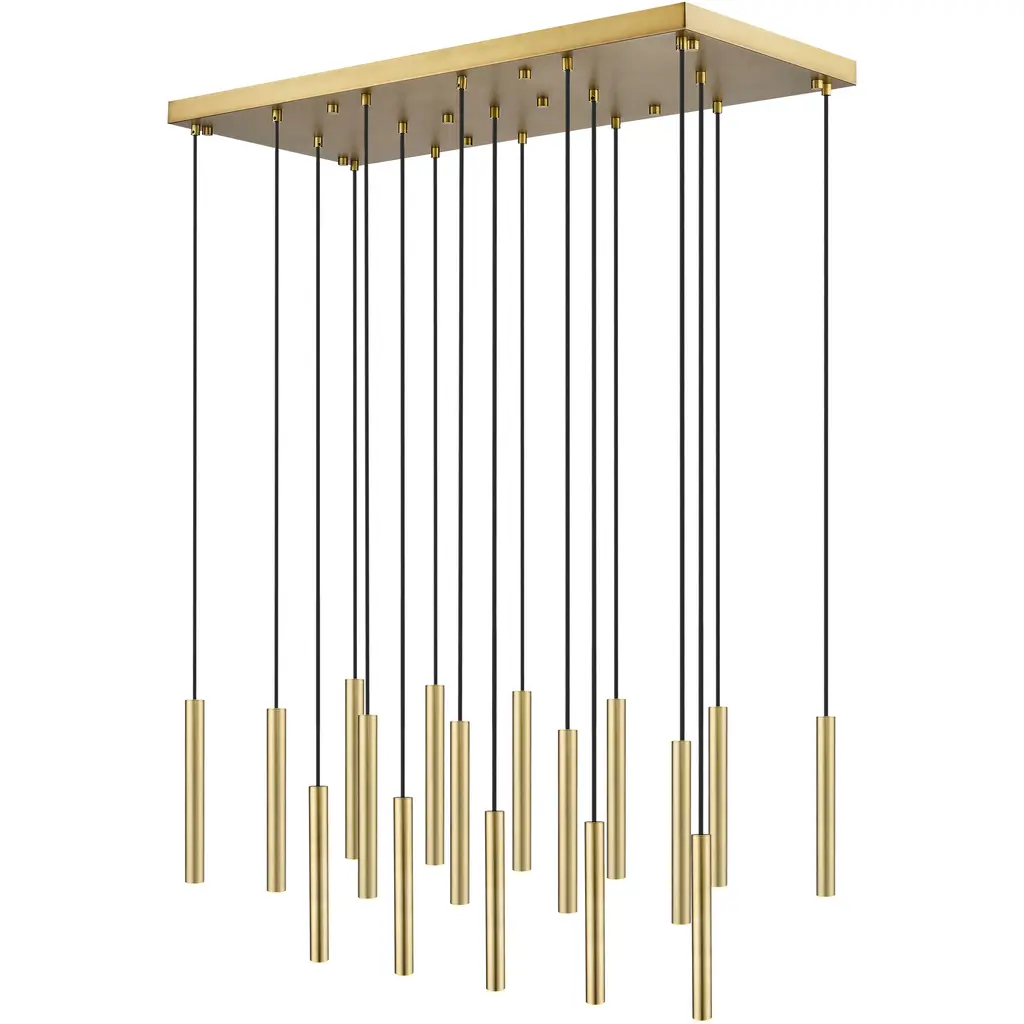 Set a sophisticated ambiance in your foyer or dining room with this modern 17-light chandelier. Its linear structure is anchored with a rectangular canopy, hosting staggered lights with slim housings, all in a rich modern gold finish that casts a warm glow when the fixture is lit. It's both energy efficient and dimmable, perfect for creating ambiance.