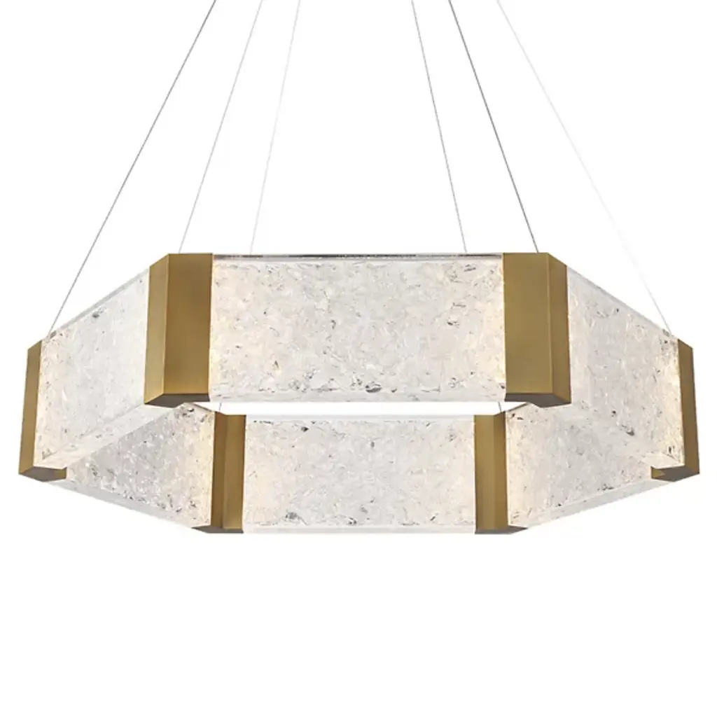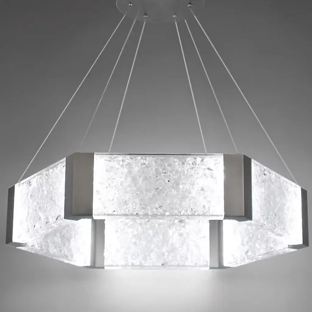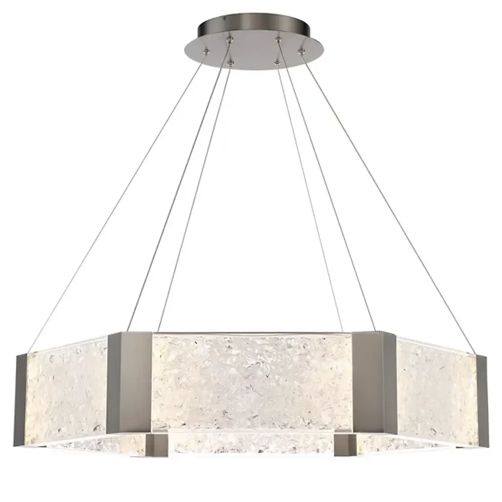 Enliven your living spaces with the Forever LED Chandelier from Modern Forms, a luxurious fixture so fabulous you’ll never want to take it down. A circular metal canopy suspends the piece by sending down several slender cables, while its construction claims center stage. Rectangular panels made from reclaimed K5 crystal are held between angular aluminum brackets over integrated LEDs, easing any direct brightness by transmuting it into an effervescent ambiance from above.