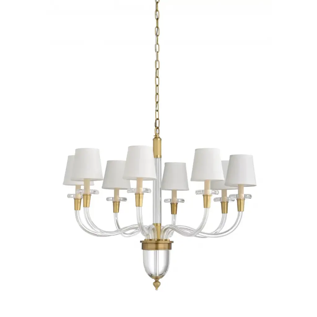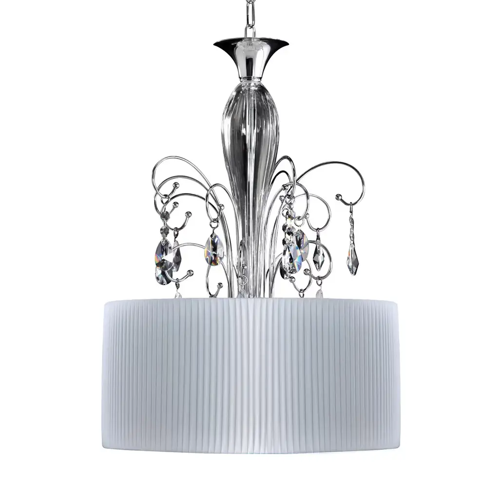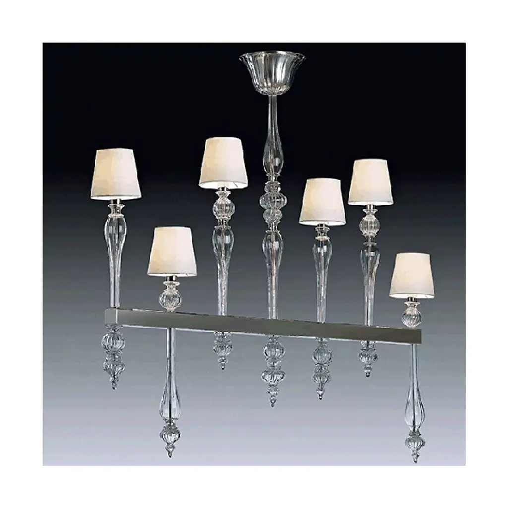 The Fosfato Chandelier by Mazzega 1946 brings a cool, contemporary update to the classic beauty of handworked glass and Venetian-style chandeliers. Created by the designers at Mazzega 1946, this chandelier is suspended by a set of thin cables for an airy look as a sleek, polished, metal ring creates the foundation for this piece. Paired with crisp shades, a collection of beautifully shaped, textured, glass arms pierce the open halo that supports them, each resting at a different height for a truly dynamic look that brings a bright, artful touch to spaces.