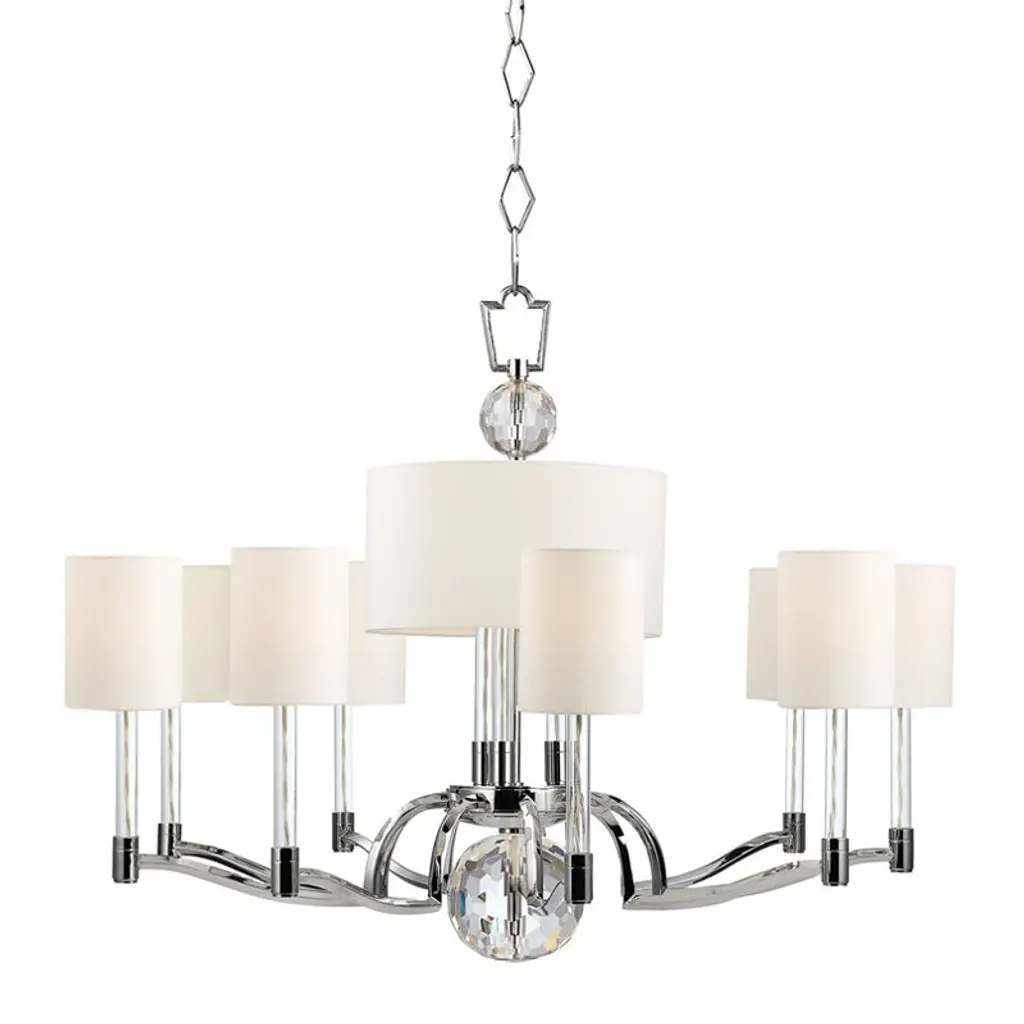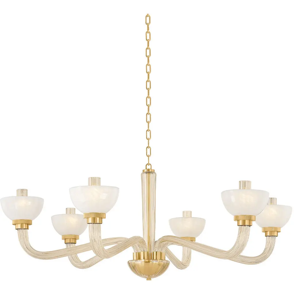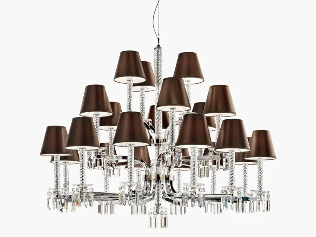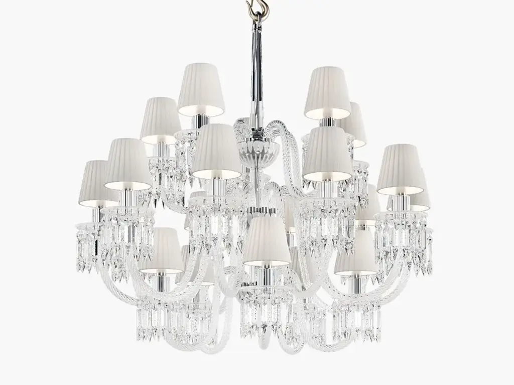 The Fosfato Chandelier by Mazzega 1946 brings a cool, contemporary update to the classic beauty of handworked glass and Venetian-style chandeliers. Created by the designers at Mazzega 1946, this chandelier is suspended by a set of thin cables for an airy look as a sleek, polished, metal ring creates the foundation for this piece. Paired with crisp shades, a collection of beautifully shaped, textured, glass arms pierce the open halo that supports them, each resting at a different height for a truly dynamic look that brings a bright, artful touch to spaces.