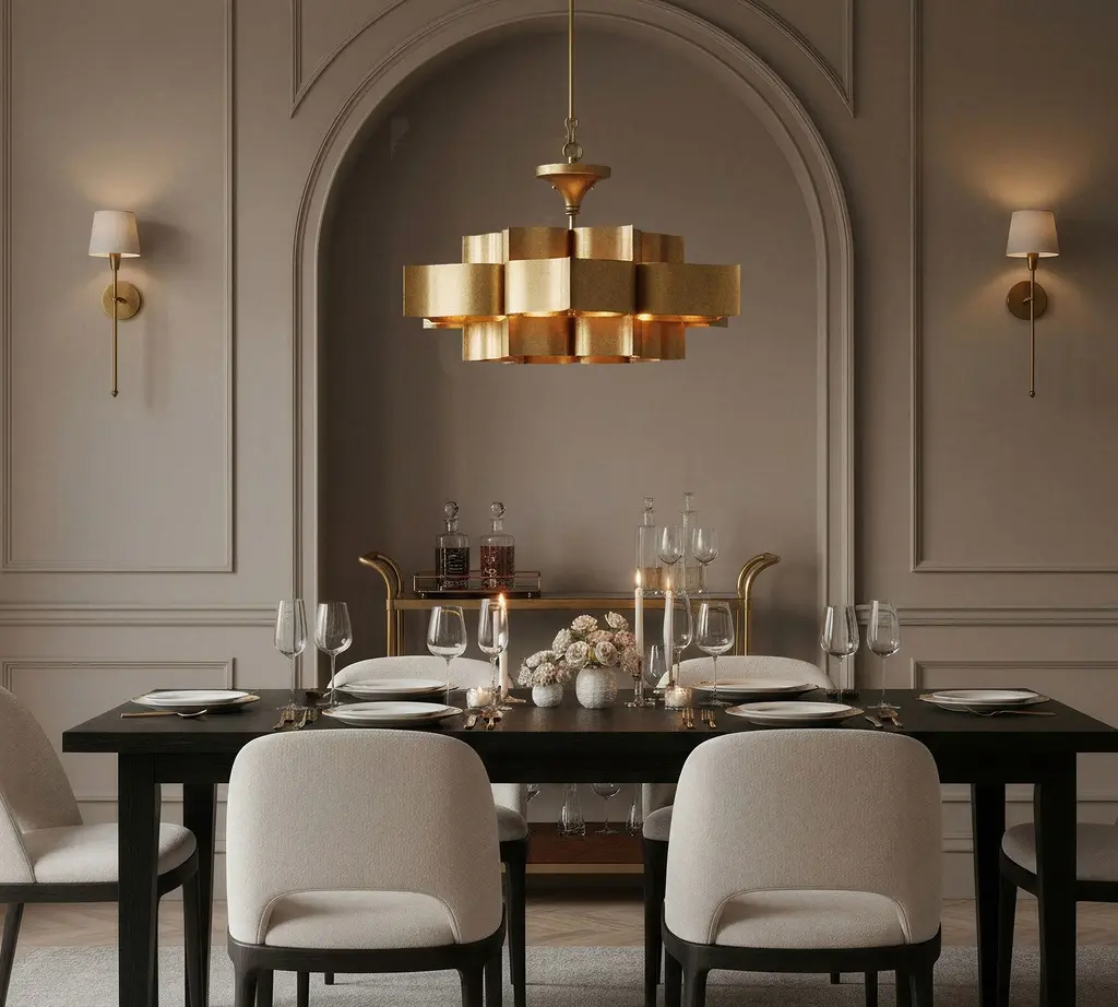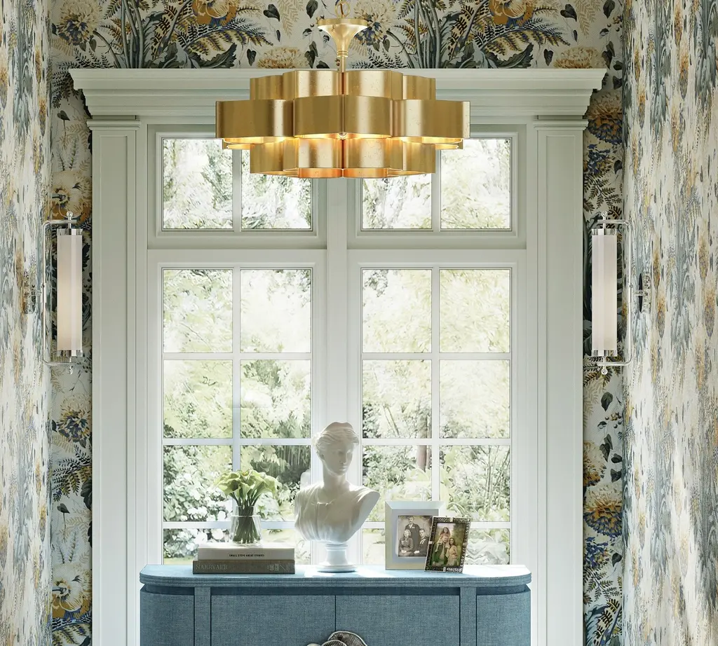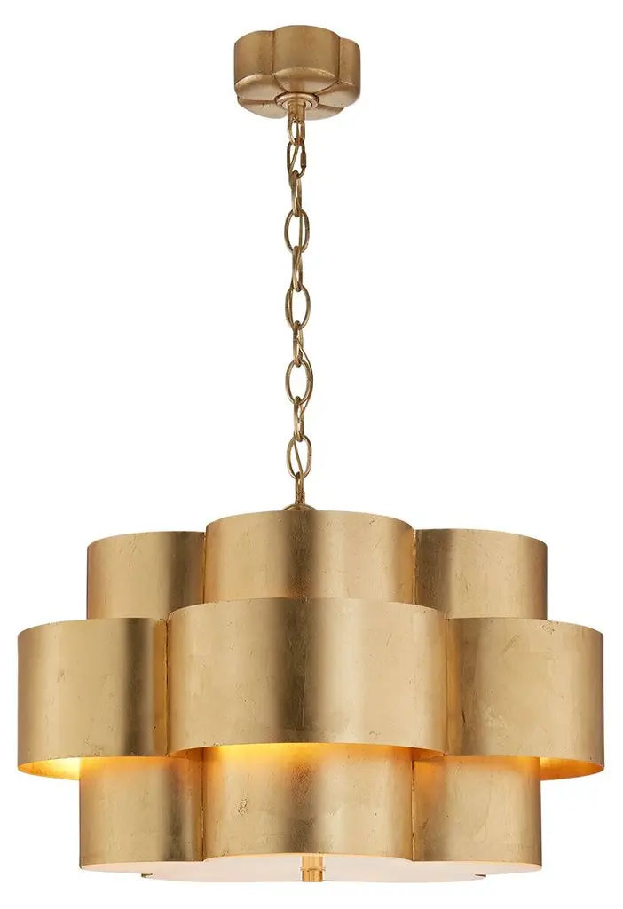 Foundry gets its majestic good looks from a combination of superior workmanship and premium materials. Fashioned from sheets of wrought iron, the chandelier recalls a blooming lotus plant with dramatically curved contours that give the metal a flowing, organic feel. A crisp white exterior plays counterpoint with the gold-leaf interior, creating a stunning statement piece overhead.