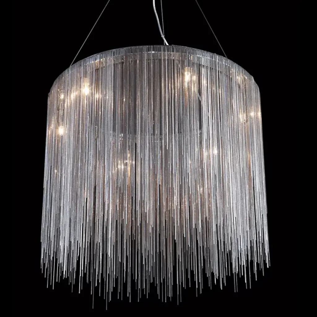 Fashionable fringe. Inspired by the refined look of jewelry, the Fountain Ave. Chandelier by Avenue Lighting instantly adds flair to interiors. Its ring frame dripping in shimmering chains creates a fabulous effect as warm white light from the LED bulbs, which are housed within the integrated board, shines through. A spectacular sight as it illuminates a dining table, seating area or foyer, this contemporary ceiling fixture is suspended from a circular canopy with slender cables.