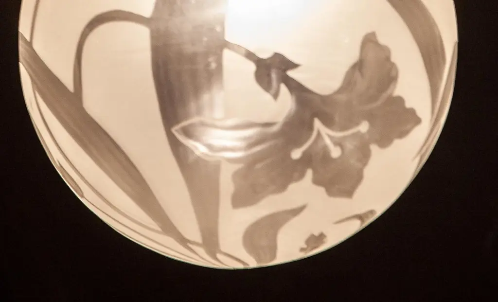 Finely hand blown engraved glass with stylized flowers an leaves in excellent vintage condition.One E 27 light bulb 5 Watt..