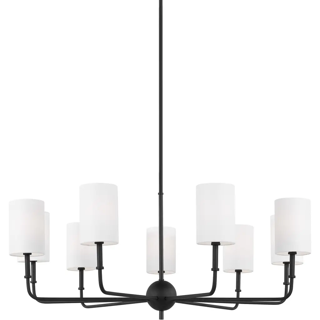 The Foxdale nine light single tier chandelier in Midnight Black encompasses the new traditional style with flawless execution. Refined and clean-lined, this classic silhouette is timeless without being stuffy. Perfectly transitional, this collection can be placed in any home regardless of style. Topped with White Linen Shades to complete the design.