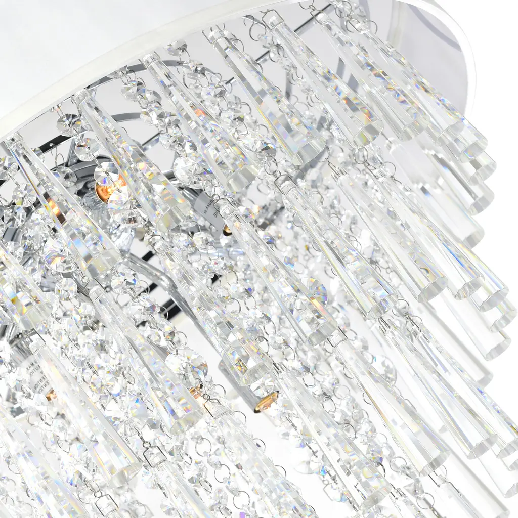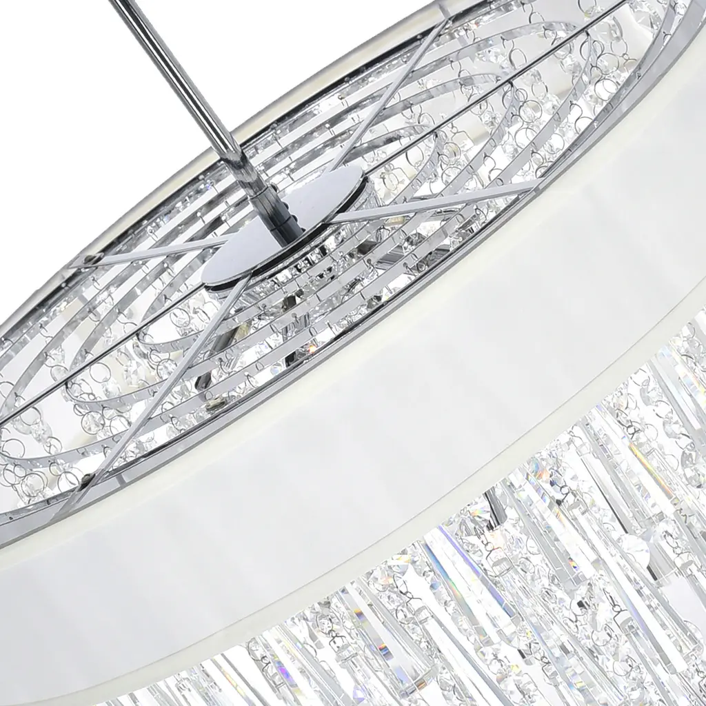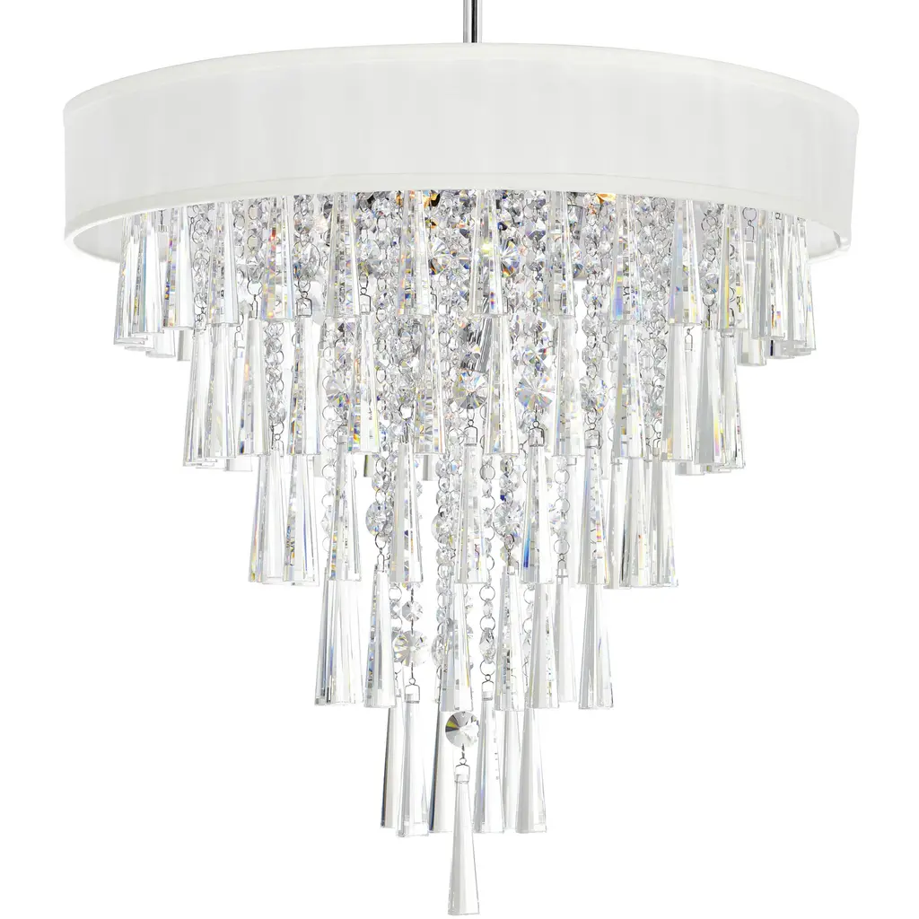 Elevate the ambiance of your space with the Franca 22'' 8 Light Drum Shade Chandeliera dazzling fusion of glamour and contemporary elegance. This luxurious ceiling light features a sophisticated fabric drum shade in off white color, encasing layers of crystal-clear glass droplets that reflect light beautifully. Supported by a sleek chrome-finished rod and canopy, this chandelier adds refined drama to dining rooms, bedrooms, or living spaces. Compatible with G9 LED bulbs, this fixture offers energy-efficient lighting wrapped in exquisite style. Finish: Chrome Shade: Off-White Light Count: 8 Light Source: G9 LED Compatible (Bulbs Not Included) Adjustable Hanging Height: Yes Material: Metal, Fabric, Crystal Style: Glam / Modern / Transitional