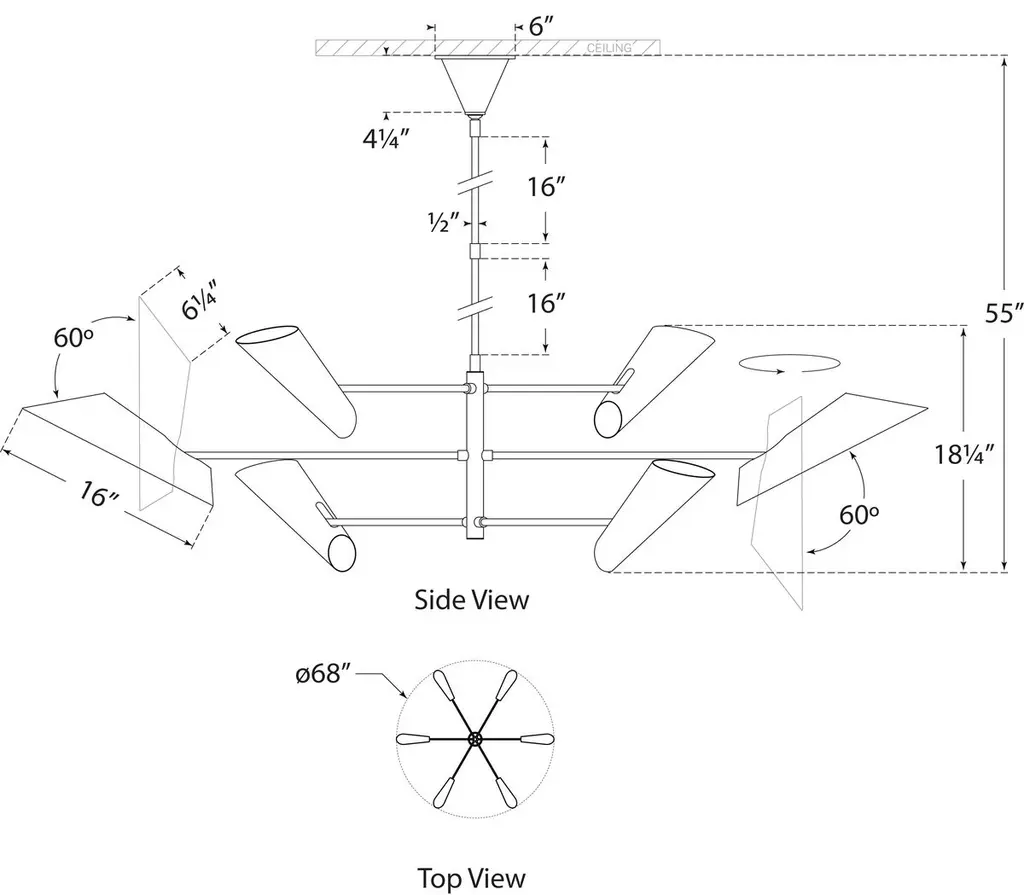 Modern refinement at its best, this chandelier is crafted of brass with a sleek, streamlined body and six pivoting retro-style shades. The contrast of the black shades against the gleaming brass ensures that this fixture will be a striking focal point in a room.