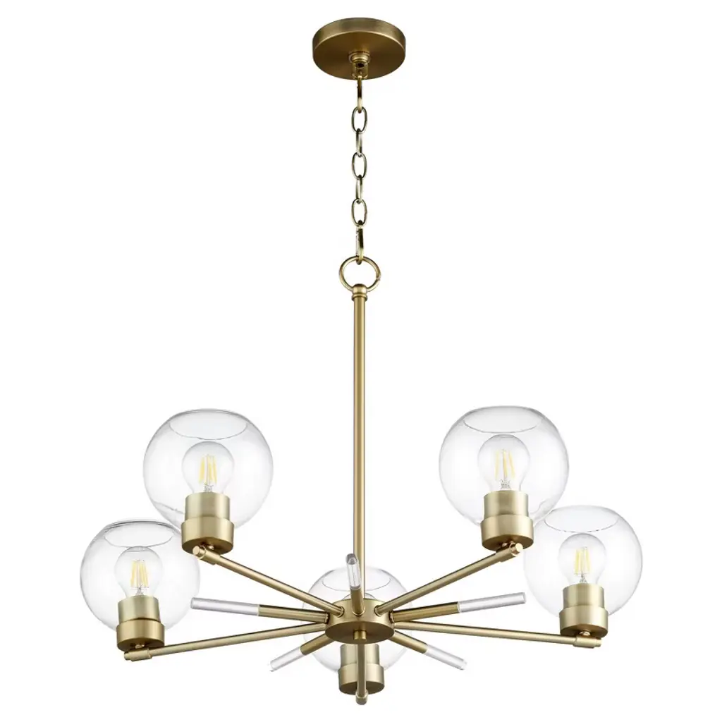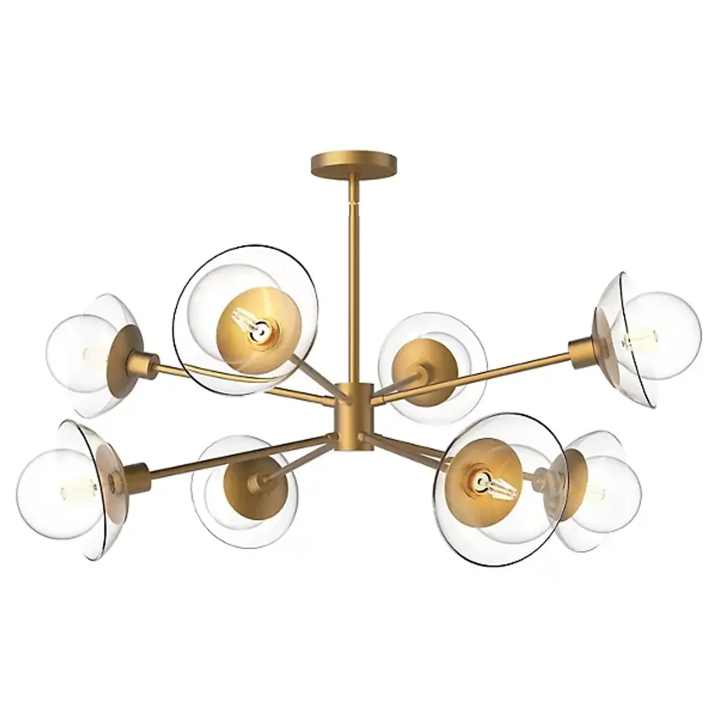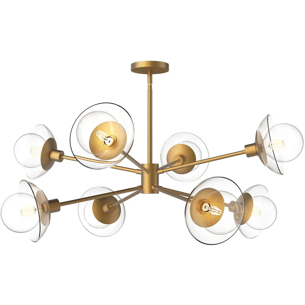 As lovely as can be. Composed like a beautiful bunch of flowers, the Francesca Chandelier from Alora Mood gets the eyes traveling with rays of charming shapes and rich light. The chandelier’s dynamic composition and bold finish reference mid-century modern design’s iconic sputnik. It faces in every direction with a bursting composition of slender arms. Metal discs and bowl-shaped glass shades cap off the discs in smooth, subtle curves. The addition of globe-shaped bulbs creates a bright, reflective, and delightful bubble effect. The sculptural composition of the bulbs translates to a surrounding aura of lively illumination.