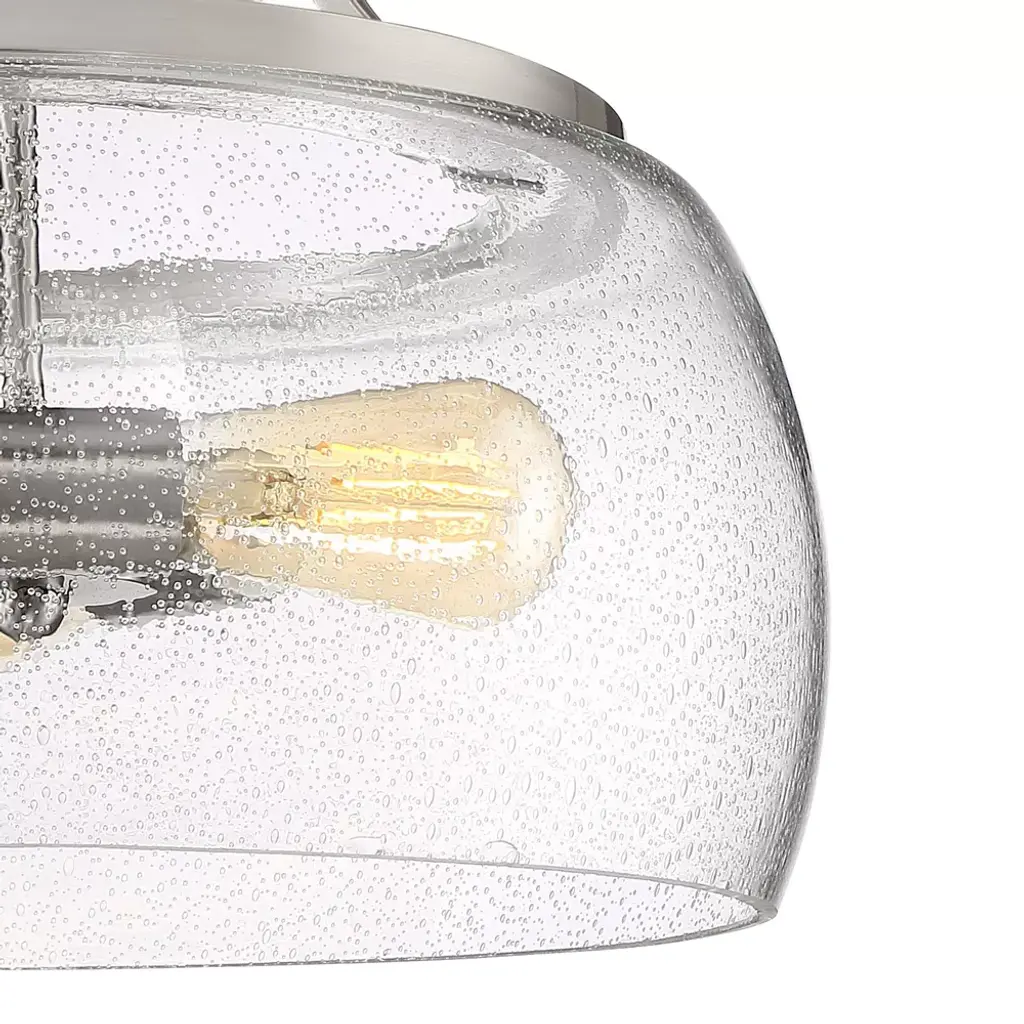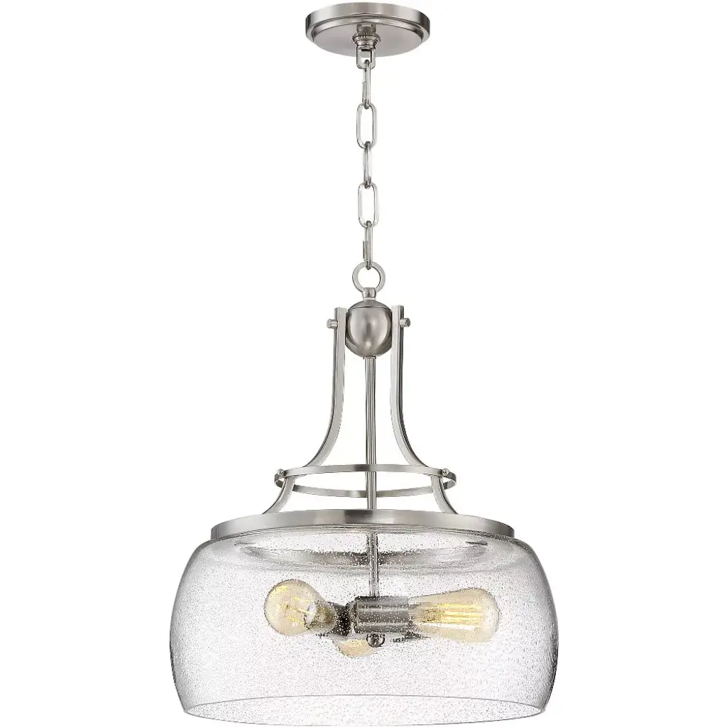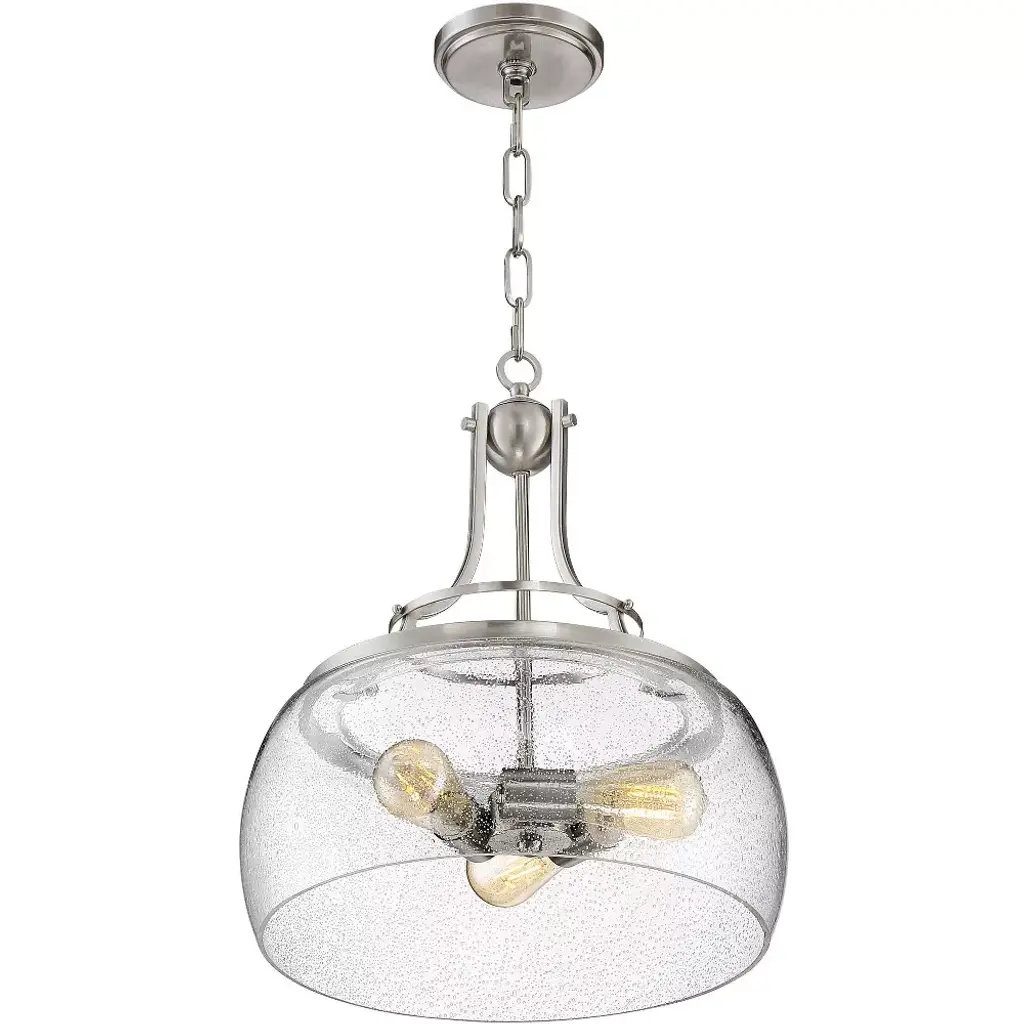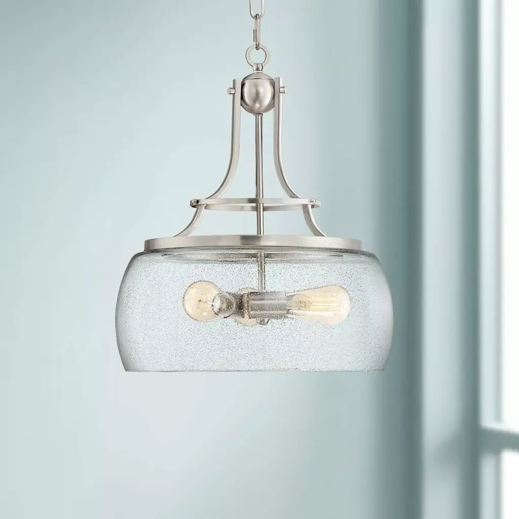 Add a vintage flair to your home with this rustic farmhouse pendant light. This Franklin Iron Works design offers a modern interpretation of a classic urban-industrial style. It comes in a satin nickel finish and features a prominent round seedy glass shade. As an added bonus, this three-light pendant light comes with compatible energy-efficient LED light bulbs in a classic Edison style that are sure to add a nostalgic glow.